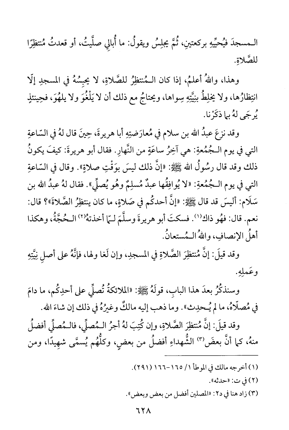 وسنذكُرُ بعدَ هذا البابِ، قولَهُ - صلى الله عليه وسلم -: "الملائكةُ تُصلِّي على أحدِكُم، ما دامَ في مُصلّاهُ، ما لم يُحدِث". وما ذهب إليه مالكٌ وغيرُهُ في ذلك إن شاءَ الله.