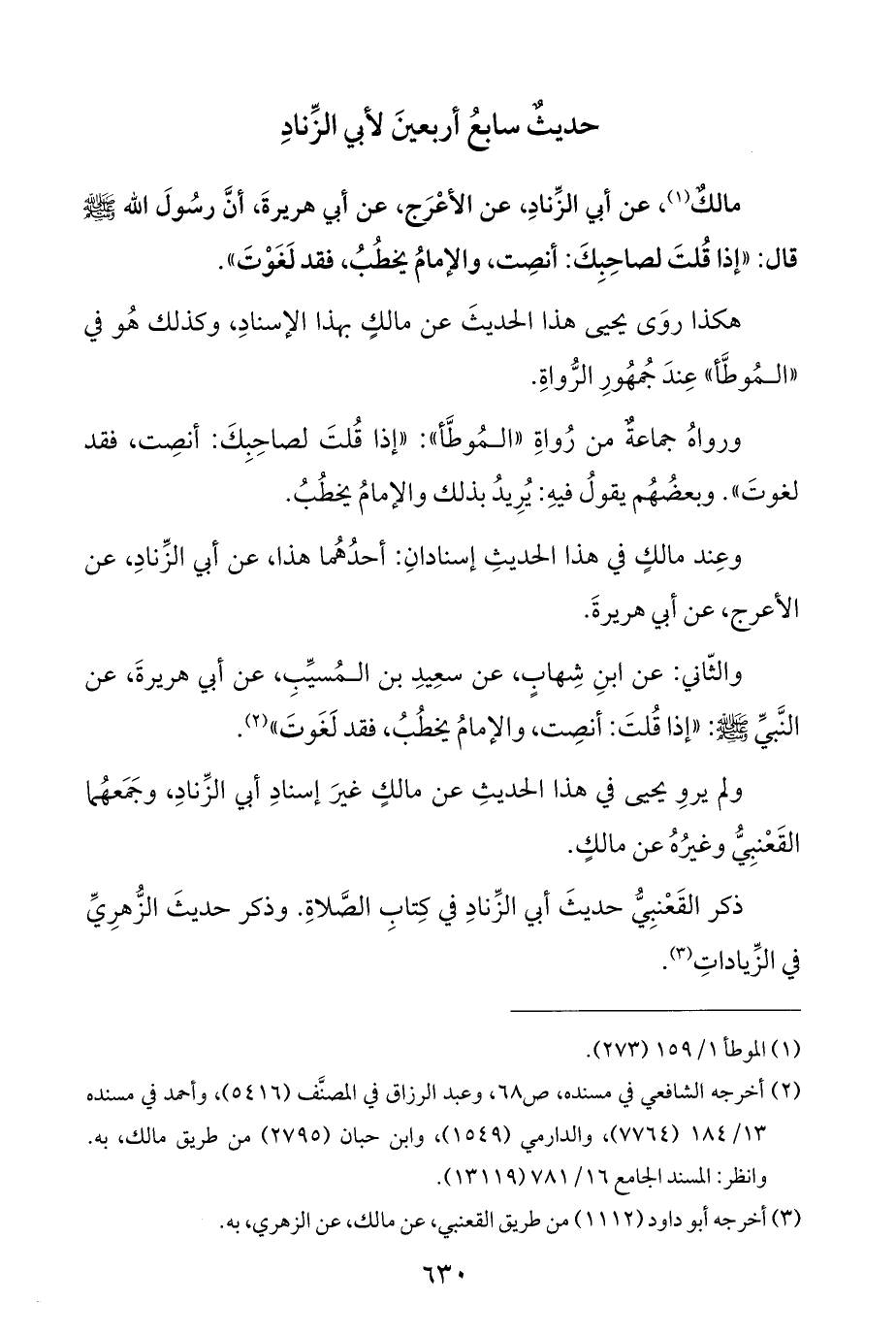 مالكٌ (¬١)، عن أبي الزِّنادِ، عن الأعْرَج، عن أبي هريرةَ، أنَّ رسُولَ الله - صلى الله عليه وسلم - قال: "إذا قُلتَ لصاحِبِكَ: أنصِت، والإمامُ يخطُبُ، فقد لَغَوْتَ".