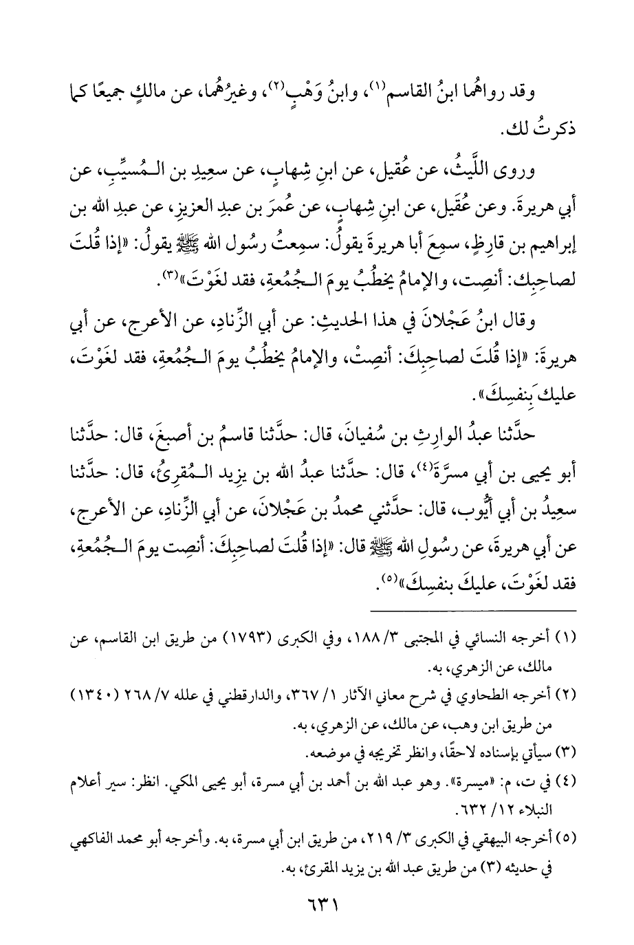 حدَّثنا عبدُ الوارِثِ بن سُفيانَ، قال: حدَّثنا قاسمُ بن أصبغَ، قال: حدَّثنا أبو يحيى بن أبي مسرَّةَ (¬٤)، قال: حدَّثنا عبدُ الله بن يزِيد المُقرِئُ، قال: حدَّثنا سعِيدُ بن أبي أيُّوب، قال: حدَّثني محمدُ بن عَجْلانَ، عن أبي الزِّنادِ، عن الأعرج، عن أبي هريرةَ، عن رسولِ الله - صلى الله عليه وسلم - قال: "إذا قُلتَ لصاحِبِكَ: أنصِت يومَ الجُمُعةِ، فقد لغَوْتَ، عليكَ بنفسِكَ" (¬٥).