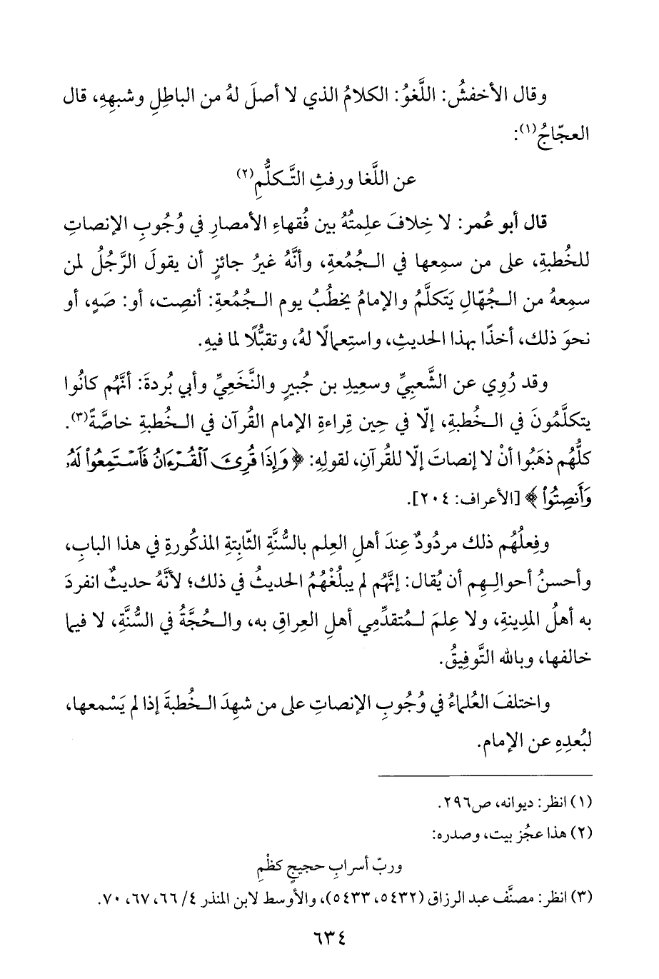 وقد رُوِي عن الشَّعبِيِّ وسعِيدِ بن جُبيرٍ والنَّخَعِيِّ وأبي بُردةَ: أنَّهُم كانُوا يتكلَّمُونَ في الخُطبةِ، إلّا في حِين قِراءةِ الإمام القُرآن في الخُطبةِ خاصَّة (¬٣). كلُّهُم ذهَبُوا أنْ لا إنصاتَ إلّا للقُرآنِ، لقولِهِ: {وَإِذَا قُرِئَ الْقُرْآنُ فَاسْتَمِعُوا لَهُ وَأَنْصِتُوا} [الأعراف: ٢٠٤].