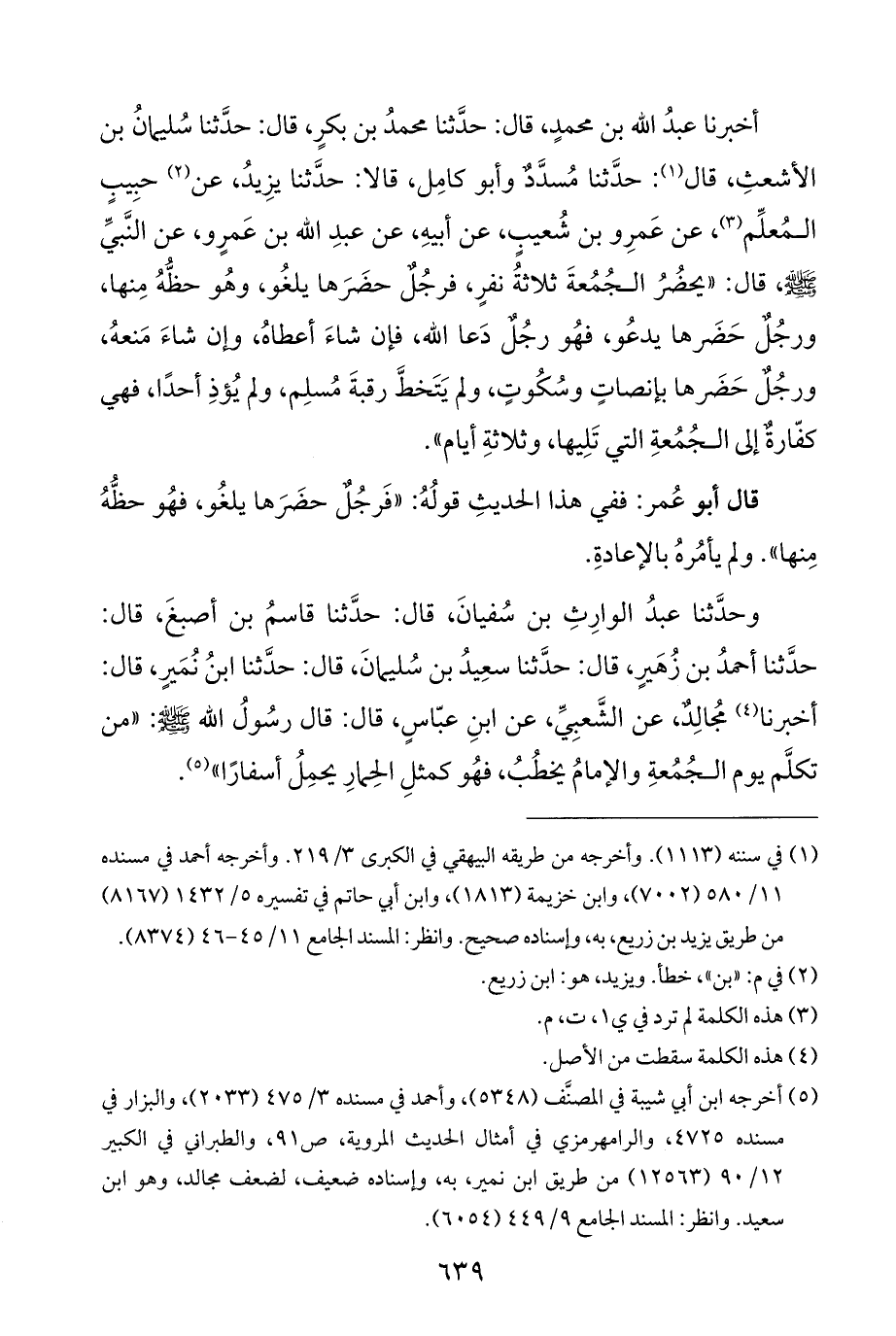 وحدَّثنا عبدُ الوارِثِ بن سُفيانَ، قال: حدَّثنا قاسمُ بن أصبغَ، قال: حدَّثنا أحمدُ بن زُهَيرٍ، قال: حدَّثنا سعِيدُ بن سُليمانَ، قال: حدَّثنا ابنُ نُمَيرٍ، قال: أخبرنا (¬٤) مُجالِدٌ، عن الشَّعبِيِّ، عن ابنِ عبّاسٍ، قال: قال رسُولُ الله - صلى الله عليه وسلم -: "من تكلَّم يوم الجُمُعةِ والإمامُ يخطُبُ، فهُو كمثلِ الحِمارِ يحمِلُ أسفارًا" (¬٥).