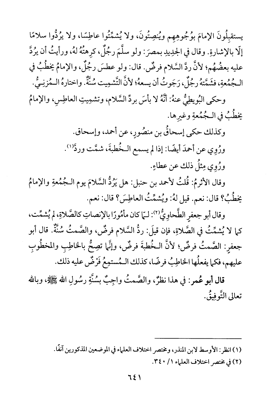 يستقبِلُونَ الإمامَ بوُجُوهِهِم ويُنصِتُونَ، ولا يُشمِّتُوا عاطِسًا، ولا يرُدُّوا سلامًا إلّا بالإشارةِ. وقال في الجدِيدِ بمصرَ: ولو سلَّمَ رجُلٌ، كرِهتُهُ لهُ، ورأيتُ أن يرُدَّ عليه بعضُهُم؛ لأنَّ ردَّ السَّلام فرضٌ. قال: ولو عطسَ رجُلٌ، والإمامُ يخطُبُ في الجُمُعةِ، فشَمَّتهُ رجُلٌ، رَجَوتُ أن يسعهُ؛ لأنَّ التَّشمِيت سُنَّةٌ. واختارهُ المُزنِيُّ.