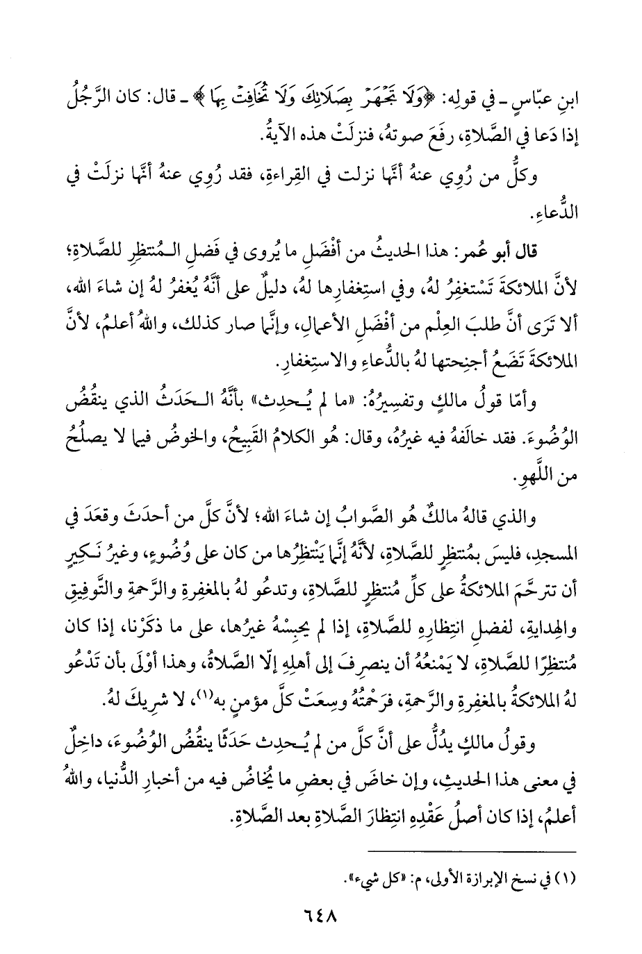 والذي قالهُ مالكٌ هُو الصَّوابُ إن شاءَ الله؛ لأنَّ كلَّ من أحدَثَ وقعَدَ في المسجدِ، فليسَ بمُنتظِرٍ للصَّلاةِ، لأنَّهُ إنَّما يَنْتظِرُها من كان على وُضُوءٍ، وغيرُ نَكِيرٍ أن تترحَّمَ الملائكةُ على كلِّ مُنتظِرٍ للصَّلاةِ، وتدعُو لهُ بالمغفِرةِ والرَّحمةِ والتَّوفِيقِ والهِدايةِ، لفضلِ انتِظارِهِ للصَّلاةِ، إذا لم يحبِسْهُ غيرُها، على ما ذكَرْنا، إذا كان مُنتظِرًا للصَّلاةِ، لا يَمْنعُهُ أن ينصرِفَ إلى أهلِهِ إلّا الصَّلاةُ، وهذا أوْلَى بأن تَدْعُو لهُ الملائكةُ بالمغفِرةِ والرَّحمةِ، فرَحْمتُهُ وسِعَتْ كلَّ مؤمنٍ به (¬١)، لا شرِيكَ لهُ.