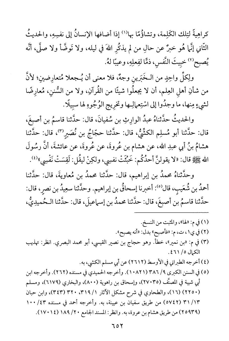 والحديثُ حدَّثناهُ عبدُ الوارِثِ بن سُفيانَ، قال: حدَّثنا قاسمُ بن أصبغَ، قال: حدَّثنا أبو مُسلِم الكشِّيُّ، قال: حدَّثنا حجّاجُ بن نُصَيرٍ (¬٣)، قال: حدَّثنا هشامُ بنُ أبي عبدِ الله، عن هشام بن عُروةَ، عن عُروةَ، عن عائشةَ، أنَّ رسُولَ الله - صلى الله عليه وسلم - قال: "لا يقولنَّ أحدُكُم: خَبُثَتْ نفسِي، ولكِنْ ليقُل: لَقِسَتْ نَفْسِي" (¬٤).