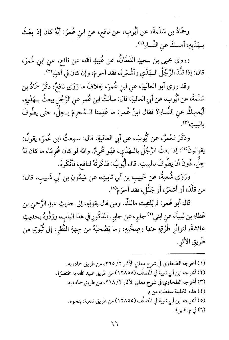 وحمّادُ بن سَلَمةَ، عن أيُّوب، عن نافع، عنِ ابنِ عُمرَ: أنَّهُ كان إذا بعَثَ بهَدْيِهِ، أمسكَ عنِ النِّساءِ (¬١).