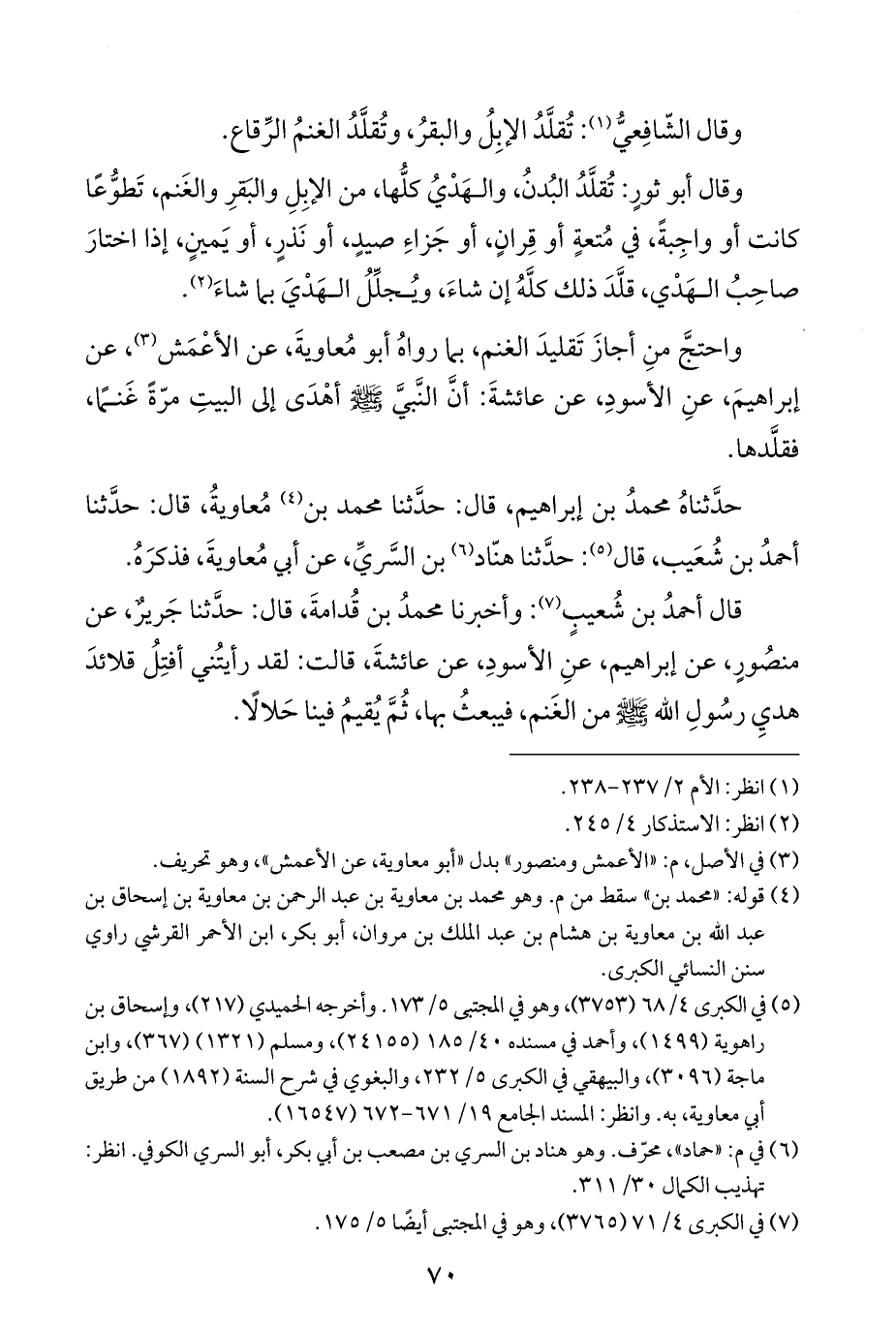 قال أحمدُ بن شُعيبٍ (¬٧): وأخبرنا محمدُ بن قُدامةَ، قال: حدَّثنا جَريرٌ، عن منصُورٍ، عن إبراهيم، عنِ الأسودِ، عن عائشةَ، قالت: لقد رأيتُني أفتِلُ قلائدَ هديِ رسُولِ اللَّه -صلى اللَّه عليه وسلم- من الغَنم، فيبعثُ بها، ثُمَّ يُقيمُ فينا حَلالًا.
