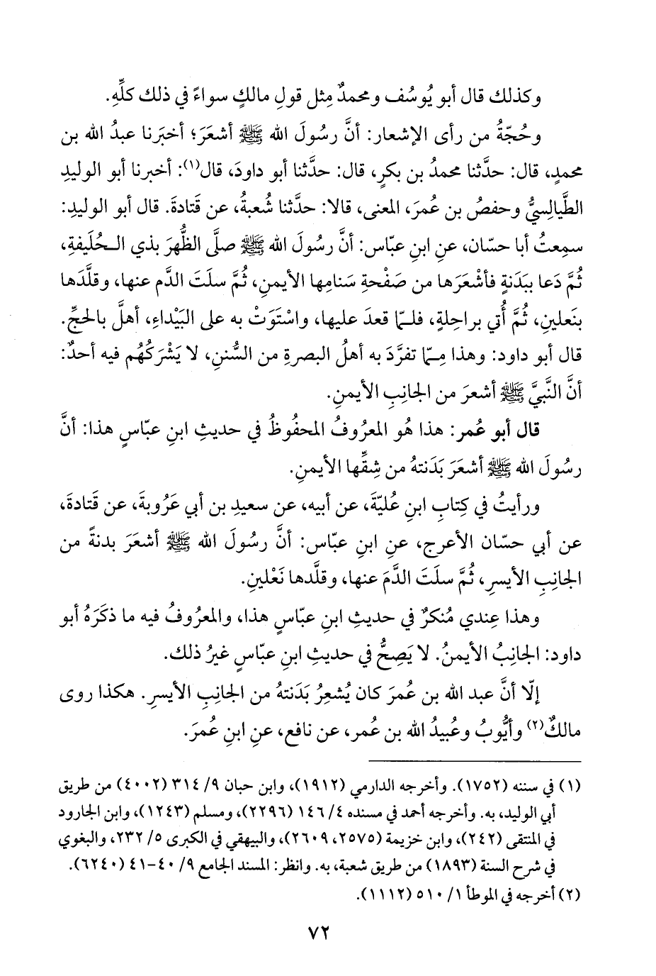 قال أبو عُمر: هذا هُو المعرُوفُ المحفُوظُ في حديثِ ابنِ عبّاسٍ هذا: أنَّ رسُولَ اللَّه -صلى اللَّه عليه وسلم- أشعَرَ بَدَنتهُ من شِقِّها الأيمنِ.