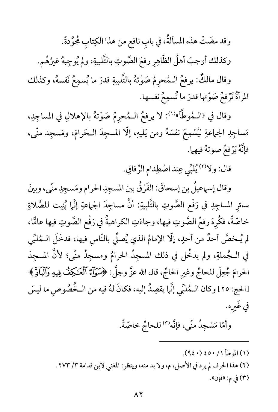 وقال إسماعيلُ بن إسحاقَ: الفَرْقُ بين المسجِدِ الحرام ومَسجِدِ منًى، وبينَ سائرِ المساجِدِ في رَفْع الصَّوتِ بالتَّلبيةِ: أنَّ مساجِدَ الجماعةِ إنَّما بُنِيت للصَّلاةِ خاصّةً، فكُرِهَ رفعُ الصَّوتِ فيها، وجاءَتِ الكراهيةُ في رَفْع الصَّوتِ فيها عامًّا، لم يُخصَّ أحدٌ من أحدٍ، إلّا الإمامُ الذي يُصلِّي بالنّاسِ فيها، فدخَلَ المُلبِّي في الجُملةِ، ولم يدخُل في ذلك المسجِدُ الحرامُ ومسجِدُ منًى؛ لأنَّ المسجِدَ الحرامَ جُعِلَ للحاجِّ وغيرِ الحاجِّ، قال اللَّه عزَّ وجلَّ: {سَوَاءً الْعَاكِفُ فِيهِ وَالْبَادِ} [الحج: ٢٥] وكان المُلبِّي إنَّما يقصِدُ إليه، فكانَ لهُ فيه من الخُصُوصِ ما ليسَ في غَيرِه.