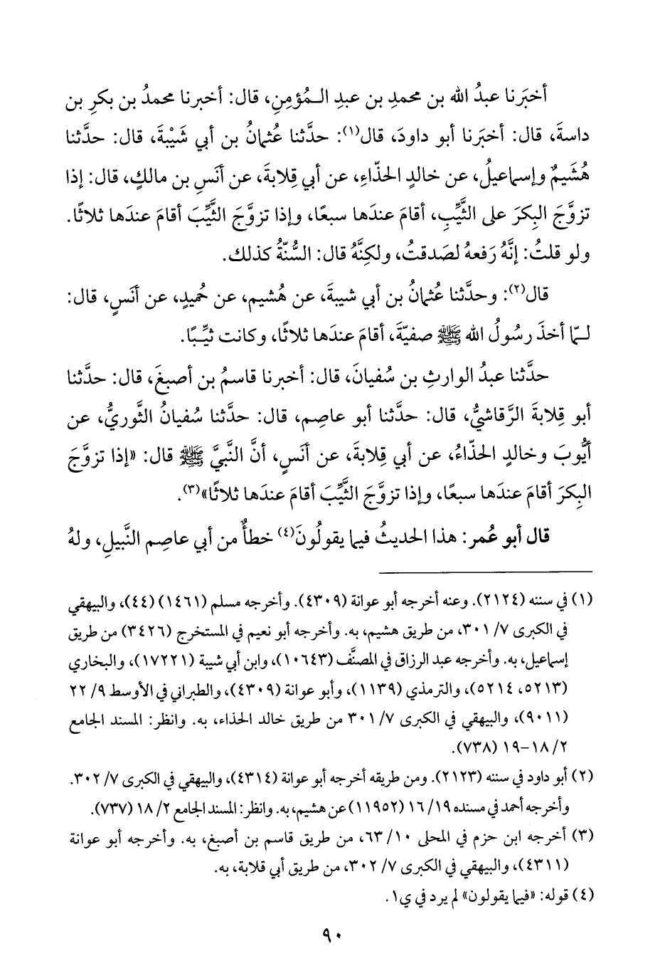 حدَّثنا عبدُ الوارثِ بن سُفيانَ، قال: أخبرنا قاسمُ بن أصبغَ، قال: حدَّثنا أبو قِلابةَ الرَّقاشيُّ، قال: حدَّثنا أبو عاصِم، قال: حدَّثنا سُفيانُ الثَّوريُّ، عن أيُّوبَ وخالدٍ الحذّاءُ، عن أبي قِلابةَ، عن أنَسٍ، أنَّ النَّبيَّ -صلى اللَّه عليه وسلم- قال: "إذا تزوَّجَ البِكرَ أقامَ عندَها سبعًا، وإذا تزوَّجَ الثَّيِّبَ أقامَ عندَها ثلاثًا" (¬٣).