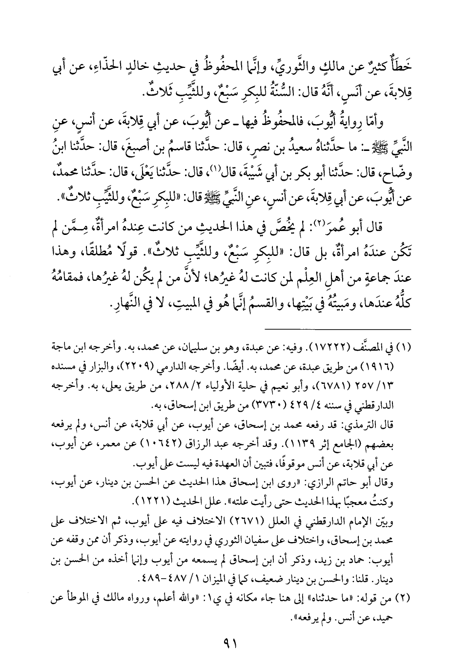 خَطَأٌ كثيرٌ عن مالكٍ والثَّوريِّ، وإنَّما المحفُوظُ في حديثِ خالدٍ الحذّاءِ، عن أبي قِلابةَ، عن أنَسٍ، أنَّهُ قال: السُّنّةُ للبِكرِ سَبْعٌ، وللثَّيِّبِ ثَلاثٌ.