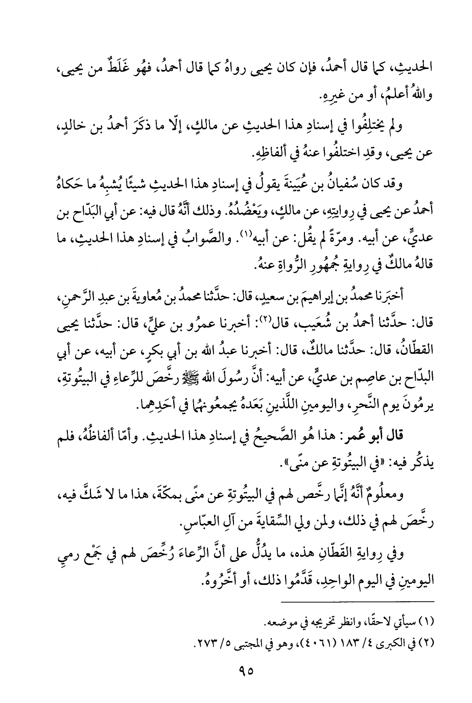 قال أبو عُمر: هذا هُو الصَّحيحُ في إسنادِ هذا الحديثِ. وأمّا ألفاظُهُ، فلم يذكُر فيه: "في البيتُوتةِ عن منًى".