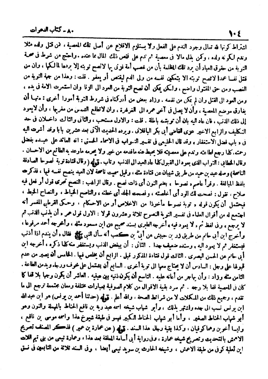 اشْتِرَاطَ كَوْنِهَا لِلَّهِ تَعَالَى وُجُودُ النَّدَمِ عَلَى الْفِعْلِ وَلَا يَسْتَلْزِمُ الْإِقْلَاعَ عَنْ أَصْلِ تِلْكَ الْمَعْصِيَةِ كَمَنْ قَتَلَ وَلَدَهُ مَثَلًا وَنَدِمَ لِكَوْنِهِ وَلَدَهُ وَكَمَنَ بَذَلَ مَالًا فِي مَعْصِيَةٍ ثُمَّ نَدِمَ عَلَى نَقْصِ ذَلِكَ الْمَالِ مِمَّا عِنْدَهُ وَاحْتَجَّ مَنْ شَرَطَ فِي صِحَّةِ التَّوْبَةِ مِنْ حُقُوقِ الْعِبَادِ أَنْ يَرُدَّ تِلْكَ الْمَظْلِمَةَ بِأَنَّ مَنْ غَصَبَ أَمَةً فَزَنَى بِهَا لَا تَصِحُّ تَوْبَتُهُ إِلَّا بِرَدِّهَا لِمَالِكِهَا وَأَنَّ مَنْ قَتَلَ نَفْسًا عَمْدًا لَا تَصِحُّ تَوْبَتُهُ إِلَّا بِتَمْكِينِ نَفْسِهِ مِنْ وَلِيِّ الدَّمِ لِيَقْتَصَّ أَوْ يَعْفُوَ قُلْتُ وَهَذَا مِنْ جِهَةِ التَّوْبَةِ مِنَ الْغَصْبِ وَمِنْ حَقِّ الْمَقْتُولِ وَاضِحٌ وَلَكِنْ يُمْكِنُ أَنْ تَصِحَّ التَّوْبَةُ مِنَ الْعَوْدِ إِلَى الزِّنَا وَإِنِ اسْتَمَرَّتِ الْأَمَةُ فِي يَدِهِ وَمِنَ الْعَوْدِ إِلَى الْقَتْلِ وَإِنْ لَمْ يُمَكِّنْ مِنْ نَفْسِهِ وَزَادَ بَعْضُ مَنْ أَدْرَكْنَاهُ فِي شُرُوطِ التَّوْبَةِ أُمُورًا أُخْرَى مِنْهَا أَنْ يُفَارِقَ مَوْضِعَ الْمَعْصِيَةِ وَأَنْ لَا يَصِلَ فِي آخِرِ عُمْرِهِ إِلَى الْغَرْغَرَةِ وَأَنْ لَا تَطْلُعَ الشَّمْسُ مِنْ مَغْرِبِهَا وَأَنْ لَا يَعُودَ إِلَى ذَلِكَ الذَّنْبِ فَإِنْ عَادَ إِلَيْهِ بَانَ أَنَّ تَوْبَتَهُ بَاطِلَةٌ قُلْتُ وَالْأَوَّلُ مُسْتَحَبٌّ وَالثَّانِي وَالثَّالِثُ دَاخِلَانِ فِي حَدِّ التَّكْلِيفِ وَالرَّابِعُ الْأَخِيرُ عُزِيَ لِلْقَاضِي أَبِي بَكْرٍ الْبَاقِلَّانِيِّ وَيَرُدُّهُ الْحَدِيثُ الْآتِي بَعْدَ عِشْرِينَ بَابًا وَقَدْ أَشَرْتُ إِلَيْهِ فِي بَابِ فَضْلِ الِاسْتِغْفَارِ وَقَدْ قَالَ الخليمي فِي تَفْسِيرِ التَّوَّابِ فِي الْأَسْمَاءِ الْحُسْنَى أَنَّهُ الْعَائِدُ عَلَى عَبْدِهِ بِفَضْلِ رَحْمَتِهِ كُلَّمَا رَجَعَ لِطَاعَتِهِ وَنَدِمَ عَلَى مَعْصِيَتِهِ فَلَا يُحْبِطُ عَنْهُ مَا قَدَّمَهُ مِنْ خَيْرٍ وَلَا يَحْرِمُهُ مَا وَعَدَ بِهِ الطَّائِعَ مِنَ الْإِحْسَانِ وَقَالَ الْخَطَّابِيُّ التَّوَّابُ الَّذِي يَعُودُ إِلَى الْقَبُولِ كُلَّمَا عَادَ الْعَبْدُ إِلَى الذَّنْبِ وَتَابَ قَوْلُهُ وَقَالَ قَتَادَةُ تَوْبَةً نَصُوحًا الصَّادِقَةُ النَّاصِحَةُ وَصَلَهُ عَبْدُ بْنُ حُمَيْدٍ مِنْ طَرِيقِ شَيْبَانَ عَنْ قَتَادَةَ مِثْلَهُ وَقِيلَ سُمِّيَتْ نَاصِحَةً لِأَنَّ الْعَبْدَ يَنْصَحُ نَفْسَهُ فِيهَا فَذُكِرَتْ بِلَفْظِ الْمُبَالَغَةِ وَقَرَأَ عَاصِمٌ نُصُوحًا بِضَمِّ النُّونِ أَيْ ذَاتَ نُصْحٍ وَقَالَ الرَّاغِبُ النُّصْحُ تَحَرِّي قَوْلٍ أَوْ فِعْلٍ فِيهِ صَلَاحٌ تَقُولُ نَصَحْتُ لَكَ الْوُدَّ أَيْ أَخْلَصْتُهُ وَنَصَحْتُ الْجِلْدَ أَيْ خِطْتُهُ وَالنَّاصِحُ الْخَيَّاطُ وَالنِّصَاحُ الْخَيْطُ فَيَحْتَمِلُ أَنْ يَكُونَ قَوْلُهُ تَوْبَةً نَصُوحًا مَأْخُوذًا مِنَ الْإِخْلَاصِ أَوْ مِنَ الْإِحْكَامِ وَحَكَى الْقُرْطُبِيُّ الْمُفَسِّرُ أَنَّهُ اجْتَمَعَ لَهُ مِنْ أَقْوَالِ الْعُلَمَاءِ فِي تَفْسِيرِ التَّوْبَةِ النَّصُوحِ ثَلَاثَةٌ وَعِشْرُونَ قَوْلًا الْأَوَّلُ قَوْلُ عُمَرَ أَنْ يُذْنِبَ الذَّنْبَ ثُمَّ لَا يَرْجِعُ وَفِي لَفْظٍ ثُمَّ لَا يَعُودُ فِيهِ أخرجه الطَّبَرِيّ بِسَنَد صَحِيح عَن بن مَسْعُود مثله وَأخرجه احْمَد مَرْفُوعا واخرج بن أَبِي حَاتِمٍ مِنْ طَرِيقِ زِرِّ بْنِ حُبَيْشٍ عَنْ أُبَيِّ بْنِ كَعْبٍ أَنَّهُ سَأَلَ النَّبِيَّ صَلَّى اللَّهُ عَلَيْهِ وَسَلَّمَ فَقَالَ إِنَّ يَنْدَمَ إِذَا أَذْنَبَ فَيَسْتَغْفِرَ ثُمَّ لَا يَعُودَ إِلَيْهِ وَسَنَدُهُ ضَعِيفٌ جِدًّا الثَّانِي أَنْ يُبْغِضَ الذَّنْبَ ويستغفر مِنْهُ كلما ذكره أخرجه بن أَبِي حَ