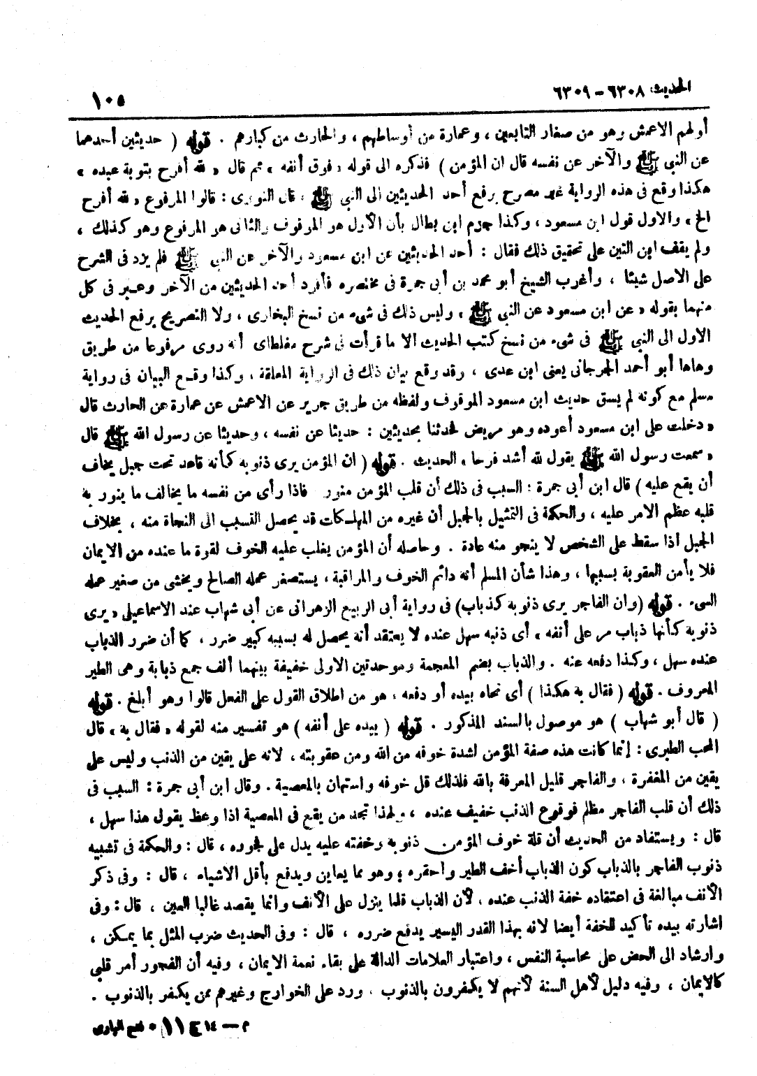 أَوَّلُهُمُ الْأَعْمَشُ وَهُوَ مِنْ صِغَارِ التَّابِعِينَ وَعُمَارَةُ مِنْ أَوْسَاطِهِمْ وَالْحَارِثُ مِنْ كِبَارِهِمْ قَوْلُهُ حَدِيثَيْنِ أَحَدَهُمَا عَنِ النَّبِيِّ صَلَّى اللَّهُ عَلَيْهِ وَسَلَّمَ وَالْآخَرُ عَنْ نَفْسِهِ قَالَ إِنَّ الْمُؤْمِنَ فَذَكَرَهُ إِلَى قَوْلِهِ فَوْقَ أَنْفِهِ ثُمَّ قَالَ لَلَّهُ أَفْرَحُ بِتَوْبَةِ عَبْدِهِ هَكَذَا وَقَعَ فِي هَذِهِ الرِّوَايَةِ غَيْرَ مُصَرَّحٍ بِرَفْعِ أَحَدِ الْحَدِيثَيْنِ إِلَى النَّبِيِّ صَلَّى اللَّهُ عَلَيْهِ وَسَلَّمَ قَالَ النَّوَوِيُّ قَالُوا الْمَرْفُوعُ لَلَّهُ أَفْرَحُ إِلَخْ وَالْأَوَّلُ قَوْلُ بن مَسْعُود وَكَذَا جزم بن بَطَّالٍ بِأَنَّ الْأَوَّلَ هُوَ الْمَوْقُوفُ وَالثَّانِيَ هُوَ الْمَرْفُوع وَهُوَ كَذَلِك وَلم يقف بن التِّينِ عَلَى تَحْقِيقِ ذَلِكَ فَقَالَ أَحَدُ الْحَدِيثَيْنِ عَن بن مَسْعُودٍ وَالْآخَرُ عَنِ النَّبِيِّ صَلَّى اللَّهُ عَلَيْهِ وَسَلَّمَ فَلَمْ يَزِدْ فِي الشَّرْحِ عَلَى الْأَصْلِ شَيْئًا وَأَغْرَبَ الشَّيْخُ أَبُو مُحَمَّدِ بْنُ أَبِي جَمْرَةَ فِي مُخْتَصَرِهِ فَأَفْرَدَ أَحَدَ الْحَدِيثَيْنِ مِنَ الْآخَرِ وَعَبَّرَ فِي كُلٍّ مِنْهُمَا بِقَوْلِهِ عَنِ بْنِ مَسْعُودٍ عَنِ النَّبِيِّ صَلَّى اللَّهُ عَلَيْهِ وَسَلَّمَ وَلَيْسَ ذَلِكَ فِي شَيْءٍ مِنْ نُسَخِ الْبُخَارِيِّ وَلَا التَّصْرِيحُ بِرَفْعِ الْحَدِيثِ الْأَوَّلِ إِلَى النَّبِيِّ صَلَّى اللَّهُ عَلَيْهِ وَسَلَّمَ فِي شَيْءٍ مِنْ نُسَخِ كُتُبِ الْحَدِيثِ إِلَّا مَا قَرَأْتُ فِي شَرْحِ مُغْلَطَايْ أَنَّهُ رُوِيَ مَرْفُوعًا مِنْ طَرِيق وهاها أَبُو احْمَد الْجِرْجَانِيّ يَعْنِي بن عَدِيٍّ وَقَدْ وَقَعَ بَيَانُ ذَلِكَ فِي الرِّوَايَةِ الْمُعَلَّقَةِ وَكَذَا وَقَعَ الْبَيَانُ فِي رِوَايَةِ مُسْلِمٍ مَعَ كَونه لم يسق حَدِيث بن مَسْعُودٍ الْمَوْقُوفَ وَلَفْظُهُ مِنْ طَرِيقِ جَرِيرٍ عَنِ الْأَعْمَشِ عَنْ عُمَارَةَ عَنِ الْحَارِثِ قَالَ دَخَلْتُ على بن مَسْعُودٍ أَعُودُهُ وَهُوَ مَرِيضٌ فَحَدَّثَنَا بِحَدِيثَيْنِ حَدِيثًا عَنْ نَفْسِهِ وَحَدِيثًا عَنْ رَسُولِ اللَّهِ صَلَّى اللَّهُ عَلَيْهِ وَسَلَّمَ قَالَ سَمِعْتُ رَسُولَ اللَّهِ صَلَّى اللَّهُ عَلَيْهِ وَسَلَّمَ يَقُولُ لَلَّهُ أَشَدُّ فَرَحًا الْحَدِيثَ قَوْلُهُ إِنَّ الْمُؤْمِنَ يَرَى ذُنُوبَهُ كَأَنَّهُ قَاعِدٌ تَحْتَ جَبَلٍ يَخَافُ أَنْ يَقَعَ عَلَيْهِ قَالَ بن أَبِي جَمْرَةَ السَّبَبُ فِي ذَلِكَ أَنَّ قَلْبَ الْمُؤْمِنِ مُنَوَّرٌ فَإِذَا رَأَى مِنْ نَفْسِهِ مَا يُخَالِفُ مَا يُنَوِّرُ بِهِ قَلْبَهُ عَظُمَ الْأَمْرُ عَلَيْهِ وَالْحِكْمَةُ فِي التَّمْثِيلِ بِالْجَبَلِ أَنَّ غَيْرَهُ مِنَ الْمُهْلِكَاتِ قَدْ يَحْصُلُ التَّسَبُّبُ إِلَى النَّجَاةِ مِنْهُ بِخِلَافِ الْجَبَلِ إِذَا سَقَطَ عَلَى الشَّخْصِ لَا يَنْجُو مِنْهُ عَادَةً وَحَاصِلُهُ أَنَّ الْمُؤْمِنَ يَغْلِبُ عَلَيْهِ الْخَوْفُ لِقُوَّةِ مَا عِنْدَهُ مِنَ الْإِيمَانِ فَلَا يَأْمَنُ الْعُقُوبَةَ بِسَبَبِهَا وَهَذَا شَأْنُ الْمُسْلِمِ أَنَّهُ دَائِمُ الْخَوْفِ وَالْمُرَاقَبَةِ يَسْتَصْغِرُ عَمَلَهُ الصَّالح ويخشى من صَغِير عمله السيء قَوْلُهُ وَإنَّ الْفَاجِرَ يَرَى ذُنُوبَهُ كَذُبَابٍ فِي رِوَايَةِ أَبِي الرَّبِيعِ الزَّهْرَانِيِّ عَنْ أَبِي شِهَابٍ عِنْدَ الْإِسْمَاعِيلِيِّ يَرَى ذُنُوبَهُ كَأَنَّهَا ذُبَابٌ مَرَّ عَلَى أَنْفِهِ أَيْ ذَنْبُهُ سَهْلٌ عِنْدَهُ لَا يَعْتَقِدُ أَنَّهُ يَحْصُلُ لَهُ بِسَبَبِهِ كَبِيرُ ضَرَرٍ كَمَا أَنَّ ضَرَرَ الذُّبَابِ عِنْدَهُ سَهْلٌ وَكَذَا دَفْعُهُ عَنْهُ وَالذُّبَابُ بِضَمِّ الْمُعْجَمَةِ وَمُوَحَّدَتَيْنِ الْأُولَى خَفِيفَةٌ بَيْنَهُمَا أَلِفٌ جَمْعُ ذُبَابَةٍ