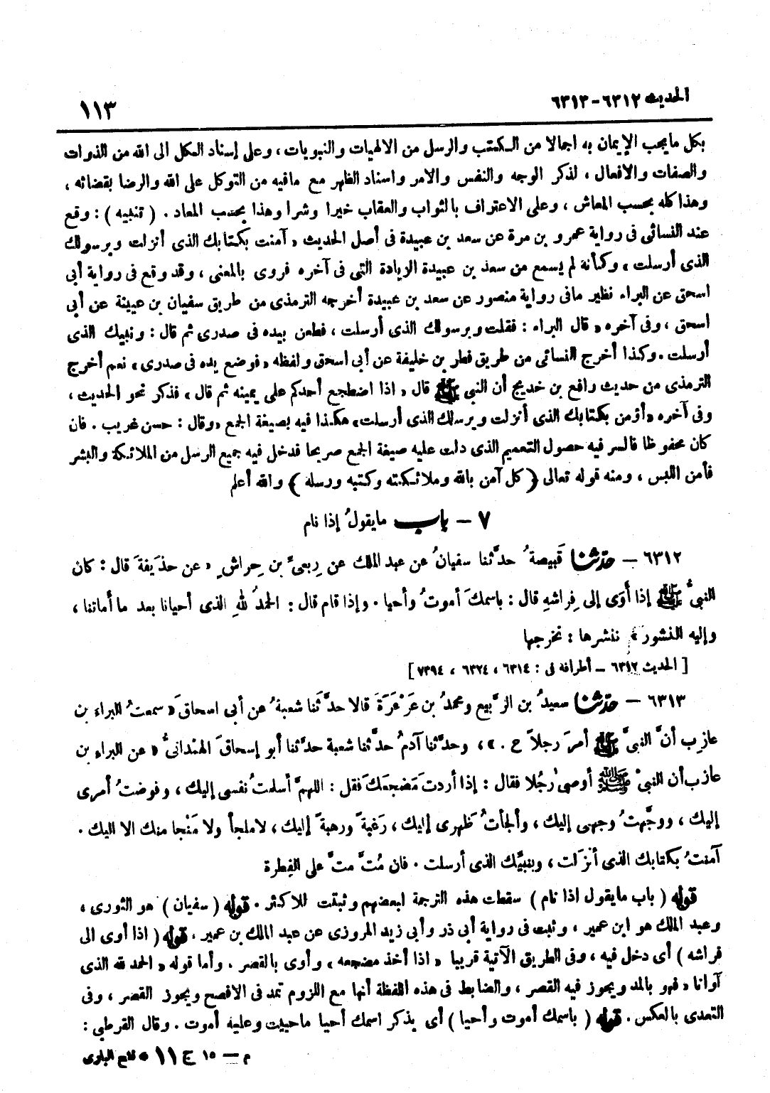 [6312] قَوْلُهُ سُفْيَانُ هُوَ الثَّوْريّ وَعبد الْملك هُوَ بن عُمَيْرٍ وَثَبَتَ فِي رِوَايَةِ أَبِي ذَرٍّ وَأَبِي زَيْدٍ الْمَرْوَزِيِّ عَنْ عَبْدِ الْمَلِكِ بْنِ عُمَيْرٍ قَوْلُهُ إِذَا أَوَى إِلَى فِرَاشِهِ أَيْ دَخَلَ فِيهِ وَفِي الطَّرِيقِ الْآتِيَةِ قَرِيبًا إِذَا أَخَذَ مَضْجَعَهُ وَأَوَى بِالْقَصْرِ وَأَمَّا قَوْلُهُ الْحَمْدُ لِلَّهِ الَّذِي آوَانَا فَهُوَ بِالْمَدِّ وَيَجُوزُ فِيهِ الْقَصْرُ وَالضَّابِطُ فِي هَذِهِ اللَّفْظَةِ أَنَّهَا مَعَ اللُّزُومِ تُمَدُّ فِي الْأَفْصَحِ وَيَجُوزُ الْقَصْرُ وَفِي التَّعَدِّي بِالْعَكْسِ قَوْلُهُ بِاسْمِكَ أَمُوتُ وَأَحْيَا أَيْ بِذِكْرِ اسْمِكَ أَحْيَا مَا حَيِيتُ وَعَلَيْهِ أَمُوتُ وَقَالَ الْقُرْطُبِيّ