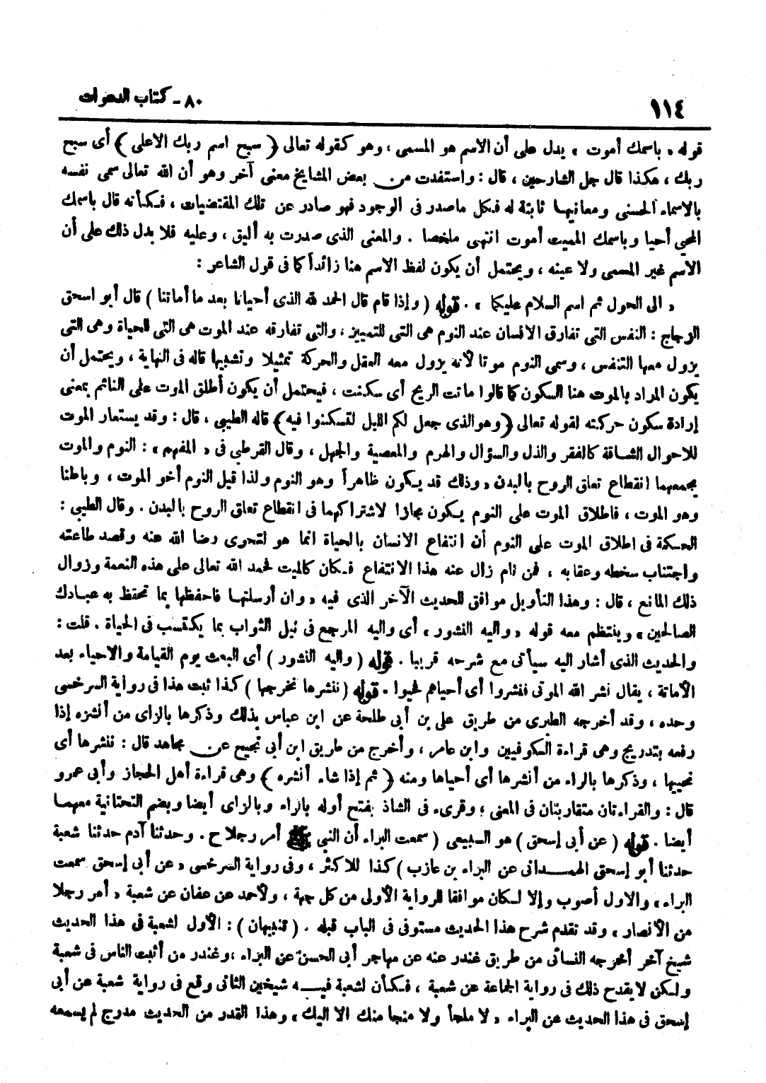 قَوْلُهُ بِاسْمِكَ أَمُوتُ يَدُلُّ عَلَى أَنَّ الِاسْمَ هُوَ الْمُسَمَّى وَهُوَ كَقَوْلِهِ تَعَالَى سَبِّحِ اسْمَ رَبك الْأَعْلَى أَيْ سَبِّحْ رَبَّكَ هَكَذَا قَالَ جُلُّ الشَّارِحِينَ قَالَ وَاسْتَفَدْتُ مِنْ بَعْضِ الْمَشَايِخِ مَعْنًى آخَرَ وَهُوَ أَنَّ اللَّهَ تَعَالَى سَمَّى نَفْسَهُ بِالْأَسْمَاءِ الْحُسْنَى وَمَعَانِيَهَا ثَابِتَةٌ لَهُ فَكُلُّ مَا صَدَرَ فِي الْوُجُودِ فَهُوَ صَادِرٌ عَنْ تِلْكَ الْمُقْتَضَيَاتِ فَكَأَنَّهُ قَالَ بِاسْمِكَ الْمُحْيِي أَحْيَا وَبِاسْمِكَ الْمُمِيتِ أَمُوتُ انْتَهَى مُلَخَّصًا وَالْمَعْنَى الَّذِي صَدَّرْتُ بِهِ أَلْيَقُ وَعَلَيْهِ فَلَا يَدُلُّ ذَلِكَ عَلَى أَنَّ الِاسْمَ غَيْرُ الْمُسَمَّى وَلَا عَيْنُهُ وَيَحْتَمِلُ أَنْ يَكُونَ لَفْظُ الِاسْمِ هُنَا زَائِدًا كَمَا فِي قَوْلِ الشَّاعِرِ إِلَى الْحَوْلِ ثُمَّ اسْمِ السَّلَامِ عَلَيْكُمَا قَوْلُهُ وَإِذَا قَامَ قَالَ الْحَمْدُ لِلَّهِ الَّذِي أَحْيَانَا بَعْدَ مَا أَمَاتَنَا قَالَ أَبُو إِسْحَاقَ الزَّجَّاجُ النَّفْسُ الَّتِي تُفَارِقُ الْإِنْسَانَ عِنْدَ النَّوْمِ هِيَ الَّتِي لِلتَّمْيِيزِ وَالَّتِي تُفَارِقُهُ عِنْدَ الْمَوْتِ هِيَ الَّتِي لِلْحَيَاةِ وَهِيَ الَّتِي يَزُولُ مَعَهَا التَّنَفُّسُ وَسُمِّيَ النَّوْمُ مَوْتًا لِأَنَّهُ يَزُولُ مَعَهُ الْعَقْلُ وَالْحَرَكَةُ تَمْثِيلًا وَتَشْبِيهًا قَالَهُ فِي النِّهَايَةِ وَيَحْتَمِلُ أَنْ يَكُونَ الْمُرَادُ بِالْمَوْتِ هُنَا السُّكُونَ كَمَا قَالُوا مَاتَتِ الرِّيحُ أَيْ سَكَنَتْ فَيَحْتَمِلُ أَنْ يَكُونَ أَطْلَقَ الْمَوْتَ عَلَى النَّائِمِ بِمَعْنَى إِرَادَةِ سُكُونِ حَرَكَتِهِ لِقولِهِ تَعَالَى وَهُوَ الَّذِي جَعَلَ لَكُمُ اللَّيْلَ لتسكنوا فِيهِ قَالَهُ الطِّيبِيُّ قَالَ وَقَدْ يُسْتَعَارُ الْمَوْتُ لِلْأَحْوَالِ الشَّاقَّةِ كَالْفَقْرِ وَالذُّلِّ وَالسُّؤَالِ وَالْهَرَمِ وَالْمَعْصِيَةِ وَالْجَهْلِ وَقَالَ الْقُرْطُبِيُّ فِي الْمُفْهِمِ النَّوْمُ وَالْمَوْتُ يَجْمَعُهُمَا انْقِطَاعُ تَعَلُّقِ الرُّوحِ بِالْبَدَنِ وَذَلِكَ قَدْ يَكُونُ ظَاهِرًا وَهُوَ النَّوْمُ وَلِذَا قِيلَ النَّوْمُ أَخُو الْمَوْتِ وَبَاطِنًا وَهُوَ الْمَوْتُ فَإِطْلَاقُ الْمَوْتِ عَلَى النَّوْمِ يَكُونُ مَجَازًا لِاشْتِرَاكِهِمَا فِي انْقِطَاعِ تَعَلُّقِ الرُّوحِ بِالْبَدَنِ وَقَالَ الطِّيبِيُّ الْحِكْمَةُ فِي إِطْلَاقِ الْمَوْتِ عَلَى النَّوْمِ أَنَّ انْتِفَاعَ الْإِنْسَانِ بِالْحَيَاةِ إِنَّمَا هُوَ لِتَحَرِّي رِضَا اللَّهِ عَنْهُ وَقَصْدِ طَاعَتِهِ وَاجْتِنَابِ سَخَطِهِ وَعِقَابِهِ فَمَنْ نَامَ زَالَ عَنْهُ هَذَا الِانْتِفَاعُ فَكَانَ كَالْمَيِّتِ فَحَمِدَ اللَّهَ تَعَالَى عَلَى هَذِهِ النِّعْمَةِ وَزَوَالِ ذَلِكَ الْمَانِعِ قَالَ وَهَذَا التَّأْوِيلُ مُوَافِقٌ لِلْحَدِيثِ الْآخَرِ الَّذِي فِيهِ وَإِنْ أَرْسَلْتَهَا فَاحْفَظْهَا بِمَا تَحْفَظُ بِهِ عِبَادَكَ الصَّالِحِينَ وَيَنْتَظِمُ مَعَهُ قَوْلُهُ وَإِلَيْهِ النُّشُورُ أَيْ وَإِلَيْهِ الْمَرْجِعُ فِي نَيْلِ الثَّوَابِ بِمَا يَكْتَسِبُ فِي الْحَيَاةِ قُلْتُ وَالْحَدِيثُ الَّذِي أَشَارَ إِلَيْهِ سَيَأْتِي مَعَ شَرْحِهِ قَرِيبًا قَوْلُهُ وَإِلَيْهِ النُّشُورُ أَيِ الْبَعْثُ يَوْمَ الْقِيَامَةِ وَالْإِحْيَاءُ بَعْدَ إِلَّا ماتة يُقَالُ نَشَرَ اللَّهُ الْمَوْتَى فَنُشِرُوا أَيْ أَحْيَاهُمْ فَحَيُوا قَوْلُهُ تُنْشِرُهَا تُخْرِجُهَا كَذَا ثَبَتَ هَذَا فِي رِوَايَةِ السَّرَخْسِيِّ وَحْدَهُ وَقَدْ أَخْرَجَهُ الطَّبَرِيُّ مِنْ طَرِيقِ عَلِيِّ بْنِ أَبِي طَلْحَةَ عَنِ بن عَبَّاسٍ بِذَلِكَ وَذَكَرَهَا بِالزَّايِ مِنْ أَنْشَزَهُ إِذَا رَفعه بتدريج وَهِي قِرَاءَة الْ