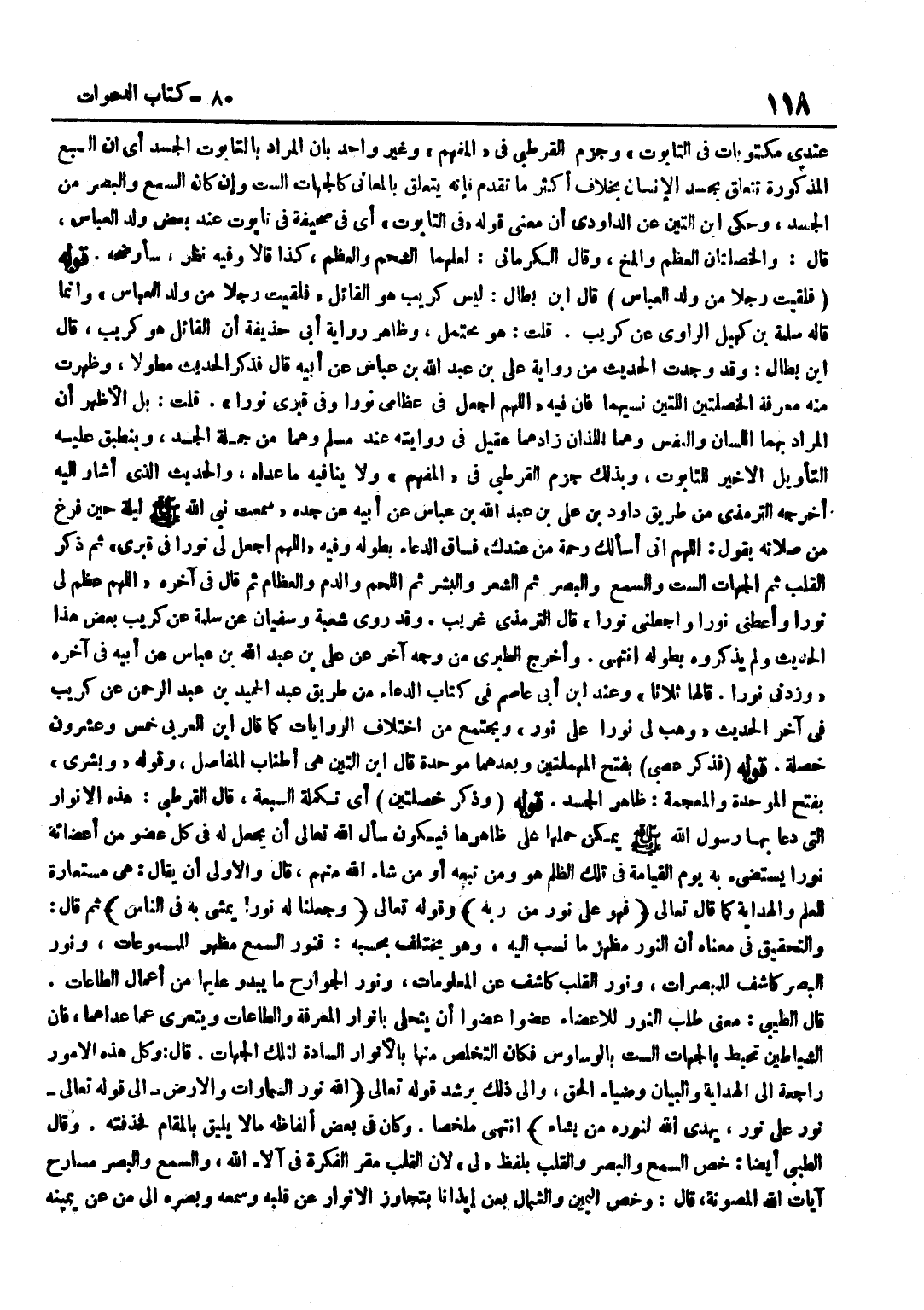 عِنْدِي مَكْتُوبَاتٌ فِي التَّابُوتِ وَجَزَمَ الْقُرْطُبِيُّ فِي الْمُفْهِمِ وَغَيْرُ وَاحِدٍ بِأَنَّ الْمُرَادَ بِالتَّابُوتِ الْجَسَدُ أَيْ أَنَّ السَّبْعَ الْمَذْكُورَةَ تَتَعَلَّقُ بِجَسَدِ الْإِنْسَانِ بِخِلَافِ أَكْثَرِ مَا تَقَدَّمَ فَإِنَّهُ يَتَعَلَّقُ بِالْمَعَانِي كَالْجِهَاتِ السِّتِّ وَإِنْ كَانَ السَّمْعُ وَالْبَصَرُ مِنَ الْجَسَد وَحكى بن التِّينِ عَنِ الدَّاوُدِيِّ أَنَّ مَعْنَى قَوْلِهِ فِي التَّابُوتِ أَيْ فِي صَحِيفَةٍ فِي تَابُوتٍ عِنْدَ بَعْضِ وَلَدِ الْعَبَّاسِ قَالَ وَالْخَصْلَتَانِ الْعَظْمُ وَالْمُخُّ وَقَالَ الْكِرْمَانِيُّ لَعَلَّهُمَا الشَّحْمُ وَالْعَظْمُ كَذَا قَالَا وَفِيهِ نَظَرٌ سَأُوَضِّحُهُ قَوْلُهُ فَلَقِيتُ رَجُلًا مِنْ ولد الْعَبَّاس قَالَ بن بَطَّالٍ لَيْسَ كُرَيْبٌ هُوَ الْقَائِلَ فَلَقِيتُ رَجُلًا مِنْ وَلَدِ الْعَبَّاسِ وَإِنَّمَا قَالَهُ سَلَمَةُ بْنُ كُهَيْلٍ الرَّاوِي عَنْ كُرَيْبٍ قُلْتُ هُوَ مُحْتَمَلٌ وَظَاهِرُ رِوَايَةِ أَبِي حُذَيْفَةَ أَنَّ الْقَائِلَ هُوَ كريب قَالَ بن بَطَّالٍ وَقَدْ وَجَدْتُ الْحَدِيثَ مِنْ رِوَايَةِ عَلِيِّ بْنِ عَبْدِ اللَّهِ بْنِ عَبَّاسٍ عَنْ أَبِيهِ قَالَ فَذَكَرَ الْحَدِيثَ مُطَوَّلًا وَظَهَرَتْ مِنْهُ مَعْرِفَةُ الْخَصْلَتَيْنِ اللَّتَيْنِ نَسِيَهُمَا فَإِنَّ فِيهِ اللَّهُمَّ اجْعَلْ فِي عِظَامِي نُورًا وَفِي قَبْرِي نُورًا قُلْتُ بَلِ الْأَظْهَرُ أَنَّ الْمُرَادَ بِهِمَا اللِّسَانُ وَالنَّفْسُ وَهُمَا اللَّذَانِ زَادَهُمَا عُقَيْلٌ فِي رِوَايَتِهِ عِنْدَ مُسْلِمٍ وَهُمَا مِنْ جُمْلَةِ الْجَسَدِ وَيَنْطَبِقُ عَلَيْهِ التَّأْوِيلُ الْأَخِيرُ لِلتَّابُوتِ وَبِذَلِكَ جَزَمَ الْقُرْطُبِيُّ فِي الْمُفْهِمِ وَلَا يُنَافِيهِ مَا عَدَاهُ وَالْحَدِيثُ الَّذِي أَشَارَ إِلَيْهِ أَخْرَجَهُ التِّرْمِذِيُّ مِنْ طَرِيقِ دَاوُدَ بْنِ عَلِيِّ بْنِ عَبْدِ اللَّهِ بْنِ عَبَّاسٍ عَنْ أَبِيهِ عَنْ جَدِّهِ سَمِعْتُ نَبِيَّ اللَّهِ صَلَّى اللَّهُ عَلَيْهِ وَسَلَّمَ لَيْلَةً حِينَ فَرَغَ مِنْ صَلَاتِهِ يَقُولُ اللَّهُمَّ إِنِّي أَسْأَلُكَ رَحْمَةً مِنْ عِنْدِكَ فَسَاقَ الدُّعَاءَ بِطُولِهِ وَفِيهِ اللَّهُمَّ اجْعَلْ لِي نُورًا فِي قَبْرِي ثُمَّ ذَكَرَ الْقَلْبَ ثُمَّ الْجِهَاتِ السِّتَّ وَالسَّمْعَ وَالْبَصَرَ ثُمَّ الشَّعْرَ وَالْبَشَرَ ثُمَّ اللَّحْمَ وَالدَّمَ وَالْعِظَامَ ثُمَّ قَالَ فِي آخِرِهِ اللَّهُمَّ عَظِّمْ لِي نُورًا وَأَعْطِنِي نُورًا وَاجْعَلْنِي نُورًا قَالَ التِّرْمِذِيُّ غَرِيبٌ وَقَدْ رَوَى شُعْبَةُ وَسُفْيَانُ عَنْ سَلَمَةَ عَنْ كُرَيْبٍ بَعْضَ هَذَا الْحَدِيثِ وَلَمْ يَذْكُرُوهُ بِطُولِهِ انْتَهَى وَأَخْرَجَ الطَّبَرِيُّ مِنْ وَجْهٍ آخَرَ عَنْ عَلِيِّ بْنِ عَبْدِ اللَّهِ بْنِ عَبَّاسٍ عَنْ أَبِيهِ فِي آخِرِهِ وَزِدْنِي نُورًا قَالَهَا ثَلَاثًا وَعند بن أَبِي عَاصِمٍ فِي كِتَابِ الدُّعَاءِ مِنْ طَرِيقِ عَبْدِ الْحَمِيدِ بْنِ عَبْدِ الرَّحْمَنِ عَنْ كُرَيْبٍ فِي آخِرِ الْحَدِيثِ وَهَبْ لِي نُورًا عَلَى نُورٍ وَيَجْتَمِعُ مِنِ اخْتِلَافِ الرِّوَايَاتِ كَمَا قَالَ بن الْعَرَبِيِّ خَمْسٌ وَعِشْرُونَ خَصْلَةً قَوْلُهُ فَذَكَرَ عَصَبِي بِفَتْح الْمُهْمَلَتَيْنِ وبعدهما مُوَحدَة قَالَ بن التِّينِ هِيَ أَطْنَابُ الْمَفَاصِلِ وَقَوْلُهُ وَبَشَرِي بِفَتْحِ الْمُوَحَّدَةِ وَالْمُعْجَمَةِ ظَاهِرُ الْجَسَدِ قَوْلُهُ وَذَكَرَ خَصْلَتَيْنِ أَيْ تَكْمِلَةَ السَّبْعَةِ قَالَ الْقُرْطُبِيُّ هَذِهِ الْأَنْوَارُ الَّتِي دَعَا بِهَا رَسُولُ اللَّهِ صَلَّى اللَّهُ عَلَيْهِ وَسَلَّمَ يُمْكِنُ حَمْلُهَا عَلَى ظَاهِرِهَا فَيَكُونُ سَأَلَ اللَّهَ تَعَالَى أَنْ يَجْعَلَ لَهُ فِي كُلِّ 