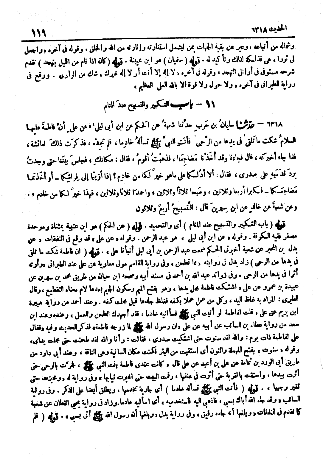 [6318] قَوْله عَن الحكم هُوَ بن عُتَيْبَةَ بِمُثَنَّاةٍ وَمُوَحَّدَةٍ مُصَغَّرٌ فَقِيهُ الْكُوفَةِ وَقَوْلُهُ عَن بن أَبِي لَيْلَى هُوَ عَبْدُ الرَّحْمَنِ وَقَوْلُهُ عَنْ عَلِيٍّ قَدْ وَقَعَ فِي النَّفَقَاتِ عَنْ بَدَلِ بْنِ الْمُحَبَّرِ عَنْ شُعْبَةَ أَخْبَرَنِي الْحَكَمُ سَمِعْتُ عبد الرَّحْمَن بن أَبِي لَيْلَى أَنْبَأَنَا عَلِيٌّ قَوْلُهُ إِنَّ فَاطِمَةَ شَكَتْ مَا تَلْقَى فِي يَدِهَا مِنَ الرَّحَى زَادَ بَدَلٌ فِي رِوَايَتِهِ مِمَّا تَطْحَنُ وَفِي رِوَايَةِ الْقَاسِمِ مَوْلَى مُعَاوِيَةَ عَنْ عَلِيٍّ عِنْدَ الطَّبَرَانِيِّ وَأَرَتْهُ أَثَرًا فِي يَدِهَا مِنَ الرَّحَى وَفِي زَوَائِدِ عَبْدِ اللَّهِ بْنِ أَحْمَدَ فِي مُسْنَدِ أَبِيهِ وَصَححهُ بن حِبَّانَ مِنْ طَرِيقِ مُحَمَّدِ بْنِ سِيرِينَ عَنْ عُبَيْدَةَ بْنِ عَمْرٍو عَنْ عَلِيٍّ اشْتَكَتْ فَاطِمَةُ مَجْلَ يَدِهَا وَهُوَ بِفَتْحِ الْمِيمِ وَسُكُونِ الْجِيمِ بَعْدَهَا لَامٌ مَعْنَاهُ التَّقْطِيعُ وَقَالَ الطَّبَرِيُّ الْمُرَادُ بِهِ غِلَظُ الْيَدِ وَكُلُّ مَنْ عَمِلَ عَمَلًا بِكَفِّهِ فَغَلُظَ جِلْدُهَا قِيلَ مَجَلَتْ كَفُّهُ وَعِنْدَ أَحْمَدَ مِنْ رِوَايَةِ هُبَيْرَةَ بْنِ يَرِيمَ عَنْ عَلِيٍّ قُلْتُ لِفَاطِمَةَ لَوْ أَتَيْتِ النَّبِيَّ صَلَّى اللَّهُ عَلَيْهِ وَسَلَّمَ فَسَأَلْتِيهِ خَادِمًا فَقَدْ أَجْهَدَكِ الطَّحْن وَالْعَمَل وَعِنْده وَعند بن سَعْدٍ مِنْ رِوَايَةُ عَطَاءِ بْنِ السَّائِبِ عَنْ أَبِيهِ عَنْ عَلِيٌّ إِنَّ رَسُولَ اللَّهِ صَلَّى اللَّهُ عَلَيْهِ وَسَلَّمَ لَمَّا زَوَّجَهُ فَاطِمَةَ فَذَكَرَ الْحَدِيثَ وَفِيهِ فَقَالَ عَلِيٌّ لِفَاطِمَةَ ذَاتَ يَوْمٍ وَاللَّهِ لَقَدْ سَنَوْتُ حَتَّى اشْتَكَيْتُ صَدْرِي فَقَالَتْ وَأَنَا وَاللَّهِ لَقَدْ طَحَنْتُ حَتَّى مَجَلَتْ يَدَايَ وَقَوْلُهُ سَنَوْتُ بِفَتْحِ الْمُهْمَلَةِ وَالنُّونِ أَيِ اسْتَقَيْتُ مِنَ الْبِئْرِ فَكُنْتُ مَكَانَ السَّانِيَةِ وَهِيَ النَّاقَةُ وَعِنْدَ أَبِي دَاوُدَ مِنْ طَرِيقِ أَبِي الْوَرْدِ بْنِ ثُمَامَةَ عَنْ عَلِيِّ بْنِ أَعْبَدَ عَنْ عَلِيٍّ قَالَ كَانَتْ عِنْدِي فَاطِمَةَ بِنْتَ النَّبِيِّ صَلَّى اللَّهُ عَلَيْهِ وَسَلَّمَ فَجَرَّتْ بِالرَّحَى حَتَّى أَثَّرَتْ بِيَدِهَا وَاسْتَقَتْ بِالْقِرْبَةِ حَتَّى أَثَّرَتْ فِي عُنُقِهَا وَقَمَّتِ الْبَيْتِ حَتَّى اغْبَرَّتْ ثِيَابُهَا وَفِي رِوَايَةٍ لَهُ وَخَبَزَتْ حَتَّى تَغَيَّرَ وَجْهُهَا قَوْلُهُ فَأَتَتِ النَّبِيَّ صَلَّى اللَّهُ عَلَيْهِ وَسَلَّمَ تَسْأَلُهُ خَادِمًا أَيْ جَارِيَةً تَخْدُمُهَا وَيُطْلَقُ أَيْضًا عَلَى الذَّكَرِ وَفِي رِوَايَةِ السَّائِبِ وَقَدْ جَاءَ اللَّهُ أَبَاكِ بِسَبْيٍ فَاذْهَبِي إِلَيْهِ فَاسْتَخْدِمِيهِ أَيِ اسْأَلِيهِ خَادِمًا وَزَادَ فِي رِوَايَةِ يَحْيَى الْقَطَّانِ عَنْ شُعْبَةَ كَمَا تَقَدَّمَ فِي النَّفَقَاتِ وَبَلَغَهَا أَنَّهُ جَاءَهُ رَقِيقٌ وَفِي رِوَايَةِ بَدَلٍ وَبَلَغَهَا أَنَّ رَسُولَ اللَّهِ صَلَّى اللَّهُ عَلَيْهِ وَسَلَّمَ أَتَى بِسَبْيٍ قَوْلُهُ فَلَمْ