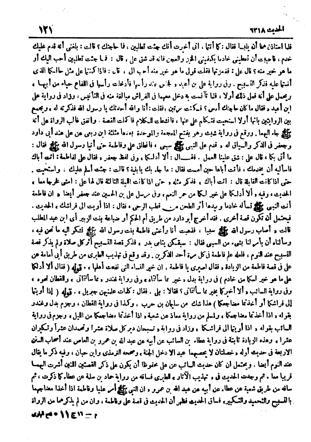 فَلَمَّا اسْتَأْذَنَ هَمَّا أَنْ يَلْبَسَا فَقَالَ كَمَا أَنْتُمَا إِنِّي أُخْبِرَتُ أَنَّكِ جِئْتِ تَطْلُبِينَ فَمَا حَاجَتُكِ قَالَتْ بَلَغَنِي أَنَّهُ قَدِمَ عَلَيْكَ خَدَمٌ فَأَحْبَبْتُ أَنْ تُعْطِيَنِي خَادِمًا يَكْفِينِي الْخُبْزَ وَالْعَجْنَ فَإِنَّهُ قَدْ شَقَّ عَلَيَّ قَالَ فَمَا جِئْتِ تَطْلُبِينَ أَحَبُّ إِلَيْكِ أَوْ مَا هُوَ خَيْرٌ مِنْهُ قَالَ عَلِيٌّ فَغَمَزْتُهَا فَقُلْتُ قُولِي مَا هُوَ خَيْرٌ مِنْهُ أَحَبُّ إِلَيَّ قَالَ فَإِذَا كُنْتُمَا عَلَى مِثْلِ حَالِكُمَا الَّذِي أَنْتُمَا عَلَيْهِ فَذَكَرَ التَّسْبِيحَ وَفِي رِوَايَةِ عَلِيِّ بْنِ أَعْبَدَ فَجَلَسَ عِنْدَ رَأْسِهَا فَأَدْخَلَتْ رَأْسَهَا فِي اللِّفَاعِ حَيَاءً مِنْ أَبِيهَا وَيُحْمَلُ عَلَى أَنَّهُ فَعَلَ ذَلِكَ أَوَّلًا فَلَمَّا تَآنَسَتْ بِهِ دَخَلَ مَعَهُمَا فِي الْفِرَاشِ مُبَالَغَةً مِنْهُ فِي التَّأْنِيسِ وَزَادَ فِي رِوَايَةِ عَلِيِّ بْنِ أَعْبَدَ فَقَالَ مَا كَانَ حَاجَتُكِ أَمْسِ فَسَكَتَتْ مَرَّتَيْنِ فَقُلْتُ أَنَا وَاللَّهِ أُحَدِّثُكَ يَا رَسُولَ اللَّهِ فَذَكَرْتُهُ لَهُ وَيُجْمَعُ بَيْنَ الرِّوَايَتَيْنِ بِأَنَّهَا أَوَّلًا اسْتَحْيَتْ فَتَكَلَّمَ عَلِيٌّ عَنْهَا فَأُنْشِطَتْ لِلْكَلَامِ فَأَكْمَلَتِ الْقِصَّةُ وَاتَّفَقَ غَالِبُ الرُّوَاةِ عَلَى أَنَّهُ صَلَّى اللَّهُ عَلَيْهِ وَسَلَّمَ جَاءَ إِلَيْهِمَا وَوَقَعَ فِي رِوَايَةِ شَبَثٍ وَهُوَ بِفَتْح الْمُعْجَمَة وَالْمُوَحَّدَة بعْدهَا مُثَلّثَة بن رِبْعِيٍّ عَنْ عَلِيٍّ عِنْدَ أَبِي دَاوُدَ وَجَعْفَرٍ فِي الذِّكْرِ وَالسِّيَاقِ لَهُ قَدِمَ عَلَى النَّبِيِّ صَلَّى اللَّهُ عَلَيْهِ وَسَلَّمَ سَبْيٌ فَانْطَلَقَ عَلِيٌّ وَفَاطِمَةُ حَتَّى أَتَيَا رَسُولِ اللَّهِ صَلَّى اللَّهُ عَلَيْهِ وَسَلَّمَ فَقَالَ مَا أَتَى بِكَمَا قَالَ عَلِيٌّ شَقَّ عَلَيْنَا الْعَمَلُ فَقَالَ أَلَا أَدُلُّكُمَا وَفِي لَفْظِ جَعْفَرٍ فَقَالَ عَلِيٌّ لِفَاطِمَةَ ائْتِ أَبَاكِ فَاسْأَلِيهِ أَنْ يُخْدِمَكُ فَأَتَتْ أَبَاهَا حِينَ أَمْسَتْ فَقَالَ مَا جَاءَ بِكِ يَا بُنَيَّةُ قَالَتْ جِئْتُ أُسَلِّمُ عَلَيْكَ وَاسْتَحْيَتْ حَتَّى إِذَا كَانَتِ الْقَابِلَةُ قَالَ ائْتِ أَبَاكِ فَذَكَرَ مِثْلَهُ حَتَّى إِذَا كَانَتِ اللَّيْلَةُ الثَّالِثَةُ قَالَ لَهَا عَلِيٌّ امْشِي فَخَرَجَا مَعًا الْحَدِيثَ وَفِيهِ أَلَا أَدُلُّكُمَا عَلَى خَيْرٍ لَكُمَا مِنْ حُمْرِ النَّعَمِ وَفِي مُرْسَلِ عَلِيِّ بْنِ الْحُسَيْنِ عِنْدَ جَعْفَرٍ أَيْضًا إِنَّ فَاطِمَةُ أَتَتِ النَّبِيَّ صَلَّى اللَّهُ عَلَيْهِ وَسَلَّمَ تَسْأَلُهُ خَادِمًا وَبِيَدِهَا أَثَرُ الطَّحْنِ مِنْ قُطْبِ الرَّحَى فَقَالَ إِذَا أَوَيْتِ إِلَى فِرَاشِكَ الْحَدِيثَ فَيَحْتَمِلُ أَنْ تَكُونَ قِصَّةً أُخْرَى فَقَدْ أَخْرَجَ أَبُو دَاوُدَ مِنْ طَرِيقِ أُمِّ الحكم أَو ضباعة بنت الزبير أَي بن عَبْدِ الْمُطَّلِبِ قَالَتْ أَصَابَ رَسُولُ اللَّهِ صَلَّى اللَّهُ عَلَيْهِ وَسَلَّمَ سَبْيًا فَذَهَبْتُ أَنَا وَأُخْتِي فَاطِمَةَ بِنْتُ رَسُولِ اللَّهِ صَلَّى اللَّهُ عَلَيْهِ وَسَلَّمَ نَشْكُو إِلَيْهِ مَا نَحْنُ فِيهِ وَسَأَلْنَاهُ أَنْ يَأْمُرَ لَنَا بِشَيْءٍ مِنَ السَّبْيِ فَقَالَ سَبَقَكُنَّ يَتَامَى بَدْرٍ فَذَكَرَ قِصَّةَ التَّسْبِيحِ إِثْرَ كُلِّ صَلَاةٍ وَلَمْ يَذْكُرْ قِصَّةَ التَّسْبِيحِ عِنْدَ النَّوْمِ فَلَعَلَّهُ عَلَّمَ فَاطِمَةَ فِي كُلِّ مَرَّةٍ أَحَدَ الذِّكْرَيْنِ وَقَدْ وَقَعَ فِي تَهْذِيبِ الطَّبَرِيِّ مِنْ طَرِيقِ أَبِي أُمَامَةَ عَنْ عَلِيٍّ فِي قِصَّةِ فَاطِمَةَ مِنَ الزِّيَادَةِ فَقَالَ اصْبِرِي يَا فَاطِمَةُ إِنَّ خَيْرَ النِّسَاءِ الَّتِي نَفَعَتْ أَهْلَهَا قَوْلُهُ فَقَالَ
