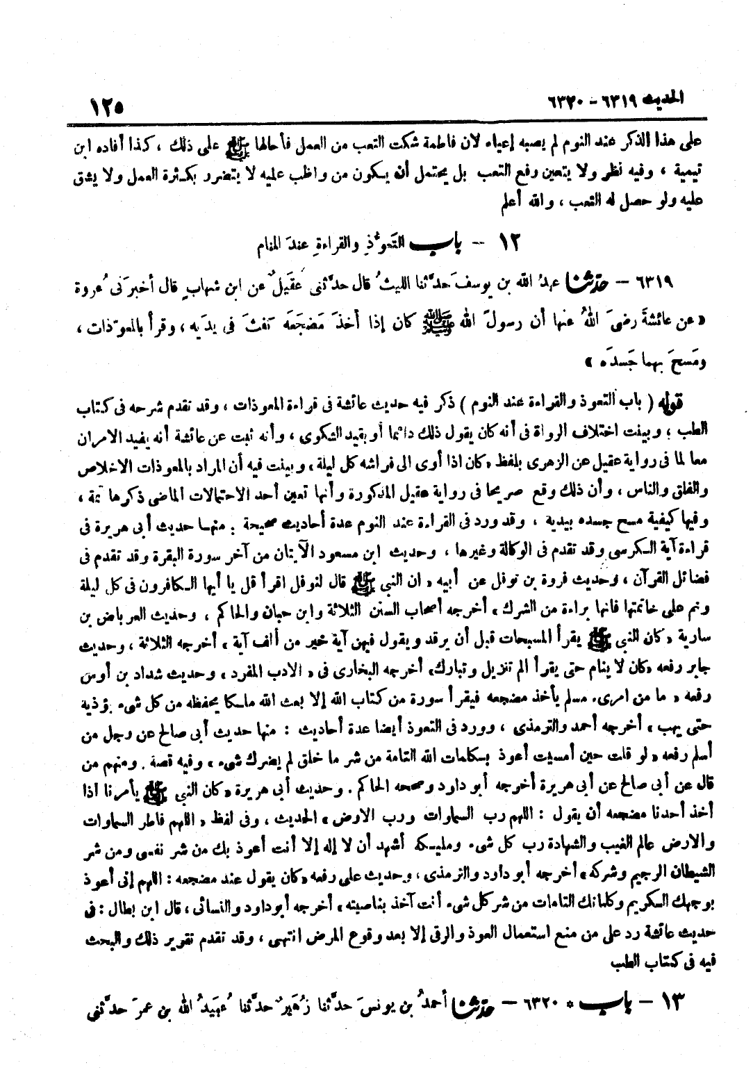 ذَكَرَ فِيهِ حَدِيثَ عَائِشَةَ فِي قِرَاءَةِ الْمُعَوِّذَاتِ وَقَدْ تَقَدَّمَ شَرْحُهُ فِي كِتَابِ الطِّبِّ وَبَيَّنْتُ اخْتِلَافَ الرُّوَاةِ فِي أَنَّهُ كَانَ يَقُولُ ذَلِكَ دَائِمًا أَوْ بِقَيْدِ الشَّكْوَى وَأَنَّهُ ثَبَتَ عَنْ عَائِشَةَ انه يُفِيد الامران مَعًا لِمَا فِي رِوَايَةِ عُقَيْلٍ عَنِ الزُّهْرِيِّ بِلَفْظِ كَانَ إِذَا أَوَى إِلَى فِرَاشِهِ كُلَّ لَيْلَةٍ وَبَيَّنْتُ فِيهِ أَنَّ الْمُرَادَ بِالْمُعَوِّذَاتِ الْإِخْلَاصُ وَالْفَلَقُ وَالنَّاسُ وَأَنَّ ذَلِكَ وَقَعَ صَرِيحًا فِي رِوَايَةِ عُقَيْلٍ الْمَذْكُورَةِ وَأَنَّهَا تُعَيِّنُ أَحَدَ الِاحْتِمَالَاتِ الْمَاضِي ذِكْرُهَا ثَمَّةَ وَفِيهَا كَيْفِيَّةُ مَسْحِ جَسَدِهِ بِيَدَيْهِ وَقَدْ وَرَدَ فِي الْقِرَاءَةِ عِنْدَ النَّوْمِ عِدَّةُ أَحَادِيثَ صَحِيحَةٌ مِنْهَا حَدِيثُ أَبِي هُرَيْرَةَ فِي قِرَاءَةِ آيَةِ الْكُرْسِيِّ وَقَدْ تَقَدَّمَ فِي الْوكَالَة وَغَيرهَا وَحَدِيث بن مَسْعُودٍ الْآيَتَانِ مِنْ آخِرِ سُورَةِ الْبَقَرَةِ وَقَدْ تَقَدَّمَ فِي فَضَائِلِ الْقُرْآنِ وَحَدِيثُ فَرْوَةَ بْنِ نَوْفَلٍ عَنْ أَبِيهِ أَنَّ النَّبِيَّ صَلَّى اللَّهُ عَلَيْهِ وَسَلَّمَ قَالَ لِنَوْفَلٍ اقْرَأْ قُلْ يَا أَيُّهَا الْكَافِرُونَ فِي كُلِّ لَيْلَةٍ وَنَمْ عَلَى خَاتِمَتِهَا فَإِنَّهَا بَرَاءَةٌ مِنَ الشِّرْكِ أَخْرَجَهُ أَصْحَابُ السّنَن الثَّلَاثَة وبن حِبَّانَ وَالْحَاكِمُ وَحَدِيثُ الْعِرْبَاضِ بْنِ سَارِيَةَ كَانَ النَّبِيُّ صَلَّى اللَّهُ عَلَيْهِ وَسَلَّمَ يَقْرَأُ الْمُسَبِّحَاتِ قَبْلَ أَنْ يَرْقُدَ وَيَقُولُ فِيهِنَّ آيَةٌ خَيْرٌ مِنْ أَلْفِ آيَةٍ أَخْرَجَهُ الثَّلَاثَةُ وَحَدِيثُ جَابِرٍ رَفَعَهُ كَانَ لَا يَنَامُ حَتَّى يَقْرَأَ الم تَنْزِيلُ وَتَبَارَكَ أَخْرَجَهُ الْبُخَارِيُّ فِي الْأَدَبِ الْمُفْرَدِ وَحَدِيثُ شَدَّادِ بْنِ أَوْسٍ رَفَعَهُ مَا مِنِ امْرِئٍ مُسْلِمٍ يَأْخُذُ مَضْجَعَهُ فَيَقْرَأُ سُورَةً مِنْ كِتَابِ اللَّهِ إِلَّا بَعَثَ اللَّهُ مَلَكًا يَحْفَظُهُ مِنْ كُلِّ شَيْءٍ يُؤْذِيهِ حَتَّى يَهُبَّ أَخْرَجَهُ أَحْمَدُ وَالتِّرْمِذِيُّ وَوَرَدَ فِي التَّعَوُّذِ أَيْضًا عِدَّةُ أَحَادِيثَ مِنْهَا حَدِيثُ أَبِي صَالِحٍ عَنْ رَجُلٍ مِنْ أَسْلَمَ رَفَعَهُ لَوْ قُلْتَ حِينَ أَمْسَيْتَ أَعُوذُ بِكَلِمَاتِ اللَّهِ التَّامَّةِ مِنْ شَرِّ مَا خَلَقَ لَمْ يَضُرَّكَ شَيْءٌ وَفِيهِ قِصَّةٌ وَمِنْهُمْ مَنْ قَالَ عَنْ أَبِي صَالِحٍ عَنْ أَبِي هُرَيْرَةَ أَخْرَجَهُ أَبُو دَاوُدَ وَصَحَّحَهُ الْحَاكِمُ وَحَدِيثُ أَبِي هُرَيْرَةَ كَانَ النَّبِيُّ صَلَّى اللَّهُ عَلَيْهِ وَسَلَّمَ يَأْمُرُنَا إِذَا أَخَذَ أَحَدُنَا مَضْجَعَهُ أَنْ يَقُولَ اللَّهُمَّ رَبَّ السَّمَاوَاتِ وَرَبَّ الْأَرْضِ الْحَدِيثَ وَفِي لَفْظِ اللَّهُمَّ فَاطِرَ السَّمَاوَاتِ وَالْأَرْضِ عَالِمَ الْغَيْبِ وَالشَّهَادَةِ رَبَّ كُلِّ شَيْءٍ وَمَلِيكَهُ أَشْهَدَ أَنْ لَا إِلَهَ إِلَّا أَنْتَ أَعُوذُ بِكَ مِنْ شَرِّ نَفْسِي وَمِنْ شَرِّ الشَّيْطَانِ الرَّجِيمِ وَشِرْكِهِ أَخْرَجَهُ أَبُو دَاوُدَ وَالتِّرْمِذِيُّ وَحَدِيثُ عَلِيٍّ رَفَعَهُ كَانَ يَقُولُ عِنْدَ مَضْجَعِهِ اللَّهُمَّ إِنِّي أَعُوذُ بِوَجْهِكَ الْكَرِيمِ وَكَلِمَاتِكَ التَّامَّاتِ مِنْ شَرِّ كُلِّ شَيْءٍ أَنْتَ آخِذٌ بِنَاصِيَتِهِ أَخْرَجَهُ أَبُو دَاوُد وَالنَّسَائِيّ قَالَ بن بَطَّالٍ فِي حَدِيثِ عَائِشَةَ رَدٌّ عَلَى مَنْ مَنَعَ اسْتِعْمَالَ الْعَوْذِ وَالرُّقَى إِلَّا بَعْدَ وُقُوعِ الْمَرَضِ انْتَهَى وَقَدْ تَقَدَّمَ تَقْرِيرُ ذَلِكَ وَالْبَحْثُ فِيهِ فِي كِتَابِ الطِّبِّ