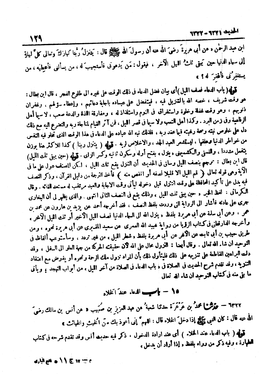 أَيْ بَيَانُ فَضْلِ الدُّعَاءِ فِي ذَلِكَ الْوَقْتِ عَلَى غَيْرِهِ إِلَى طُلُوع الْفجْر قَالَ بن بَطَّالٍ هُوَ وَقْتٌ شَرِيفٌ خَصَّهُ اللَّهُ بِالتَّنْزِيلِ فِيهِ فَيَتَفَضَّلُ عَلَى عِبَادِهِ بِإِجَابَةِ دُعَائِهِمْ وَإِعْطَاءِ سُؤْلِهِمْ وَغُفْرَانِ ذُنُوبِهِمْ وَهُوَ وَقْتُ غَفْلَةٍ وَخَلْوَةٍ وَاسْتِغْرَاقٍ فِي النَّوْمِ وَاسْتِلْذَاذٍ لَهُ وَمُفَارَقَةُ اللَّذَّةِ وَالدَّعَةُ صَعْبٌ لَا سِيَّمَا أَهْلُ الرَّفَاهِيَةِ وَفِي زَمَنِ الْبَرْدِ وَكَذَا أَهْلُ التَّعَبِ وَلَا سِيَّمَا فِي قِصَرِ اللَّيْلِ فَمَنْ آثَرَ الْقِيَامَ لِمُنَاجَاةِ رَبِّهِ وَالتَّضَرُّعِ إِلَيْهِ مَعَ ذَلِكَ دَلَّ عَلَى خُلُوصِ نِيَّتِهِ وَصِحَّةِ رَغْبَتِهِ فِيمَا عِنْدَ رَبِّهِ فَلِذَلِكَ نَبَّهَ اللَّهُ عِبَادَهُ عَلَى الدُّعَاءِ فِي هَذَا الْوَقْتِ الَّذِي تَخْلُو فِيهِ النَّفْسُ مِنْ خَوَاطِرِ الدُّنْيَا وَعُلَقِهَا لِيَسْتَشْعِرَ الْعَبْدُ الْجِدَّ وَالْإِخْلَاصَ لِرَبِّهِ قَوْلُهُ يَتَنَزَّلُ رَبُّنَا كَذَا لِلْأَكْثَرِ هُنَا بِوَزْنِ يَتَفَعَّلُ مُشَدَّدًا وَلِلنَّسَفِيِّ وَالْكُشْمِيهَنِيِّ يَنْزِلُ بِفَتْحِ أَوَّلِهِ وَسُكُونِ ثَانِيهِ وَكَسْرِ الزَّايِ قَوْلُهُ حِينَ يبْقى ثلث اللَّيْل قَالَ بن بَطَّالٍ تَرْجَمَ بِنِصْفِ اللَّيْلِ وَسَاقَ فِي الْحَدِيثِ أَنَّ التَّنَزُّلَ يَقَعُ ثُلُثَ اللَّيْلِ لَكِنَّ الْمُصَنِّفَ عَوَّلَ عَلَى مَا فِي الْآيَةِ وَهِيَ قَوْلُهُ تَعَالَى قُمِ اللَّيْلَ إِلَّا قَلِيلًا نِصْفَهُ أَوِ انقص مِنْهُ فَأَخَذَ التَّرْجَمَةَ مِنْ دَلِيلِ الْقُرْآنِ وَذِكْرُ النِّصْفِ فِيهِ يَدُلُّ عَلَى تَأْكِيدِ الْمُحَافَظَةِ عَلَى وَقْتِ التَّنَزُّلِ قَبْلَ دُخُولِهِ لِيَأْتِيَ وَقْتُ الْإِجَابَةِ وَالْعَبْدُ مُرْتَقِبٌ لَهُ مُسْتَعِدٌّ لِلِقَائِهِ وَقَالَ الْكِرْمَانِيُّ لَفْظُ الْخَبَرِ حِينَ يَبْقَى ثُلُثُ اللَّيْلِ وَذَلِكَ يَقَعُ فِي النِّصْفِ الثَّانِي انْتَهَى وَالَّذِي يَظْهَرُ لِي أَنَّ الْبُخَارِيَّ جَرَى عَلَى عَادَتِهِ فَأَشَارَ إِلَى الرِّوَايَةِ الَّتِي وَرَدَتْ بِلَفْظِ النِّصْفِ فَقَدْ أَخْرَجَهُ أَحْمَدُ عَنْ يَزِيدَ بْنِ هَارُونَ عَنْ مُحَمَّدِ بْنِ عُمَرَ وَعَنْ أَبِي سَلَمَةَ عَنْ أَبِي هُرَيْرَةَ بِلَفْظِ يَنْزِلُ اللَّهُ إِلَى السَّمَاءِ الدُّنْيَا نِصْفَ اللَّيْلِ الْأَخِيرِ أَوْ ثُلُثَ اللَّيْلِ الْآخِرِ وَأَخْرَجَهُ الدَّارَقُطْنِيُّ فِي كِتَابِ الرُّؤْيَا مِنْ رِوَايَةِ عُبَيْدِ اللَّهِ الْعُمَرِيِّ عَنْ سَعِيدٍ الْمَقْبُرِيِّ عَنْ أَبِي هُرَيْرَةَ نَحْوَهُ وَمِنْ طَرِيقِ حَبِيبِ بْنِ أَبِي ثَابِتٍ عَنِ الْأَغَرِّ عَنْ أَبِي هُرَيْرَةَ بِلَفْظِ شَطْرِ اللَّيْلِ مِنْ غَيْرِ تُرَدَّدٍ وَسَأَسْتَوْعِبُ أَلْفَاظَهُ فِي التَّوْحِيدِ إِنْ شَاءَ اللَّهُ تَعَالَى وَقَالَ أَيْضًا النُّزُولُ مُحَالٌ عَلَى اللَّهِ لِأَنَّ حَقِيقَتَهُ الْحَرَكَةُ مِنْ جِهَةِ الْعُلُوِّ إِلَى السُّفْلِ وَقَدْ دَلَّتِ الْبَرَاهِينُ الْقَاطِعَةُ عَلَى تَنْزِيهِهِ عَلَى ذَلِكَ فَلْيُتَأَوَّلْ ذَلِكَ بِأَنَّ الْمُرَادَ نُزُولُ مَلَكِ الرَّحْمَةِ وَنَحْوُهُ أَوْ يُفَوَّضُ مَعَ اعْتِقَادِ التَّنْزِيهِ وَقَدْ تَقَدَّمَ شَرْحُ الْحَدِيثِ فِي الصَّلَاةِ فِي بَاب الدُّعَاءِ فِي الصَّلَاةِ مِنْ آخِرِ اللَّيْلِ مِنْ أَبْوَابِ التَّهَجُّدِ وَيَأْتِي مَا بَقِيَ مِنْهُ فِي كِتَابِ التَّوْحِيدِ إِنْ شَاءَ اللَّهُ تَعَالَى قَوْلُهُ بَابُ الدُّعَاءِ عِنْدَ الْخَلَاءِ أَيْ عِنْدَ إِرَادَةِ الدُّخُولِ ذَكَرَ فِيهِ حَدِيثَ أَنَسٍ وَقَدْ تَقَدَّمَ شَرْحُهُ فِي كِتَابِ الطَّهَارَةِ وَفِيهِ ذِكْرُ مَنْ رَوَاهُ بِلَفْظِ إِذَا أَرَادَ أَنْ يَدْخُلَ