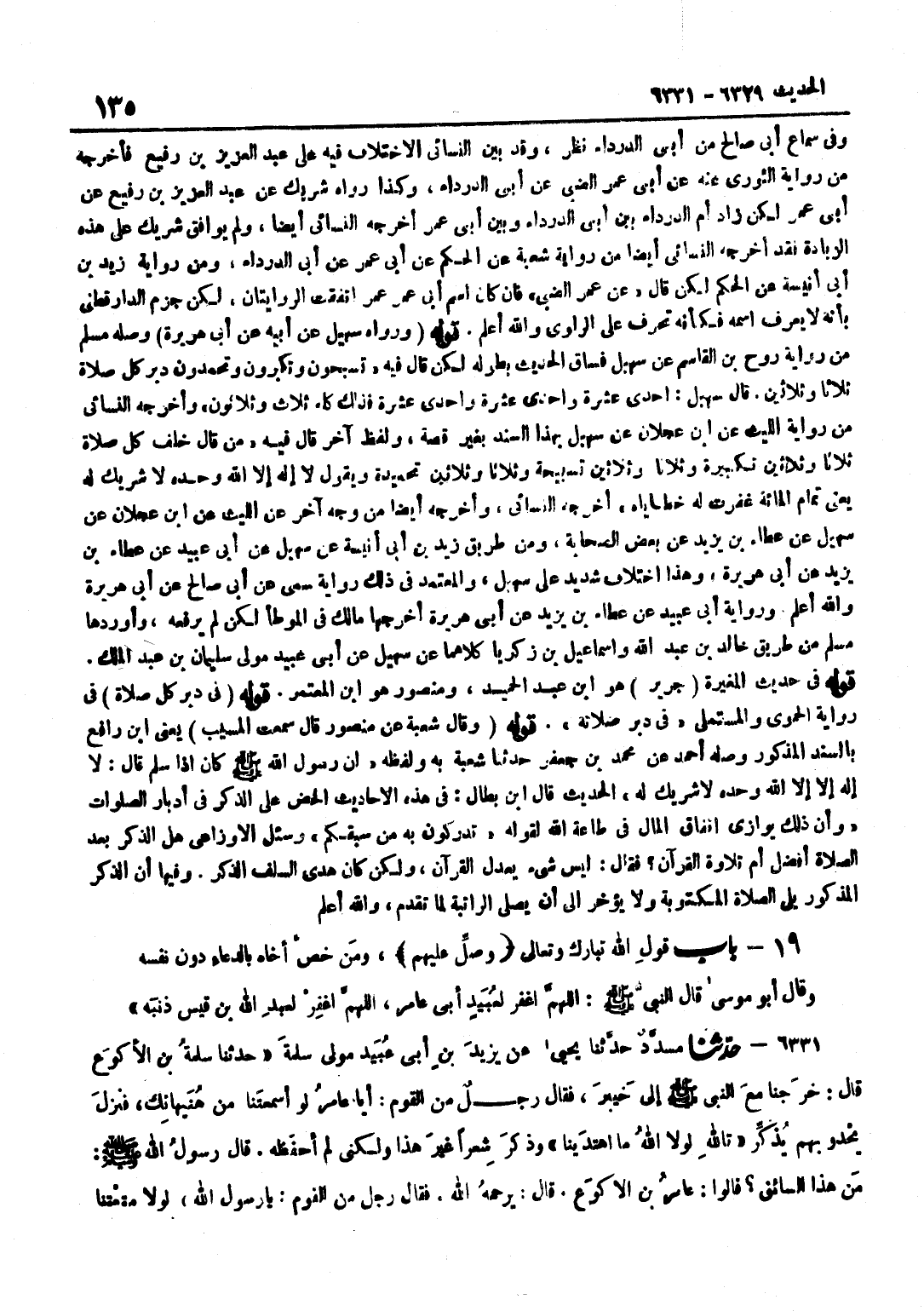 وَفِي سَمَاعِ أَبِي صَالِحٍ مِنْ أَبِي الدَّرْدَاءِ نَظَرٌ وَقَدْ بَيَّنَ النَّسَائِيُّ الِاخْتِلَافَ فِيهِ عَلَى عَبْدِ الْعَزِيزِ بْنِ رُفَيْعٍ فَأَخْرَجَهُ مِنْ رِوَايَةِ الثَّوْرِيِّ عَنْهُ عَنْ أَبِي عُمَرَ الضَّبِّيِّ عَنْ أَبِي الدَّرْدَاءِ وَكَذَا رَوَاهُ شَرِيكٌ عَنْ عَبْدِ الْعَزِيزِ بْنِ رُفَيْعٍ عَنْ أَبِي عُمَرَ لَكِنْ زَادَ أُمَّ الدَّرْدَاءِ بَيْنَ أَبِي الدَّرْدَاءِ وَبَيْنَ أَبِي عُمَرَ أَخْرَجَهُ النَّسَائِيُّ أَيْضًا وَلَمْ يُوَافِقْ شَرِيكٌ عَلَى هَذِهِ الزِّيَادَةِ فَقَدْ أَخْرَجَهُ النَّسَائِيُّ أَيْضًا مِنْ رِوَايَةِ شُعْبَةَ عَنِ الْحَكَمِ عَنْ أَبِي عُمَرَ عَنْ أَبِي الدَّرْدَاءِ وَمِنْ رِوَايَةِ زَيْدِ بْنِ أَبِي أُنَيْسَةَ عَنِ الْحَكَمِ لَكِنْ قَالَ عَنْ عُمَرَ الضَّبِّيِّ فَإِنْ كَانَ اسْمُ أَبِي عُمَرَ عُمَرَ اتَّفَقَتِ الرِّوَايَتَانِ لَكِنْ جَزَمَ الدَّارَقُطْنِيُّ بِأَنَّهُ لَا يَعْرِفُ اسْمَهُ فَكَأَنَّهُ تَحَرُّفٌ عَلَى الرَّاوِي وَاللَّهُ أَعْلَمُ قَوْلُهُ وَرَوَاهُ سُهَيْلٌ عَنْ أَبِيهِ عَنْ أَبِي هُرَيْرَةَ وَصَلَهُ مُسْلِمٌ مِنْ رِوَايَةِ رَوْحِ بْنِ الْقَاسِمِ عَنْ سُهَيْلٍ فَسَاقَ الْحَدِيثَ بِطُولِهِ لَكِنْ قَالَ فِيهِ تُسَبِّحُونَ وَتُكَبِّرُونَ وَتَحْمَدُونَ دُبُرَ كُلِّ صَلَاةٍ ثَلَاثًا وَثَلَاثِينَ قَالَ سُهَيْلٌ إِحْدَى عَشْرَةَ وَإِحْدَى عَشْرَةَ وَإِحْدَى عَشْرَةَ فَذَلِكَ كُلُّهُ ثَلَاثٌ وَثَلَاثُونَ وَأَخْرَجَهُ النَّسَائِيُّ من رِوَايَة اللَّيْث عَن بن عَجْلَانَ عَنْ سُهَيْلٍ بِهَذَا السَّنَدِ بِغَيْرِ قِصَّةٍ وَلَفْظٌ آخَرُ قَالَ فِيهِ مَنْ قَالَ خَلْفَ كُلِّ صَلَاةٍ ثَلَاثًا وَثَلَاثِينَ تَكْبِيرَةً وَثَلَاثًا وَثَلَاثِينَ تَسْبِيحَةً وَثَلَاثًا وَثَلَاثِينَ تَحْمِيدَةً وَيَقُولُ لَا إِلَهَ إِلَّا اللَّهُ وَحْدَهُ لَا شَرِيكَ لَهُ يَعْنِي تَمَامَ الْمِائَةِ غُفِرَتْ لَهُ خَطَايَاهُ أَخْرَجَهُ النَّسَائِيُّ وَأَخْرَجَهُ أَيْضًا مِنْ وَجْهٍ آخَرَ عَنَ اللَّيْثِ عَن بن عَجْلَانَ عَنْ سُهَيْلٍ عَنْ عَطَاءِ بْنِ يَزِيدَ عَنْ بَعْضِ الصَّحَابَةِ وَمِنْ طَرِيقِ زَيْدِ بْنِ أَبِي أُنَيْسَةَ عَنْ سُهَيْلٍ عَنْ أَبِي عُبَيْدٍ عَنْ عَطَاءِ بْنِ يَزِيدَ عَنْ أَبِي هُرَيْرَةَ وَهَذَا اخْتِلَافٌ شَدِيدٌ عَلَى سُهَيْلٍ وَالْمُعْتَمَدُ فِي ذَلِكَ رِوَايَةُ سُمَيٍّ عَنْ أَبِي صَالِحٍ عَنْ أَبِي هُرَيْرَةَ وَاللَّهُ أَعْلَمُ وَرِوَايَةُ أَبِي عُبَيْدٍ عَنْ عَطَاءِ بْنِ يَزِيدَ عَنْ أَبِي هُرَيْرَةَ أَخْرَجَهَا مَالِكٌ فِي الْمُوَطَّأِ لَكِنْ لَمْ يَرْفَعْهُ وَأَوْرَدَهَا مُسْلِمٌ مِنْ طَرِيقِ خَالِدِ بْنِ عَبْدِ اللَّهِ وَإِسْمَاعِيلَ بْنِ زَكَرِيَّا كِلَاهُمَا عَنْ سُهَيْلٍ عَنْ أَبِي عُبَيْدٍ مَوْلَى سُلَيْمَانَ بْنِ عَبْدِ الْمَلِكِ قَوْلُهُ فِي حَدِيثِ الْمُغِيرَةِ
