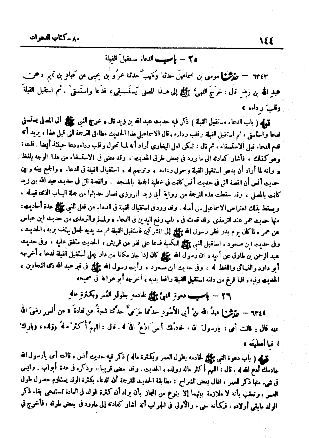 ذَكَرَ فِيهِ حَدِيث عبد الله بن زيد قَالَ خَرَجَ النَّبِيُّ صَلَّى اللَّهُ عَلَيْهِ وَسَلَّمَ إِلَى الْمصلى يَسْتَسْقِي فَدَعَا واستسقى ثمَّ اسْتقْبل الْقبْلَة وقلب رِدَاءَهُ قَالَ الْإِسْمَاعِيلِيُّ هَذَا الْحَدِيثُ مُطَابِقٌ لِلتَّرْجَمَةِ الَّتِي قَبْلَ هَذَا يُرِيدُ أَنَّهُ قَدَّمَ الدُّعَاءَ قَبْلَ الِاسْتِسْقَاءِ ثُمَّ قَالَ لَكِنْ لَعَلَّ الْبُخَارِيَّ أَرَادَ أَنَّهُ لَمَّا تَحَوَّلَ وَقَلَبَ رِدَاءَهُ دَعَا حِينَئِذٍ أَيْضًا قُلْتُ وَهُوَ كَذَلِكَ فَأَشَارَ كَعَادَتِهِ إِلَى مَا وَرَدَ فِي بَعْضِ طُرُقِ الْحَدِيثِ وَقَدْ مَضَى فِي الِاسْتِسْقَاءِ مِنْ هَذَا الْوَجْهِ بِلَفْظِ وَإِنَّهُ لَمَّا أَرَادَ أَنْ يَدْعُوَ اسْتَقْبَلَ الْقِبْلَةَ وَحَوَّلَ رِدَاءَهُ وَتَرْجَمَ لَهُ اسْتِقْبَالُ الْقِبْلَةِ فِي الدُّعَاءِ وَالْجَمْعُ بَيْنَهُ وَبَيْنَ حَدِيثِ أَنَسٍ أَنَّ الْقِصَّةَ الَّتِي فِي حَدِيثِ أَنَسٍ كَانَتْ فِي خُطْبَةِ الْجُمُعَةِ بِالْمَسْجِدِ وَالْقِصَّةُ الَّتِي فِي حَدِيثِ عَبْدِ اللَّهِ بْنِ زَيْدٍ كَانَتْ بِالْمُصَلَّى وَقَدْ سَقَطَتْ هَذِهِ التَّرْجَمَةُ مِنْ رِوَايَةِ أَبِي زَيْدٍ الْمَرْوَزِيِّ فَصَارَ حَدِيثُهَا مِنْ جُمْلَةِ الْبَابِ الَّذِي قَبْلَهُ وَيَسْقُطُ بِذَلِكَ اعْتِرَاضُ الْإِسْمَاعِيلِيِّ مِنْ أَصْلِهِ وَقَدْ وَرَدَ فِي اسْتِقْبَالِ الْقِبْلَةِ فِي الدُّعَاءِ مِنْ فِعْلِ النَّبِيِّ صَلَّى اللَّهُ عَلَيْهِ وَسَلَّمَ عِدَّةُ أَحَادِيثَ مِنْهَا حَدِيثُ عُمَرَ عِنْدَ التِّرْمِذِيِّ وَقَدْ قَدَّمْتُهُ فِي بَابِ رَفْعِ الْيَدَيْنِ فِي الدُّعَاء وَلمُسلم وَالتِّرْمِذِيّ من حَدِيث بن عَبَّاسٍ عَنْ عُمَرُ لَمَّا كَانَ يَوْمُ بَدْرٍ نَظَرَ رَسُولُ اللَّهِ صَلَّى اللَّهُ عَلَيْهِ وَسَلَّمَ إِلَى الْمُشْرِكِينَ فَاسْتَقْبَلَ الْقِبْلَةَ ثُمَّ مَدَّ يَدَيْهِ فَجعل يَهْتِف بربه الحَدِيث وَفِي حَدِيث بن مَسْعُودٍ اسْتَقْبَلَ النَّبِيُّ صَلَّى اللَّهُ عَلَيْهِ وَسَلَّمَ الْكَعْبَةَ فَدَعَا عَلَى نَفَرٍ مِنْ قُرَيْشٍ الْحَدِيثُ مُتَّفَقٌ عَلَيْهِ وَفِي حَدِيثِ عَبْدِ الرَّحْمَنِ بْنِ طَارِقٍ عَنْ أَبِيهِ أَنَّ رَسُولَ اللَّهِ صَلَّى اللَّهُ عَلَيْهِ وَسَلَّمَ كَانَ إِذَا جَازَ مَكَانًا مِنْ دَارِ يَعْلَى اسْتَقْبَلَ الْقِبْلَةَ فَدَعَا أَخْرَجَهُ أَبُو دَاوُدَ وَالنَّسَائِيُّ وَاللَّفْظُ لَهُ وَفِي حَدِيثِ بن مَسْعُودٍ رَأَيْتُ رَسُولَ اللَّهِ صَلَّى اللَّهُ عَلَيْهِ وَسَلَّمَ فِي قَبْرِ عَبْدِ اللَّهِ ذِي النِّجَادَيْنِ الْحَدِيثَ وَفِيهِ فَلَمَّا فَرَغَ مِنْ دَفْنِهِ اسْتَقْبَلَ الْقِبْلَةَ رَافِعًا يَدَيْهِ أَخْرَجَهُ أَبُو عَوَانَةَ فِي صَحِيحه قَوْلُهُ بَابُ دَعْوَةِ النَّبِيِّ صَلَّى اللَّهُ عَلَيْهِ وَسَلَّمَ لِخَادِمِهِ بِطُولِ الْعُمُرِ وَبِكَثْرَةِ مَالِهِ ذَكَرَ فِيهِ حَدِيثَ أَنَسٍ قَالَتْ أُمِّي يَا رَسُولَ الله خادمك ادْع الله لَهُ قَالَ اللَّهُمَّ أَكْثِرْ مَالَهُ وَوَلَدَهُ الْحَدِيثَ حَدِيث أَنَس قَالَتْ أُمِّي يَا رَسُول الله خادمك ادْع الله لَهُ قَالَ اللَّهُمَّ أَكثر مَاله وَولده الحَدِيث وَقَدْ مَضَى قَرِيبًا وَذَكَرَهُ فِي عِدَّةِ أَبْوَابٍ وَلَيْسَ فِي شَيْءٍ مِنْهَا ذِكْرُ الْعُمُرِ فَقَالَ بَعْضُ الشُّرَّاحِ مُطَابَقَةُ الْحَدِيثِ لِلتَّرْجَمَةِ أَنَّ الدُّعَاءَ بِكَثْرَةِ الْوَلَدِ يَسْتَلْزِمُ حُصُولَ طُولِ الْعُمُرِ وَتُعُقِّبَ بِأَنَّهُ لَا مُلَازَمَةَ بَيْنَهُمَا إِلَّا بِنَوْعٍ مِنَ الْمَجَازِ بِأَنْ يُرَادَ أَنَّ كَثْرَةَ الْوَلَدِ فِي الْعَادَةِ تَسْتَدْعِي بَقَاءَ ذِكْرِ الْوَلَدِ مَا بَقِيَ أَوْلَادُهُ فَكَأَنَّهُ حَيٌّ وَالْأَوْلَى فِي الْجَوَابِ أَنَّهُ أَشَارَ كَعَادَتِهِ إِلَى مَا و