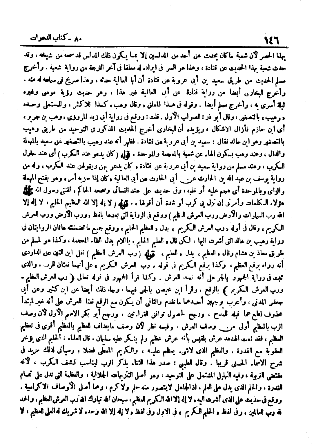 بِهَذَا الْحَصْرِ لِأَنَّ شُعْبَةَ مَا كَانَ يُحَدِّثُ عَنْ أَحَدٍ مِنَ الْمُدَلِّسِينَ إِلَّا بِمَا يَكُونُ ذَلِكَ الْمُدَلِّسُ قَدْ سَمِعَهُ مِنْ شَيْخِهِ وَقَدْ حَدَّثَ شُعْبَةُ بِهَذَا الْحَدِيثِ عَنْ قَتَادَةَ وَهَذَا هُوَ السِّرُّ فِي إِيرَادِهِ لَهُ مُعَلَّقًا فِي آخِرِ التَّرْجَمَةِ مِنْ رِوَايَةِ شُعْبَةَ وَأَخْرَجَ مُسْلِمٌ الْحَدِيثَ مِنْ طَرِيقِ سَعِيدِ بْنِ أَبِي عَرُوبَةَ عَنْ قَتَادَةَ أَنَّ أَبَا الْعَالِيَةِ حَدَّثَهُ وَهَذَا صَرِيحٌ فِي سَمَاعِهِ لَهُ مِنْهُ وَأَخْرَجَ الْبُخَارِيُّ أَيْضًا مِنْ رِوَايَةِ قَتَادَةَ عَنْ أَبِي الْعَالِيَةِ غَيْرَ هَذَا وَهُوَ حَدِيثُ رُؤْيَةِ مُوسَى وَغَيْرِهِ لَيْلَة أسرى بِهِ واخرج مُسْلِمٌ أَيْضًا وَقَوْلُهُ فِي هَذَا الْمُعَلَّقِ وَقَالَ وَهْبٌ كَذَا لِلْأَكْثَرِ وَلِلْمُسْتَمْلِي وَحْدَهُ وُهَيْبٌ بِالتَّصْغِيرِ وَقَالَ أَبُو ذَرٍّ الصَّوَابُ الْأَوَّلُ قُلْتُ وَوَقَعَ فِي رِوَايَةِ أَبِي زَيْدٍ الْمَرْوَزِيِّ وَهْبُ بْنُ جرير أَي بن حَازِمٍ فَأَزَالَ الْإِشْكَالَ وَيُؤَيِّدُهُ أَنَّ الْبُخَارِيَّ أَخْرَجَ الْحَدِيثَ الْمَذْكُورَ فِي التَّوْحِيدِ مِنْ طَرِيقِ وُهَيْبٍ بِالتَّصْغِيرِ وَهُوَ بن خَالِدٍ فَقَالَ سَعِيدُ بْنُ أَبِي عَرُوبَةَ عَنْ قَتَادَةَ فَظَهَرَ أَنَّهُ عِنْدَ وُهَيْبٍ بِالتَّصْغِيرِ عَنْ سَعِيدٍ بِالْمُهْمَلَةِ وَالدَّالِ وَعِنْدَ وَهْبٍ بِسُكُونِ الْهَاءِ عَنْ شُعْبَةَ بِالْمُعْجَمَةِ وَالْمُوَحَّدَةِ قَوْلُهُ كَانَ يَدْعُو عِنْدَ الْكَرْبِ أَيْ عِنْدَ حُلُولِ الْكَرْبِ وَعِنْدَ مُسْلِمٍ مِنْ رِوَايَةِ سَعِيدِ بْنِ أَبِي عَرُوبَةَ عَنْ قَتَادَةَ كَانَ يَدْعُو بِهِنَّ وَيَقولُهُنَّ عِنْدَ الْكَرْبِ وَلَهُ مِنْ رِوَايَةِ يُوسُفَ بْنِ عَبْدِ اللَّهِ بْنِ الْحَارِثِ عَنْ أَبِي الْحَارِثِ عَنْ أَبِي الْعَالِيَةِ كَانَ إِذَا حَزَبَهُ أَمْرٌ وَهُوَ بِفَتْحِ الْمُهْمَلَةِ وَالزَّايِ وَبِالْمُوَحَّدَةِ أَيْ هَجَمَ عَلَيْهِ أَوْ غَلَبَهُ وَفِي حَدِيثِ عَلِيٍّ عِنْدَ النَّسَائِيِّ وَصَحَّحَهُ الْحَاكِمُ لَقَّنَنِي رَسُولُ اللَّهِ صَلَّى اللَّهُ عَلَيْهِ وَسَلَّمَ هَؤُلَاءِ الْكَلِمَاتِ وَأَمَرَنِي إِنْ نَزَلَ بِي كَرْبٌ أَوْ شِدَّةٌ أَنْ أَقُولَهُا قَوْلُهُ لَا إِلَهَ إِلَّا اللَّهُ الْعَظِيمُ الْحَلِيمُ لَا إِلَهَ إِلَّا اللَّهُ رَبُّ السَّمَاوَاتِ وَالْأَرْضِ وَرَبُّ الْعَرْشِ الْعَظِيمِ وَوَقَعَ فِي الرِّوَايَةِ الَّتِي بَعْدَهَا بِلَفْظِ وَرَبُّ الْأَرْضِ وَرَبُّ الْعَرْشِ الْكَرِيمِ وَقَالَ فِي أَوَّلِهِ رَبُّ الْعَرْشِ الْكَرِيمِ بَدَلَ الْعَظِيمُ الْحَلِيمُ وَوَقَعَ جَمِيعُ مَا تَضَمَّنَتْهُ هَاتَانِ الرِّوَايَتَانِ فِي رِوَايَةِ وُهَيْبِ بْنِ خَالِدٍ الَّتِي أَشَرْتُ إِلَيْهَا لَكِنْ قَالَ الْعَلِيمُ الْحَلِيمُ بِاللَّامِ بَدَلَ الظَّاءِ الْمُعْجَمَةِ وَكَذَا هُوَ لِمُسْلِمٍ مِنْ طَرِيقِ مُعَاذِ بْنِ هِشَامٍ وَقَالَ الْعَظِيمُ بَدَلَ الْعَلِيمُ قَوْله رب الْعَرْش الْعَظِيم نقل بن التِّينِ عَنِ الدَّاوُدِيِّ أَنَّهُ رَوَاهُ بِرَفْعِ الْعَظِيمِ وَكَذَا بِرَفْعِ الْكَرِيمِ فِي قَوْلِهِ رَبُّ الْعَرْشِ الْكَرِيمُ عَلَى أَنَّهُمَا نَعْتَانِ لِلرَّبِّ وَالَّذِي ثَبَتَ فِي رِوَايَةِ الْجُمْهُورِ بِالْجَرِّ عَلَى أَنَّهُ نَعْتٌ لِلْعَرْشِ وَكَذَا قَرَأَ الْجُمْهُورُ فِي قَوْلِهِ تَعَالَى رب الْعَرْش الْعَظِيم وَرب الْعَرْش الْكَرِيم بِالرَّفْع وَقَرَأَ بن مُحَيْصِنٍ بِالْجَرِّ فِيهِمَا وَجَاءَ ذَلِكَ أَيْضًا عَنِ بن كَثِيرٍ وَعَنْ أَبِي جَعْفَرٍ الْمَدَنِيِّ وَأُعْرِبَ بِوَجْهَيْنِ أَحَدُهُمَا مَا تَقَدَّمَ وَالثَّانِي أَنْ يَكُونَ مَعَ الرَّفْعِ نَعْتًا لِلْعَرْشِ عَلَى 