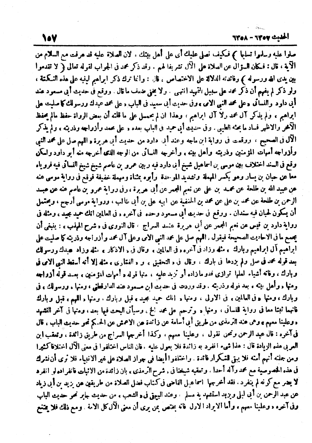 صلوا عَلَيْهِ وسلموا تَسْلِيمًا فَكَيْفَ نُصَلِّي عَلَيْكَ أَيْ عَلَى أَهْلِ بَيْتكَ لِأَنَّ الصَّلَاةَ عَلَيْهِ قَدْ عُرِفَتْ مَعَ السَّلَامِ مِنَ الْآيَةِ قَالَ فَكَانَ السُّؤَالُ عَنِ الصَّلَاةِ على الْآل تَشْرِيفًا لَهُم وَقد ذكر مُحَمَّد فِي الْجَوَابِ لِقولِهِ تَعَالَى لَا تُقَدِّمُوا بَيْنَ يَدي الله وَرَسُوله وَفَائِدَتُهُ الدَّلَالَةُ عَلَى الِاخْتِصَاصِ قَالَ وَإِنَّمَا تَرَكَ ذِكْرَ إِبْرَاهِيمَ لِيُنَبِّهَ عَلَى هَذِهِ النُّكْتَةِ وَلَوْ ذَكَرَ لَمْ يُفْهَمْ أَنَّ ذِكْرَ مُحَمَّدٍ عَلَى سَبِيلِ التَّمْهِيدِ انْتَهَى وَلَا يَخْفَى ضَعْفُ مَا قَالَ وَوَقَعَ فِي حَدِيثِ أَبِي مَسْعُودٍ عِنْدَ أَبِي دَاوُدَ وَالنَّسَائِيِّ عَلَى مُحَمَّدٍ النَّبِيِّ الْأُمِّيِّ وَفِي حَدِيثِ أَبِي سَعِيدٍ فِي الْبَابِ عَلَى مُحَمَّدٍ عَبْدِكَ وَرَسُولِكَ كَمَا صَلَّيْتَ عَلَى إِبْرَاهِيمَ وَلَمْ يَذْكُرْ آلَ مُحَمَّدٍ وَلَا آلَ إِبْرَاهِيمَ وَهَذَا إِنْ لَمْ يُحْمَلْ عَلَى مَا قُلْتُهُ أَنَّ بَعْضَ الرُّوَاةِ حَفِظَ مَا لَمْ يَحْفَظْ الْآخَرُ وَالْأَظْهَرُ فَسَادُ مَا بَحَثَهُ الطِّيبِيُّ وَفِي حَدِيثِ أَبِي حُمَيْدٍ فِي الْبَابِ بَعْدَهُ عَلَى مُحَمَّدٍ وَأَزْوَاجِهِ وَذُرِّيَّتِهِ وَلَمْ يَذْكُرِ الْآلَ فِي الصَّحِيح وَوَقعت فِي رِوَايَة بن مَاجَهْ وَعِنْدَ أَبِي دَاوُدَ مِنْ حَدِيثِ أَبِي هُرَيْرَةَ اللَّهُمَّ صَلِّ عَلَى مُحَمَّدٍ النَّبِيِّ وَأَزْوَاجِهِ أُمَّهَاتِ الْمُؤْمِنِينَ وَذُرِّيَّتِهِ وَأَهْلِ بَيْتِهِ وَأَخْرَجَهُ النَّسَائِيُّ مِنَ الْوَجْهِ الَّذِي أَخْرَجَهُ مِنْهُ أَبُو دَاوُدَ وَلَكِنْ وَقَعَ فِي السَّنَدِ اخْتِلَافٌ بَيْنَ مُوسَى بْنِ إِسْمَاعِيلَ شَيْخِ أَبِي دَاوُدَ فِيهِ وَبَيْنَ عَمْرِو بْنِ عَاصِمٍ شَيْخِ شَيْخِ النَّسَائِيِّ فِيهِ فَرَوَيَاهُ مَعًا عَنْ حِبَّانَ بْنِ يَسَارٍ وَهُوَ بِكَسْرِ الْمُهْمَلَةِ وَتَشْدِيدِ الْمُوَحَّدَةِ وَأَبُوهُ بِمُثَنَّاةٍ وَمُهْمَلَةٍ خَفِيفَةٍ فَوَقَعَ فِي رِوَايَةِ مُوسَى عَنْهُ عَنْ عُبَيْدِ اللَّهِ بْنِ طَلْحَةَ عَنْ مُحَمَّدِ بْنِ عَلِيٍّ عَنْ نُعَيْمٍ الْمُجْمِرِ عَنْ أَبِي هُرَيْرَةَ وَفِي رِوَايَةِ عَمْرِو بْنِ عَاصِمٍ عَنْهُ عَنْ عَبْدِ الرَّحْمَنِ بْنِ طَلْحَةَ عَنْ مُحَمَّدِ بْنِ عَليّ عَن مُحَمَّد بن الْحَنَفِيَّةِ عَنْ أَبِيهِ عَلِيِّ بْنِ أَبِي طَالِبٍ وَرِوَايَةُ مُوسَى أَرْجَحُ وَيَحْتَمِلُ أَنْ يَكُونَ لِحِبَّانَ فِيهِ سَنَدَانِ وَوَقَعَ فِي حَدِيثِ أَبِي مَسْعُودٍ وَحْدَهُ فِي آخِرِهِ فِي الْعَالَمِينَ إِنَّكَ حَمِيدٌ مَجِيدٌ وَمِثْلُهُ فِي رِوَايَةِ دَاوُدَ بْنِ قَيْسٍ عَنْ نُعَيْمٍ الْمُجْمِرِ عَنْ أَبِي هُرَيْرَةَ عِنْدَ السَّرَّاجِ قَالَ النَّوَوِيُّ فِي شَرْحِ الْمُهَذَّبِ يَنْبَغِي أَنْ يَجْمَعَ مَا فِي الْأَحَادِيثِ الصَّحِيحَةِ فَيَقُولُ اللَّهُمَّ صَلِّ عَلَى مُحَمَّدٍ النَّبِيِّ الْأُمِّيِّ وَعَلَى آلِ مُحَمَّدٍ وَأَزْوَاجِهِ وَذُرِّيَّتِهِ كَمَا صَلَّيْتَ عَلَى إِبْرَاهِيم آل إِبْرَاهِيمَ وَبَارِكْ مِثْلَهُ وَزَادَ فِي آخِرِهِ فِي الْعَالَمِينَ وَقَالَ فِي الْأَذْكَارِ مِثْلَهُ وَزَادَ عَبْدِكَ وَرَسُولك بعد قَوْله مُحَمَّد فِي صل وَلَمْ يَزِدْهَا فِي بَارِكْ وَقَالَ فِي التَّحْقِيقِ والفتاوى مِثْلَهُ إِلَّا أَنَّهُ أَسْقَطَ النَّبِيِّ الْأُمِّيِّ فِي وَبَارِكْ وَفَاتَهُ أَشْيَاءُ لَعَلَّهَا تُوَازِي قَدْرَ مَا زَادَهُ أَوْ تَزِيدُ عَلَيْهِ مِنْهَا قَوْلُهُ أُمَّهَاتِ الْمُؤْمِنِينَ بَعْدَ قَوْلِهِ أَزْوَاجِهِ وَمِنْهَا وَأَهْلِ بَيْتِهِ بَعْدَ قَوْلِهِ وَذُرِّيَّتِهِ وَقَدْ وَرَدَتْ فِي حَدِيثِ بن مَسْعُودٍ عِنْدَ الدَّارَقُطْنِيِّ وَمِنْهَا وَرَسُولِكَ فِي