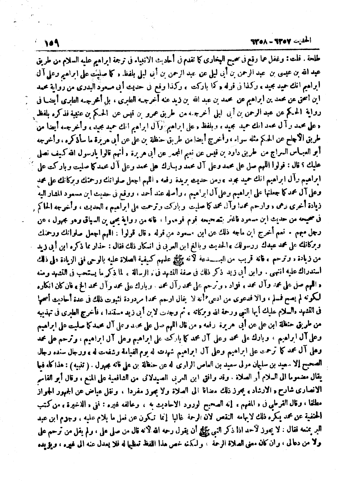 طَلْحَةَ قُلْتُ وَغَفَلَ عَمَّا وَقَعَ فِي صَحِيحِ الْبُخَارِيِّ كَمَا تَقَدَّمَ فِي أَحَادِيثِ الْأَنْبِيَاءِ فِي تَرْجَمَةِ إِبْرَاهِيمَ عَلَيْهِ السَّلَامُ مِنْ طَرِيقِ عَبْدُ اللَّهِ بْنُ عِيسَى بْنِ عَبْدِ الرَّحْمَنِ بن أَبِي لَيْلَى عَنْ عَبْدِ الرَّحْمَنِ بْنِ أَبِي لَيْلَى بِلَفْظِ كَمَا صَلَّيْتَ عَلَى إِبْرَاهِيمَ وَعَلَى آلِ إِبْرَاهِيمَ إِنَّكَ حَمِيدٌ مَجِيدٌ وَكَذَا فِي قَوْلِهِ كَمَا بَارَكْتَ وَكَذَا وَقَعَ فِي حَدِيثِ أَبِي مَسْعُودٍ الْبَدْرِيِّ مِنْ رِوَايَةِ مُحَمَّدِ بْنِ إِسْحَاقَ عَنْ مُحَمَّدِ بْنِ إِبْرَاهِيمَ عَنْ مُحَمَّدِ بْنِ عَبْدِ اللَّهِ بْنِ زَيْدِ عَنْهُ أَخْرَجَهُ الطَّبَرِيُّ بَلْ أَخْرَجَهُ الطَّبَرِيُّ أَيْضًا فِي رِوَايَةِ الْحَكَمِ عَنْ عَبْدِ الرَّحْمَنِ بْنِ أَبِي لَيْلَى أَخْرَجَهُ مِنْ طَرِيقِ عَمْرِو بْنِ قَيْسٍ عَنِ الْحَكَمِ بْنِ عُتَيْبَةَ فَذَكَرَهُ بِلَفْظِ عَلَى مُحَمَّدٍ وَآلِ مُحَمَّدٍ إِنَّكَ حَمِيدٌ مَجِيدٌ وَبِلَفْظِ عَلَى إِبْرَاهِيمَ وَآلِ إِبْرَاهِيمَ إِنَّكَ حَمِيدٌ مَجِيدٌ وَأَخْرَجَهُ أَيْضًا مِنْ طَرِيقِ الْأَجْلَحِ عَنِ الْحَكَمِ مِثْلَهُ سَوَاءً وَأَخْرَجَ أَيْضًا مِنْ طَرِيقِ حَنْظَلَةَ بْنِ عَلِيٍّ عَنْ أَبِي هُرَيْرَةَ مَا سَأَذْكُرُهُ وَأَخْرَجَهُ أَبُو الْعَبَّاسِ السَّرَّاجُ مِنْ طَرِيقِ دَاوُدَ بْنِ قَيْسٍ عَنْ نُعَيْمٍ الْمُجْمِرِ عَنْ أَبِي هُرَيْرَةَ أَنَّهُمْ قَالُوا يَا رَسُولَ اللَّهِ كَيْفَ نُصَلِّي عَلَيْكَ قَالَ قُولُوا اللَّهُمَّ صَلِّ عَلَى مُحَمَّدٍ وَعَلَى آلِ مُحَمَّدٍ وَبَارِكْ عَلَى مُحَمَّدٍ وَعَلَى آلِ مُحَمَّدٍ كَمَا صَلَّيْتَ وَبَارَكْتَ عَلَى إِبْرَاهِيمَ وَآلِ إِبْرَاهِيمَ إِنَّكَ حَمِيدٌ مَجِيدٌ وَمِنْ حَدِيثِ بُرَيْدَةَ رَفَعَهُ اللَّهُمَّ اجْعَلْ صَلَوَاتِكَ وَرَحْمَتَكَ وَبَرَكَاتِكَ عَلَى مُحَمَّدٍ وَعَلَى آلِ مُحَمَّدٍ كَمَا جَعَلْتَهَا عَلَى إِبْرَاهِيمَ وَعَلَى آلِ إِبْرَاهِيمَ وَأَصْلُهُ عِنْدَ احْمَد وَوَقع فِي حَدِيث بن مَسْعُودٍ الْمُشَارِ إِلَيْهِ زِيَادَةٌ أُخْرَى وَهِيَ وَارْحَمْ مُحَمَّدًا وَآلَ مُحَمَّدٍ كَمَا صَلَّيْتَ وَبَارَكْتَ وَتَرَحَّمْتَ عَلَى إِبْرَاهِيمَ الْحَدِيثَ وَأَخْرَجَهُ الْحَاكِمُ فِي صَحِيحِهِ من حَدِيث بن مَسْعُودٍ فَاغْتَرَّ بِتَصْحِيحِهِ قَوْمٌ فَوَهِمُوا فَإِنَّهُ مِنْ رِوَايَةِ يَحْيَى بْنِ السَّبَّاقِ وَهُوَ مَجْهُولٌ عَنْ رجل مُبْهَم نعم اخْرُج بن ماجة ذَلِك عَن بن مَسْعُودٍ مِنْ قَوْلِهِ قَالَ قُولُوا اللَّهُمَّ اجْعَلْ صَلَوَاتِكَ وَرَحْمَتَكَ وَبَرَكَاتِكَ عَلَى مُحَمَّدٍ عَبْدِكَ وَرَسُولِكَ الحَدِيث وَبَالغ بن الْعَرَبِيِّ فِي إِنْكَارِ ذَلِكَ فَقَالَ حَذَارِ مِمَّا ذكره بن أَبِي زَيْدٍ مِنْ زِيَادَةِ وَتَرَحَّمْ فَإِنَّهُ قَرِيبٌ مِنَ الْبِدْعَةِ لِأَنَّهُ صَلَّى اللَّهُ عَلَيْهِ وَسَلَّمَ عَلَّمَهُمْ كَيْفِيَّةَ الصَّلَاةِ عَلَيْهِ بِالْوَحْيِ فَفِي الزِّيَادَةِ على ذَلِك اسْتِدْرَاك عَلَيْهِ انْتهى وبن أَبِي زَيْدٍ ذَكَرَ ذَلِكَ فِي صِفَةِ التَّشَهُّدِ فِي الرِّسَالَةِ لَمَّا ذَكَرَ مَا يُسْتَحَبُّ فِي التَّشَهُّدِ وَمِنْهُ اللَّهُمَّ صَلِّ عَلَى مُحَمَّدٍ وَآلِ مُحَمَّدٍ فَزَادَ وَتَرَحَّمْ عَلَى مُحَمَّدِ وَآلِ مُحَمَّدٍ وَبَارِكْ عَلَى مُحَمَّدٍ وَآلِ مُحَمَّدٍ إِلَخْ فَإِنْ كَانَ إِنْكَارُهُ لِكَوْنِهِ لَمْ يَصِحَّ فَمُسَلَّمٌ وَإِلَّا فَدَعْوَى مَنِ ادَّعَى أَنَّهُ لَا يُقَالُ ارْحَمْ مُحَمَّدًا مَرْدُودَةٌ لِثُبُوتِ ذَلِكَ فِي عِدَّةِ أَحَادِيثَ أَصَحُّهَا فِي التَّشَهُّدِ السَّلَامُ عَلَيْكَ أَيُّهَا النَّبِيُّ وَرَحْمَةُ اللَّهِ وَبَرَكَاتُهُ ثُمَّ وَجَدْتُ لِابْنِ أَبِي زَيْدٍ مُسْتَ