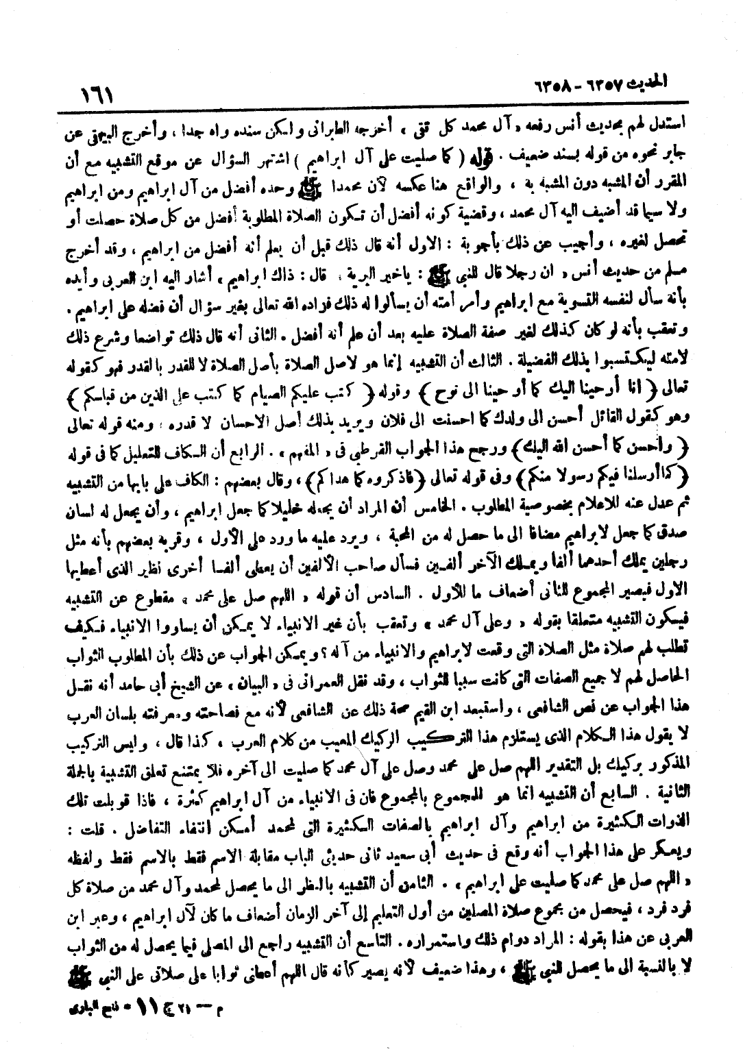 اسْتُدِلَّ لَهُمْ بِحَدِيثِ أَنَسٍ رَفَعَهُ آلُ مُحَمَّدٍ كُلُّ تَقِيٍّ أَخْرَجَهُ الطَّبَرَانِيُّ وَلَكِنْ سَنَدَهُ وَاهٍ جِدًّا وَأَخْرَجَ الْبَيْهَقِيُّ عَنْ جَابِرٍ نَحْوَهُ مِنْ قَوْلِهِ بِسَنَدٍ ضَعِيفٍ قَوْلُهُ كَمَا صَلَّيْتَ عَلَى آلِ إِبْرَاهِيمَ اشْتَهَرَ السُّؤَالُ عَنْ مَوْقِعِ التَّشْبِيهِ مَعَ أَنَّ الْمُقَرَّرَ أَنَّ الْمُشَبَّهَ دُونَ الْمُشَبَّهِ بِهِ وَالْوَاقِعُ هُنَا عَكْسُهُ لِأَنَّ مُحَمَّدًا صَلَّى اللَّهُ عَلَيْهِ وَسَلَّمَ وَحْدَهُ أَفْضَلُ مِنْ آلِ إِبْرَاهِيمَ وَمِنْ إِبْرَاهِيمَ وَلَا سِيَّمَا قَدْ أُضِيفَ إِلَيْهِ آلُ مُحَمَّدٍ وَقَضِيَّةُ كَوْنِهِ أَفْضَلَ أَنْ تَكُونَ الصَّلَاةُ الْمَطْلُوبَةُ أَفْضَلَ مِنْ كُلِّ صَلَاةٍ حَصَلَتْ أَوْ تَحْصُلُ لِغَيْرِهِ وَأُجِيبَ عَنْ ذَلِكَ بِأَجْوِبَةٍ الْأَوَّلُ أَنَّهُ قَالَ ذَلِكَ قَبْلَ أَنْ يَعْلَمَ أَنَّهُ أَفْضَلُ مِنْ إِبْرَاهِيمَ وَقَدْ أَخْرَجَ مُسْلِمٌ مِنْ حَدِيثِ أَنَسٍ أَنَّ رَجُلًا قَالَ لِلنَّبِيِّ صَلَّى اللَّهُ عَلَيْهِ وَسَلَّمَ يَا خَيْرَ الْبَرِيَّةِ قَالَ ذَاكَ إِبْرَاهِيمُ أَشَارَ إِلَيْهِ بن الْعَرَبِيِّ وَأَيَّدَهُ بِأَنَّهُ سَأَلَ لِنَفْسِهِ التَّسْوِيَةَ مَعَ إِبْرَاهِيمَ وَأَمَرَ أُمَّتَهُ أَنْ يَسْأَلُوا لَهُ ذَلِكَ فَزَادَهُ اللَّهُ تَعَالَى بِغَيْرِ سُؤَالٍ أَنْ فَضَّلَهُ عَلَى إِبْرَاهِيمَ وَتُعُقِّبَ بِأَنَّهُ لَوْ كَانَ كَذَلِكَ لغير صفة الصَّلَاة عَلَيْهِ بَعْدَ أَنْ عَلِمَ أَنَّهُ أَفْضَلُ الثَّانِي أَنَّهُ قَالَ ذَلِكَ تَوَاضُعًا وَشَرَعَ ذَلِكَ لِأُمَّتِهِ لِيَكْتَسِبُوا بِذَلِكَ الْفَضِيلَةَ الثَّالِثُ أَنَّ التَّشْبِيهَ إِنَّمَا هُوَ لِأَصْلِ الصَّلَاةِ بِأَصْلِ الصَّلَاةِ لَا لِلْقَدْرِ بِالْقَدْرِ فَهُوَ كَقَوْلِهِ تَعَالَى إِنَّا أَوْحَيْنَا إِلَيْكَ كَمَا أَو حينا إِلَى نوح وَقَوْلُهُ كُتِبَ عَلَيْكُمُ الصِّيَامُ كَمَا كُتِبَ عَلَى الَّذِينَ من قبلكُمْ وَهُوَ كَقَوْلِ الْقَائِلِ أَحْسِنْ إِلَى وَلَدِكَ كَمَا أَحْسَنْتَ إِلَى فُلَانٍ وَيُرِيدُ بِذَلِكَ أَصْلَ الْإِحْسَانِ لَا قَدْرَهُ وَمِنْهُ قَوْلُهُ تَعَالَى وَأَحْسِنْ كَمَا أحسن الله إِلَيْك وَرَجَّحَ هَذَا الْجَوَابَ الْقُرْطُبِيُّ فِي الْمُفْهِمِ الرَّابِعُ أَنَّ الْكَافَ لِلتَّعْلِيلِ كَمَا فِي قَوْلِهِ كَمَا ارسلنا فِيكُم رَسُولا مِنْكُم وَفِي قَوْله تَعَالَى فاذكروه كَمَا هدَاكُمْ وَقَالَ بَعْضُهُمْ الْكَافُ عَلَى بَابِهَا مِنَ التَّشْبِيهِ ثُمَّ عُدِلَ عَنْهُ لِلْإِعْلَامِ بِخُصُوصِيَّةِ الْمَطْلُوبِ الْخَامِسُ أَنَّ الْمُرَادَ أَنْ يَجْعَلَهُ خَلِيلًا كَمَا جَعَلَ إِبْرَاهِيمَ وَأَنْ يَجْعَلَ لَهُ لِسَانَ صِدْقٍ كَمَا جَعَلَ لِإِبْرَاهِيمَ مُضَافًا إِلَى مَا حَصَلَ لَهُ مِنَ الْمَحَبَّةِ وَيَرُدُّ عَلَيْهِ مَا وَرَدَ عَلَى الْأَوَّلِ وَقَرَّبَهُ بَعْضُهُمْ بِأَنَّهُ مِثْلُ رَجُلَيْنِ يَمْلِكُ أَحَدُهُمَا أَلْفًا وَيَمْلِكُ الْآخَرُ أَلْفَيْنِ فَسَأَلَ صَاحِبُ الْأَلْفَيْنِ أَنْ يُعْطَى أَلْفًا أُخْرَى نَظِيرَ الَّذِي أُعْطِيَهَا الْأَوَّلُ فَيَصِيرُ الْمَجْمُوعُ لِلثَّانِي أَضْعَافَ مَا لِلْأَوَّلِ السَّادِسُ أَنَّ قَوْلَهُ اللَّهُمَّ صَلِّ عَلَى مُحَمَّد مَقْطُوع عَن التَّشْبِيه فَيكون التَّشْبِيهُ مُتَعَلِّقًا بِقَوْلِهِ وَعَلَى آلِ مُحَمَّدٍ وَتُعُقِّبَ بِأَنَّ غَيْرَ الْأَنْبِيَاءِ لَا يُمْكِنُ أَنْ يُسَاوُوا الْأَنْبِيَاءَ فَكَيْفَ تُطْلَبُ لَهُمْ صَلَاةٌ مِثْلُ الصَّلَاةِ الَّتِي وَقَعَتْ لِإِبْرَاهِيمَ وَالْأَنْبِيَاءُ مِنْ آلِهِ وَيُمْكِنُ الْجَوَابُ عَنْ ذَلِكَ بِأَنَّ الْمَطْلُوبَ الثَّوَابُ الْحَاصِلُ لَهُمْ لَا جَمِيعُ الصِّفَاتِ الَّتِي كَانَتْ