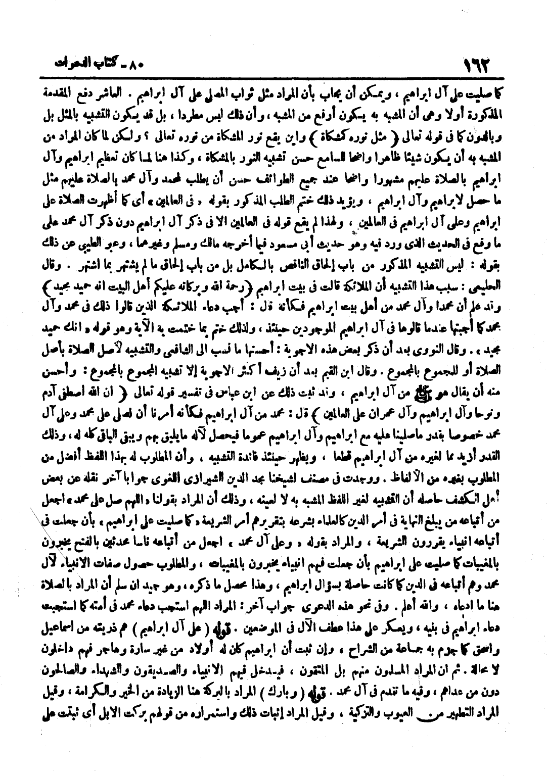كَمَا صَلَّيْتَ عَلَى آلِ إِبْرَاهِيمَ وَيُمْكِنُ أَنْ يُجَابَ بِأَنَّ الْمُرَادَ مِثْلُ ثَوَابِ الْمُصَلِّي عَلَى آلِ إِبْرَاهِيمَ الْعَاشِرُ دَفْعُ الْمُقَدِّمَةِ الْمَذْكُورَةِ أَوَّلًا وَهِيَ أَنَّ الْمُشَبَّهَ بِهِ يَكُونُ أَرْفَعَ مِنَ الْمُشَبَّهِ وَأَنَّ ذَلِكَ لَيْسَ مُطَّرِدًا بَلْ قَدْ يَكُونُ التَّشْبِيهُ بِالْمِثْلِ بَلْ وَبِالدُّونِ كَمَا فِي قَوْله تَعَالَى مثل نوره كمشكاة وَأَيْنَ يَقَعُ نُورُ الْمِشْكَاةِ مِنْ نُورِهِ تَعَالَى وَلَكِنْ لَمَّا كَانَ الْمُرَادُ مِنَ الْمُشَبَّهِ بِهِ أَنْ يَكُونَ شَيْئًا ظَاهِرًا وَاضِحًا لِلسَّامِعِ حَسُنَ تَشْبِيهُ النُّورِ بِالْمِشْكَاةِ وَكَذَا هُنَا لَمَّا كَانَ تَعْظِيمُ إِبْرَاهِيمَ وَآلِ إِبْرَاهِيمَ بِالصَّلَاةِ عَلَيْهِمْ مَشْهُورًا وَاضِحًا عِنْدَ جَمِيعِ الطَّوَائِفِ حَسُنَ أَنْ يُطْلَبَ لِمُحَمَّدٍ وَآلِ مُحَمَّدٍ بِالصَّلَاةِ عَلَيْهِمْ مِثْلَ مَا حَصَلَ لِإِبْرَاهِيمَ وَآلِ إِبْرَاهِيمَ وَيُؤَيِّدُ ذَلِكَ خَتْمُ الطَّلَبِ الْمَذْكُورِ بِقَوْلِهِ فِي الْعَالَمِينَ أَيْ كَمَا أَظْهَرَتِ الصَّلَاةُ عَلَى إِبْرَاهِيمَ وَعَلَى آلِ إِبْرَاهِيمَ فِي الْعَالَمِينَ وَلِهَذَا لَمْ يَقَعْ قَوْلُهُ فِي الْعَالَمِينَ إِلَّا فِي ذِكْرِ آلِ إِبْرَاهِيمَ دُونَ ذِكْرِ آلِ مُحَمَّدٍ عَلَى مَا وَقَعَ فِي الْحَدِيثِ الَّذِي وَرَدَ فِيهِ وَهُوَ حَدِيثُ أَبِي مَسْعُودٍ فِيمَا أَخْرَجَهُ مَالِكٌ وَمُسْلِمٌ وَغَيْرُهُمَا وَعَبَّرَ الطِّيبِيُّ عَنْ ذَلِكَ بِقَوْلِهِ لَيْسَ التَّشْبِيهُ الْمَذْكُورُ مِنْ بَابِ إِلْحَاقِ النَّاقِصِ بِالْكَامِلِ بَلْ مِنْ بَابِ إِلْحَاقِ مَا لَمْ يَشْتَهِرْ بِمَا اشْتَهَرَ وَقَالَ الْحَلِيمِيُّ سَبَبُ هَذَا التَّشْبِيهِ أَنَّ الْمَلَائِكَةَ قَالَتْ فِي بَيْتٍ إِبْرَاهِيمَ رَحْمَةُ اللَّهِ وَبَرَكَاتُهُ عَلَيْكُمْ أَهْلَ الْبَيْتِ إِنَّهُ حَمِيدٌ مَجِيدٌ وَقَدْ عُلِمَ أَنَّ مُحَمَّدًا وَآلَ مُحَمَّدٍ مِنْ أَهْلِ بَيْتِ إِبْرَاهِيمَ فَكَأَنَّهُ قَالَ أَجِبْ دُعَاءَ الْمَلَائِكَةِ الَّذِينَ قَالُوا ذَلِكَ فِي مُحَمَّدٍ وَآلِ مُحَمَّدٍ كَمَا أَجَبْتَهَا عِنْدَمَا قَالُوهَا فِي آلِ إِبْرَاهِيمَ الْمَوْجُودِينَ حِينَئِذٍ وَلِذَلِكَ خَتَمَ بِمَا خُتِمَتْ بِهِ الْآيَةُ وَهُوَ قَوْلُهُ إِنَّكَ حَمِيدٌ مَجِيدٌ وَقَالَ النَّوَوِيُّ بَعْدَ أَنْ ذَكَرَ بَعْضَ هَذِهِ الْأَجْوِبَةِ أَحْسَنُهَا مَا نُسِبَ إِلَى الشَّافِعِيِّ وَالتَّشْبِيهُ لِأَصْلِ الصَّلَاةِ بِأَصْلِ الصَّلَاةِ أَوْ لِلْمَجْمُوعِ بِالْمَجْمُوعِ وَقَالَ بن الْقَيِّمِ بَعْدَ أَنْ زَيَّفَ أَكْثَرَ الْأَجْوِبَةِ إِلَّا تَشْبِيهَ الْمَجْمُوعِ بِالْمَجْمُوعِ وَأَحْسَنُ مِنْهُ أَنْ يُقَالَ هُوَ صَلَّى اللَّهُ عَلَيْهِ وَسَلَّمَ مِنْ آلِ إِبْرَاهِيم وَقد ثَبت ذَلِك عَن بن عَبَّاسٍ فِي تَفْسِيرِ قَوْلَهُ تَعَالَى إِنَّ اللَّهَ اصْطَفَى آدَمَ وَنُوحًا وَآلَ إِبْرَاهِيمَ وَآلَ عِمْرَانَ على الْعَالمين قَالَ مُحَمَّدٌ مِنْ آلِ إِبْرَاهِيمَ فَكَأَنَّهُ أَمَرَنَا أَنْ نُصَلِّيَ عَلَى مُحَمَّدٍ وَعَلَى آلِ مُحَمَّدٍ خُصُوصًا بِقَدْرِ مَا صَلَّيْنَا عَلَيْهِ مَعَ إِبْرَاهِيمَ وَآلِ إِبْرَاهِيمَ عُمُومًا فَيَحْصُلُ لِآلِهِ مَا يَلِيقُ بِهِمْ وَيَبْقَى الْبَاقِي كُلُّهُ لَهُ وَذَلِكَ الْقَدْرُ أَزْيَدُ مِمَّا لِغَيْرِهِ مِنْ آلِ إِبْرَاهِيمَ قَطْعًا وَيَظْهَرُ حِينَئِذٍ فَائِدَةُ التَّشْبِيهِ وَأَنَّ الْمَطْلُوبَ لَهُ بِهَذَا اللَّفْظِ أَفْضَلُ مِنَ الْمَطْلُوبِ بِغَيْرِهِ مِنَ الْأَلْفَاظِ وَوَجَدْتُ فِي مُصَنَّفٍ لِشَيْخِنَا مَجْدِ الدِّينِ الشِّيرَازِيِّ اللُّغَوِيِّ جَوَابًا آخَرَ نَقَلَهُ عَنْ بَعْضِ أَهْلِ الْكَشْفِ حَا