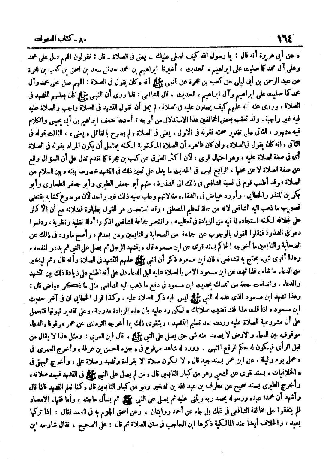 عَنْ أَبِي هُرَيْرَةَ أَنَّهُ قَالَ يَا رَسُولَ اللَّهِ كَيْفَ نُصَلِّي عَلَيْكَ يَعْنِي فِي الصَّلَاةِ قَالَ تَقُولُونَ اللَّهُمَّ صَلِّ عَلَى مُحَمَّدٍ وَعَلَى آلِ مُحَمَّدٍ كَمَا صَلَّيْتَ عَلَى إِبْرَاهِيمَ الْحَدِيثَ أَخْبَرَنَا إِبْرَاهِيمُ بْنُ مُحَمَّدٍ حَدَّثَنِي سَعْدُ بْنُ إِسْحَاقَ بْنِ كَعْبِ بْنِ عُجْرَةَ عَنْ عَبْدِ الرَّحْمَنِ بْنِ أَبِي لَيْلَى عَنْ كَعْبِ بْنِ عُجْرَةَ عَنِ النَّبِيِّ صَلَّى اللَّهُ عَلَيْهِ وَسَلَّمَ أَنَّهُ كَانَ يَقُولُ فِي الصَّلَاةِ اللَّهُمَّ صَلِّ عَلَى مُحَمَّدٍ وَآلِ مُحَمَّدٍ كَمَا صَلَّيْتَ عَلَى إِبْرَاهِيمَ وَآلِ إِبْرَاهِيمَ الْحَدِيثَ قَالَ الشَّافِعِيُّ فَلَمَّا رُوِيَ أَنَّ النَّبِيَّ صَلَّى اللَّهُ عَلَيْهِ وَسَلَّمَ كَانَ يُعَلِّمُهُمُ التَّشَهُّدَ فِي الصَّلَاةِ وَرُوِيَ عَنْهُ أَنَّهُ عَلَّمَهُمْ كَيْفَ يُصَلُّونَ عَلَيْهِ فِي الصَّلَاةِ لَمْ يَجُزْ أَنْ نَقُولَ التَّشَهُّدُ فِي الصَّلَاةِ وَاجِبٌ وَالصَّلَاةُ عَلَيْهِ فِيهِ غَيْرُ وَاجِبَةٍ وَقَدْ تَعَقَّبَ بَعْضُ الْمُخَالِفِينَ هَذَا الِاسْتِدْلَالَ مِنْ أَوْجُهٍ أَحَدُهَا ضَعْفُ إِبْرَاهِيمَ بْنِ أَبِي يَحْيَى وَالْكَلَامُ فِيهِ مَشْهُورٌ الثَّانِي عَلَى تَقْدِيرِ صِحَّتِهِ فَقَوْلُهُ فِي الْأَوَّلِ يَعْنِي فِي الصَّلَاةِ لَمْ يُصَرِّحْ بِالْقَائِلِ يَعْنِي الثَّالِثَ قَوْلُهُ فِي الثَّانِي إِنَّهُ كَانَ يَقُولُ فِي الصَّلَاةِ وَإِنْ كَانَ ظَاهِرُهُ أَنَّ الصَّلَاةَ الْمَكْتُوبَةَ لَكِنَّهُ يَحْتَمِلُ أَنْ يَكُونَ الْمُرَادُ بِقَوْلِهِ فِي الصَّلَاةِ أَيْ فِي صِفَةِ الصَّلَاةِ عَلَيْهِ وَهُوَ احْتِمَالٌ قَوِيٌّ لِأَنَّ أَكْثَرَ الطّرق عَن كَعْب بن عجْرَة كَمَا تقدم تَدُلُّ عَلَى أَنَّ السُّؤَالَ وَقَعَ عَنْ صِفَةِ الصَّلَاةِ لَا عَنْ مَحَلِّهَا الرَّابِعُ لَيْسَ فِي الْحَدِيثِ مَا يَدُلُّ عَلَى تَعَيُّنِ ذَلِكَ فِي التَّشَهُّدِ خُصُوصًا بَيْنَهُ وَبَيْنَ السَّلَامِ مِنَ الصَّلَاةِ وَقَدْ أَطْنَبَ قَوْمٌ فِي نِسْبَةِ الشَّافِعِيِّ فِي ذَلِكَ إِلَى الشُّذُوذِ مِنْهُمْ أَبُو جَعْفَرٍ الطَّبَرِيُّ وَأَبُو جَعْفَرٍ الطَّحَاوِيُّ وَأَبُو بَكْرِ بْنُ الْمُنْذِرِ وَالْخَطَّابِيُّ وَأَوْرَدَ عِيَاضٌ فِي الشِّفَاءِ مَقَالَاتِهِمْ وَعَابَ عَلَيْهِ ذَلِكَ غَيْرُ وَاحِدٍ لِأَنَّ مَوْضُوعَ كِتَابِهِ يَقْتَضِي تَصْوِيبَ مَا ذَهَبَ إِلَيْهِ الشَّافِعِيُّ لِأَنَّهُ مِنْ جُمْلَةِ تَعْظِيمِ الْمُصْطَفَى وَقَدِ اسْتَحْسَنَ هُوَ القَوْل بِطَهَارَة فضلائه مَعَ أَنَّ الْأَكْثَرَ عَلَى خِلَافِهِ لَكِنَّهُ اسْتَجَادَهُ لِمَا فِيهِ مِنَ الزِّيَادَةِ فِي تَعْظِيمِهِ وَانْتَصَرَ جَمَاعَةٌ لِلشَّافِعِيِّ فَذَكَرُوا أَدِلَّةً نَقْلِيَّةً وَنَظَرِيَّةً وَدَفَعُوا دَعْوَى الشُّذُوذِ فَنَقَلُوا الْقَوْلَ بِالْوُجُوبِ عَنْ جَمَاعَةٍ مِنَ الصَّحَابَةِ وَالتَّابِعِينَ وَمَنْ بَعْدَهُمْ وَأَصَحُّ مَا وَرَدَ فِي ذَلِكَ عَنِ الصَّحَابَةِ وَالتَّابِعِينَ مَا أخرجه الْحَاكِم بِسَنَد قوي عَن بن مَسْعُودٍ قَالَ يَتَشَهَّدُ الرَّجُلُ ثُمَّ يُصَلِّي عَلَى النَّبِيِّ ثُمَّ يَدْعُو لِنَفْسِهِ وَهَذَا أَقْوَى شَيْءٍ يحْتَج بِهِ للشَّافِعِيّ فَإِن بن مَسْعُودٍ ذَكَرَ أَنَّ النَّبِيَّ صَلَّى اللَّهُ عَلَيْهِ وَسَلَّمَ عَلَّمَهُمُ التَّشَهُّدَ فِي الصَّلَاةِ وَأَنَّهُ قَالَ ثُمَّ لْيَتَخَيَّرْ مِنَ الدُّعَاءِ مَا شَاءَ فَلَمَّا ثَبت عَن بن مَسْعُودٍ الْأَمْرُ بِالصَّلَاةِ عَلَيْهِ قَبْلَ الدُّعَاءِ دَلَّ عَلَى أَنَّهُ اطَّلَعَ عَلَى زِيَادَةِ ذَلِكَ بَيْنَ التَّشَهُّدِ وَالدُّعَاءِ وَانْدَفَعَتْ حُجَّةُ مَنْ تَمَسَّكَ بِحَدِيثِ بن مَسْعُودٍ فِي دَفْعِ مَا ذَهَبَ إِلَيْهِ ال