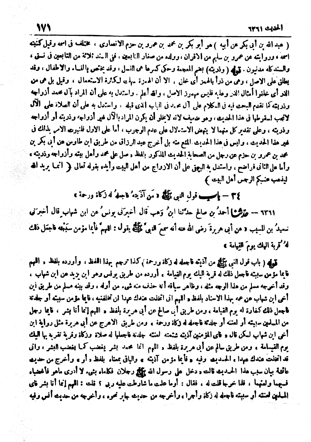 [6360] عَبْدِ اللَّهِ بْنِ أَبِي بَكْرٍ عَنْ أَبِيهِ هُوَ أَبُو بَكْرِ بْنِ مُحَمَّدِ بْنِ عَمْرِو بْنِ حَزْمٍ الْأَنْصَارِيُّ مُخْتَلَفٌ فِي اسْمِهِ وَقِيلَ كُنْيَتُهُ اسْمُهُ وَرِوَايَتُهُ عَنْ عَمْرِو بْنِ سُلَيْمٍ مِنَ الْأَقْرَانِ وَوَلَدُهُ مِنْ صِغَارِ التَّابِعِينَ فَفِي السَّنَدِ ثَلَاثَةٌ مِنَ التَّابِعِينَ فِي نَسَقٍ وَالسَّنَدُ كُلُّهُ مَدَنِيُّونَ قَوْلُهُ وَذُرِّيَّتُهُ بِضَمِّ الْمُعْجَمَةِ وَحُكِيَ كَسْرُهَا هِيَ النَّسْلُ وَقَدْ يَخْتَصُّ بِالنِّسَاءِ وَالْأَطْفَالِ وَقَدْ يُطْلَقُ عَلَى الْأَصْلِ وَهِيَ مِنْ ذَرَأَ بِالْهَمْزِ أَيْ خَلَقَ إِلَّا أَنَّ الْهَمْزَةَ سُهِّلَتْ لِكَثْرَةِ الِاسْتِعْمَالِ وَقِيلَ بَلْ هِيَ مِنَ الذَّرِّ أَيْ خُلِقُوا أَمْثَالَ الذَّرِّ وَعَلَيْهِ فَلَيْسَ مَهْمُوزَ الْأَصْلِ وَاللَّهُ أَعْلَمُ وَاسْتُدِلَّ بِهِ عَلَى أَنَّ الْمُرَادَ بِآلِ مُحَمَّدٍ أَزْوَاجُهُ وَذُرِّيَّتُهُ كَمَا تَقَدَّمَ الْبَحْثُ فِيهِ فِي الْكَلَامِ عَلَى آلِ مُحَمَّدٍ فِي الْبَابِ الَّذِي قَبْلَهُ وَاسْتُدِلَّ بِهِ عَلَى أَنَّ الصَّلَاةَ عَلَى الْآلِ لَا تَجِبُ لِسُقُوطِهَا فِي هَذَا الْحَدِيثِ وَهُوَ ضَعِيفٌ لِأَنَّهُ لَا يَخْلُو أَنْ يَكُونَ الْمُرَادُ بِالْآلِ غَيْرَ أَزْوَاجِهِ وَذُرِّيَّتِهِ أَوْ أَزْوَاجَهُ وَذُرِّيَّتَهُ وَعَلَى تَقْدِيرِ كُلٍّ مِنْهُمَا لَا يَنْهَضُ الِاسْتِدْلَالُ عَلَى عَدَمِ الْوُجُوبِ أَمَّا عَلَى الْأَوَّلِ فَلِثُبُوتِ الْأَمْرِ بِذَلِكَ فِي غَيْرِ هَذَا الْحَدِيثِ وَلَيْسَ فِي هَذَا الْحَدِيثِ الْمَنْعُ مِنْهُ بَلْ أَخْرَجَ عَبْدُ الرَّزَّاقِ مِنْ طَرِيق بن طَاوُسٍ عَنْ أَبِي بَكْرِ بْنِ مُحَمَّدِ بْنِ عَمْرِو بْنِ حَزْمٍ عَنْ رَجُلٍ مِنَ الصَّحَابَةِ الْحَدِيثَ الْمَذْكُورَ بِلَفْظِ صَلِّ عَلَى مُحَمَّدٍ وَأَهْلِ بَيْتِهِ وَأَزْوَاجِهِ وَذُرِّيَّتِهِ وَأَمَّا عَلَى الثَّانِي فَوَاضِحٌ وَاسْتَدَلَّ بِهِ الْبَيْهَقِيُّ عَلَى أَنَّ الْأَزْوَاجَ مِنْ أَهْلِ الْبَيْتِ وَأَيَّدَهُ بِقَوْلِهِ تَعَالَى إِنَّمَا يُرِيدُ اللَّهُ لِيُذْهِبَ عَنْكُمُ الرِّجْسَ أهل الْبَيْت