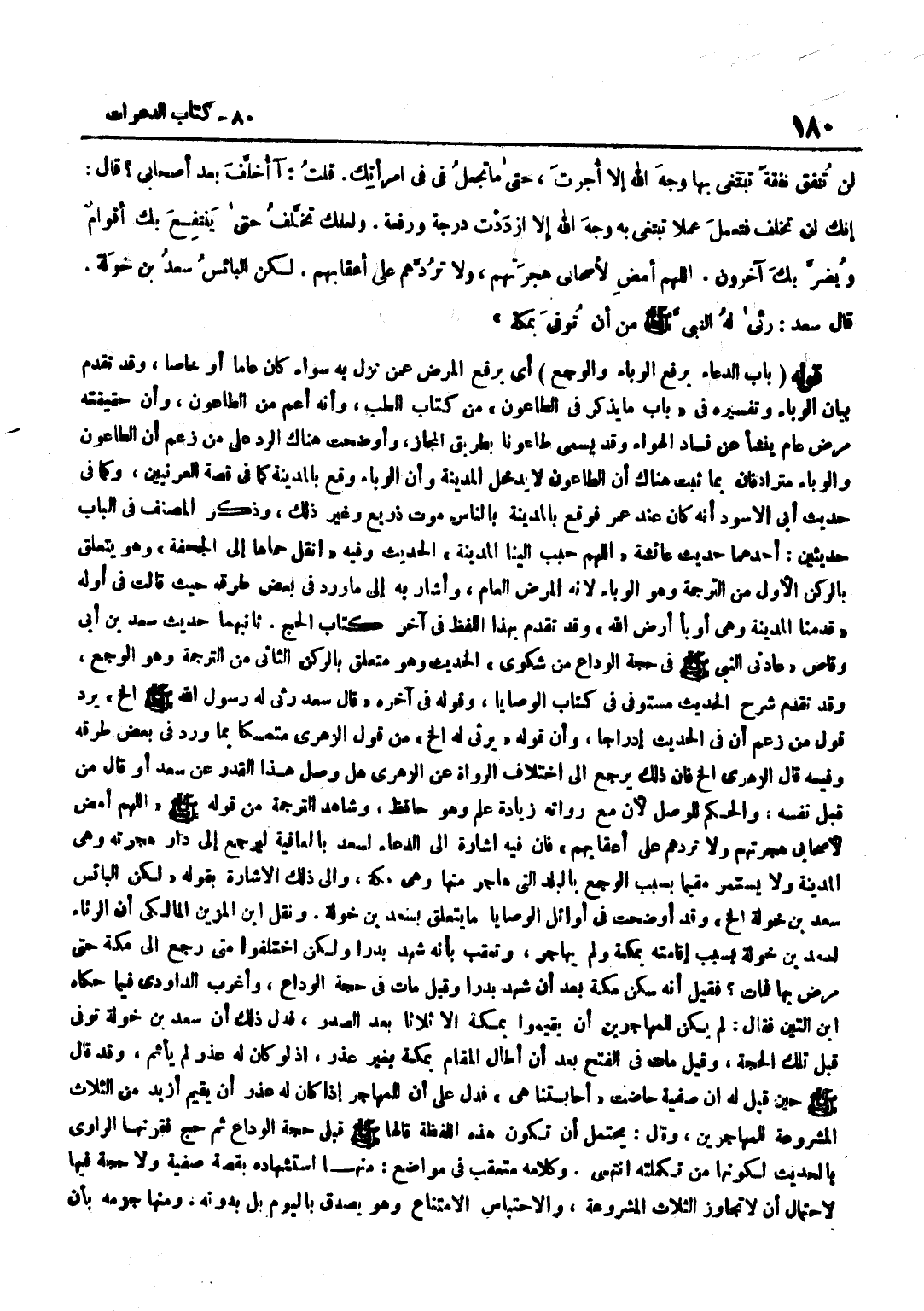أَيْ بِرَفْعِ الْمَرَضِ عَمَّنْ نَزَلَ بِهِ سَوَاءٌ كَانَ عَامًّا أَوْ خَاصًّا وَقَدْ تَقَدَّمَ بَيَانُ الْوَبَاءِ وَتَفْسِيرُهُ فِي بَابِ مَا يُذْكَرُ فِي الطَّاعُونِ مِنْ كِتَابِ الطِّبِّ وَأَنَّهُ أَعَمُّ مِنَ الطَّاعُونِ وَأَنَّ حَقِيقَتَهُ مَرَضٌ عَامٌّ يَنْشَأُ عَنْ فَسَادِ الْهَوَاءِ وَقَدْ يُسَمَّى طَاعُونًا بِطَرِيقِ الْمَجَازِ وَأَوْضَحْتُ هُنَاكَ الرَّدَّ عَلَى مَنْ زَعَمَ أَنَّ الطَّاعُونَ وَالْوَبَاءَ مُتَرَادِفَانِ بِمَا ثَبَتَ هُنَاكَ أَنَّ الطَّاعُونَ لَا يَدْخُلُ الْمَدِينَةَ وَأَنَّ الْوَبَاءَ وَقَعَ بِالْمَدِينَةِ كَمَا فِي قِصَّةِ الْعُرَنِيِّينَ وَكَمَا فِي حَدِيثِ أَبِي الْأَسْوَدِ أَنَّهُ كَانَ عِنْدَ عُمَرَ فَوَقَعَ بِالْمَدِينَةِ بِالنَّاسِ مَوْتٌ ذَرِيعٌ وَغَيْرُ ذَلِكَ وَذَكَرَ الْمُصَنِّفُ فِي الْبَابِ حَدِيثَيْنِ أَحَدَهُمَا حَدِيثَ عَائِشَةَ اللَّهُمَّ حَبِّبْ إِلَيْنَا الْمَدِينَةَ الْحَدِيثَ وَفِيهِ انْقُلْ حُمَّاهَا إِلَى الْجُحْفَةِ وَهُوَ يَتَعَلَّقُ بِالرُّكْنِ الْأَوَّلِ مِنَ التَّرْجَمَةِ وَهُوَ الْوَبَاءُ لِأَنَّهُ الْمَرَضُ الْعَامُّ وَأَشَارَ بِهِ إِلَى مَا وَرَدَ فِي بَعْضِ طُرُقِهِ حَيْثُ قَالَتْ فِي أَوَّلِهِ قَدِمْنَا الْمَدِينَةَ وَهِيَ أَوَبَأُ أَرْضِ اللَّهِ وَقَدْ تَقَدَّمَ بِهَذَا اللَّفْظِ فِي آخِرِ كِتَابِ الْحَجِّ ثَانِيهِمَا حَدِيثُ سَعْدِ بْنِ أَبِي وَقَّاصٍ عَادَنِي النَّبِيُّ صَلَّى اللَّهُ عَلَيْهِ وَسَلَّمَ فِي حَجَّةِ الْوَدَاعِ مِنْ شَكْوَى الْحَدِيثَ وَهُوَ مُتَعَلِّقٌ بِالرُّكْنِ الثَّانِي مِنَ التَّرْجَمَةِ وَهُوَ الْوَجَعُ وَقَدْ تَقَدَّمَ شَرْحُ الْحَدِيثِ مُسْتَوْفًى فِي كِتَابِ الْوَصَايَا وَقَوْلُهُ