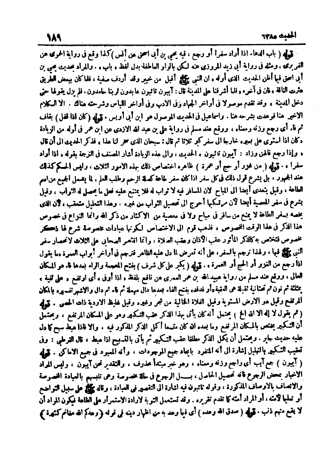 [6385] قَوْلُهُ كَانَ إِذَا قَفَلَ بِقَافٍ ثُمَّ فَاءٍ أَيْ رَجَعَ وَزْنَهُ وَمَعْنَاهُ وَوَقَعَ عِنْدَ مُسْلِمٍ فِي رِوَايَةِ عَلِيِّ بْنِ عَبْدِ الله الْأَزْدِيّ عَن بن عُمَرَ فِي أَوَّلِهِ مِنَ الزِّيَادَةِ كَانَ إِذَا اسْتَوَى عَلَى بَعِيرِهِ خَارِجًا إِلَى سَفَرٍ كَبَّرَ ثَلَاثًا ثُمَّ قَالَ سُبْحَانَ الَّذِي سَخَّرَ لَنَا هَذَا فَذَكَرَ الْحَدِيثَ إِلَى أَنْ قَالَ وَإِذَا رَجَعَ قَالَهُنَّ وَزَادَ آيِبُونَ تَائِبُونَ الْحَدِيثَ وَإِلَى هَذِهِ الزِّيَادَةِ أَشَارَ الْمُصَنِّفُ فِي التَّرْجَمَةِ بِقَوْلِهِ إِذَا أَرَادَ سَفَرًا قَوْلُهُ مِنْ غَزْوٍ أَوْ حَجٍّ أَوْ عُمْرَةٍ ظَاهِرُهُ اخْتِصَاصُ ذَلِكَ بِهَذِهِ الْأُمُورِ الثَّلَاثِ وَلَيْسَ الْحُكْمُ كَذَلِكَ عِنْدَ الْجُمْهُورِ بَلْ يُشْرَعُ قَوْلُ ذَلِكَ فِي كُلِّ سَفَرٍ إِذَا كَانَ سَفَرَ طَاعَةٍ كَصِلَةِ الرَّحِمِ وَطَلَبِ الْعِلْمِ لِمَا يَشْمَلُ الْجَمِيعَ مِنِ اسْمِ الطَّاعَةِ وَقِيلَ يَتَعَدَّى أَيْضًا إِلَى الْمُبَاحِ لِأَنَّ الْمُسَافِرَ فِيهِ لَا ثَوَابَ لَهُ فَلَا يَمْتَنِعُ عَلَيْهِ فِعْلُ مَا يَحْصُلُ لَهُ الثَّوَابُ وَقِيلَ يُشْرَعُ فِي سَفَرِ الْمَعْصِيَةِ أَيْضًا لِأَنَّ مُرْتَكِبَهَا أَحْوَجُ إِلَى تَحْصِيلِ الثَّوَابِ مِنْ غَيْرِهِ وَهَذَا التَّعْلِيلُ مُتَعَقَّبٌ لِأَنَّ الَّذِي يَخُصُّهُ بِسَفَرِ الطَّاعَةِ لَا يَمْنَعُ مَنْ سَافَرَ فِي مُبَاحٍ وَلَا فِي مَعْصِيَةٍ مِنَ الْإِكْثَارِ مِنْ ذِكْرِ اللَّهِ وَإِنَّمَا النِّزَاعُ فِي خُصُوصِ هَذَا الذِّكْرِ فِي هَذَا الْوَقْتِ الْمَخْصُوصِ فَذَهَبَ قَوْمٌ إِلَى الِاخْتِصَاصِ لِكَوْنِهَا عِبَادَاتٍ مَخْصُوصَةً شُرِعَ لَهَا ذِكْرٌ مَخْصُوصٌ فَتَخْتَصُّ بِهِ كَالذِّكْرِ الْمَأْثُورِ عَقِبَ الْأَذَانِ وَعَقِبَ الصَّلَاةِ وَإِنَّمَا اقْتَصَرَ الصَّحَابِيُّ عَلَى الثَّلَاثِ لِانْحِصَارِ سَفَرِ النَّبِيِّ صَلَّى اللَّهُ عَلَيْهِ وَسَلَّمَ فِيهَا وَلِهَذَا تَرْجَمَ بِالسَّفَرِ عَلَى أَنَّهُ تَعَرَّضَ لِمَا دَلَّ عَلَيْهِ الظَّاهِرُ فَتَرْجَمَ فِي أَوَاخِرِ أَبْوَابِ الْعُمْرَةِ مَا يَقُولُ إِذَا رَجَعَ مِنَ الْغَزْوِ أَوِ الْحَجِّ أَوِ الْعُمْرَةِ قَوْلُهُ يُكَبِّرُ عَلَى كُلِّ شَرَفٍ بِفَتْحِ الْمُعْجَمَةِ وَالرَّاءِ بَعْدَهَا فَاءٌ هُوَ الْمَكَانُ الْعَالِي وَوَقَعَ عِنْدَ مُسْلِمٌ مِنْ رِوَايَةِ عُبَيْدِ اللَّهِ بْنِ عُمَرَ الْعُمَرِيِّ عَنْ نَافِعٍ بِلَفْظِ إِذَا أَوْفَى أَيِ ارْتَفَعَ عَلَى ثَنِيَّةٍ بِمُثَلَّثَةٍ ثُمَّ نُونٍ ثُمَّ تَحْتَانِيَّةٍ ثَقِيلَةٍ هِيَ الْعَقَبَةُ أَوْ فَدْفَدُ بِفَتْحِ الْفَاءِ بَعْدَهَا دَالٌ مُهْمَلَةٌ ثُمَّ فَاءٌ ثُمَّ دَالٌ وَالْأَشْهَرُ تَفْسِيرُهُ بِالْمَكَانِ الْمُرْتَفِعِ وَقِيلَ هُوَ الْأَرْضُ الْمُسْتَوِيَةُ وَقِيلَ الْفَلَاةُ الْخَالِيَةُ مِنْ شَجَرٍ وَغَيْرِهِ وَقِيلَ غَلِيظُ الْأَوْدِيَةِ ذَاتِ الْحَصَى قَوْلُهُ ثُمَّ يَقُولُ لَا إِلَهَ إِلَّا اللَّهُ إِلَخْ يَحْتَمِلُ أَنَّهُ كَانَ يَأْتِي بِهَذَا الذِّكْرِ عَقِبَ التَّكْبِيرِ وَهُوَ عَلَى الْمَكَانِ الْمُرْتَفِعِ وَيَحْتَمِلُ أَنَّ التَّكْبِيرَ يَخْتَصُّ بِالْمَكَانِ الْمُرْتَفِعِ وَمَا بَعْدَهُ إِنْ كَانَ مُتَّسِعًا أَكْمَلَ الذِّكْرَ الْمَذْكُورَ فِيهِ وَإِلَّا فَإِذَا هَبَطَ سَبَّحَ كَمَا دَلَّ عَلَيْهِ حَدِيثُ جَابِرٍ وَيَحْتَمِلُ أَنْ يُكْمِلَ الذِّكْرَ مُطْلَقًا عَقِبَ التَّكْبِيرِ ثُمَّ يَأْتِي بِالتَّسْبِيحِ إِذَا هَبَطَ قَالَ الْقُرْطُبِيُّ وَفِي تَعْقِيبِ التَّكْبِيرِ بِالتَّهْلِيلِ إِشَارَةٌ إِلَى أَنَّهُ الْمُتَفَرِّدَ بِإِيجَادِ جَمِيعِ الْمَوْجُودَاتِ وَأَنَّهُ الْمَعْبُودُ فِي جَمِيعِ الْأَمَاكِنِ قَوْلُهُ آيِبُ