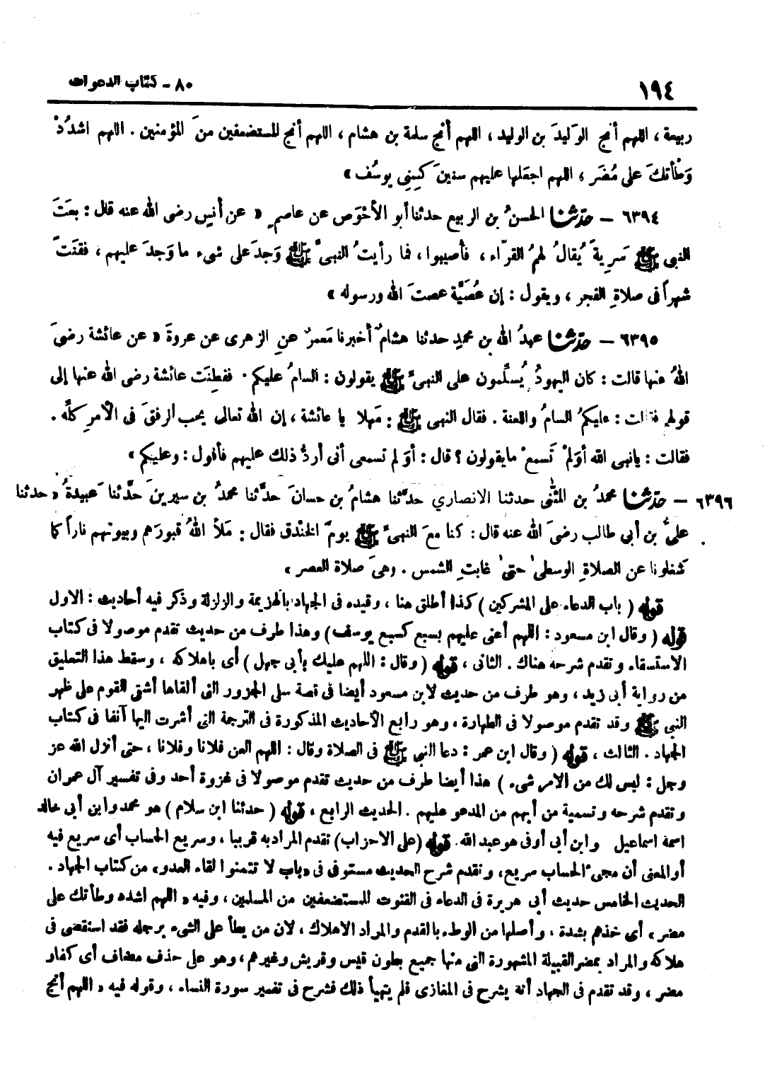 كَذَا أَطْلَقَ هُنَا وَقَيَّدَهُ فِي الْجِهَادِ بِالْهَزِيمَةِ وَالزَّلْزَلَةِ وَذَكَرَ فِيهِ أَحَادِيث الأول قَوْله وَقَالَ بن مَسْعُودٍ اللَّهُمَّ أَعِنِّي عَلَيْهِمْ بِسَبْعٍ كَسَبْعِ يُوسُفَ وَهَذَا طَرَفٌ مِنْ حَدِيثٍ تَقَدَّمَ مَوْصُولًا فِي كِتَابِ الِاسْتِسْقَاءِ وَتَقَدَّمَ شَرْحُهُ هُنَاكَ الثَّانِي قَوْلُهُ وَقَالَ اللَّهُمَّ عَلَيْكَ بِأَبِي جَهْلٍ أَيْ بِإِهْلَاكِهِ وَسقط هذاالتعليق مِنْ رِوَايَةِ أَبِي زَيْدٍ وَهُوَ طَرَفٌ مِنْ حَدِيثٍ لِابْنِ مَسْعُودٍ أَيْضًا فِي قِصَّةِ سَلَى الْجَزُورِ الَّتِي أَلْقَاهَا أَشْقَى الْقَوْمِ عَلَى ظَهْرِ النَّبِيِّ صَلَّى اللَّهُ عَلَيْهِ وَسَلَّمَ وَقَدْ تَقَدَّمَ مَوْصُولًا فِي الطَّهَارَةِ وَهُوَ رَابِعُ الْأَحَادِيثِ الْمَذْكُورَةِ فِي التَّرْجَمَةِ الَّتِي أَشَرْتُ إِلَيْهَا آنِفًا فِي كتاب الْجِهَاد الثَّالِث قَوْله وَقَالَ بن عُمَرَ دَعَا النَّبِيِّ صَلَّى اللَّهُ عَلَيْهِ وَسَلَّمَ فِي الصَّلَاةِ وَقَالَ اللَّهُمَّ الْعَنْ فُلَانًا وَفُلَانًا حَتَّى أَنْزَلَ اللَّهُ عَزَّ وَجَلَّ لَيْسَ لَكَ مِنَ الْأَمْرِ شَيْءٌ هَذَا أَيْضًا طَرَفٌ مِنْ حَدِيثٍ تَقَدَّمَ مَوْصُولًا فِي غَزْوَةِ أُحُدٍ وَفِي تَفْسِيرِ آلِ عِمْرَانَ وَتَقَدَّمَ شَرْحُهُ وَتَسْمِيَةُ مَنْ ابهم من الْمَدْعُو عَلَيْهِم الحَدِيث الرَّابِع