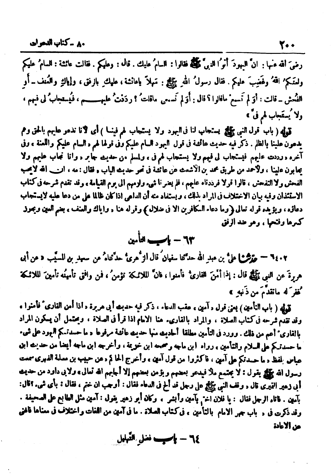 ذَكَرَ فِيهِ حَدِيثَ أَبِي هُرَيْرَةَ إِذَا امن القاريء فَأَمِّنُوا وَقَدْ تَقَدَّمَ شَرْحُهُ فِي كِتَابِ الصَّلَاةِ وَالْمرَاد بالقاريء هُنَا الْإِمَامُ إِذَا قَرَأَ فِي الصَّلَاةِ وَيَحْتَمِلُ ان يكون المُرَاد بالقاريء أَعَمَّ مِنْ ذَلِكَ وَوَرَدَ فِي التَّأْمِينِ مُطْلَقًا أَحَادِيثُ مِنْهَا حَدِيثُ عَائِشَةَ مَرْفُوعًا مَا حَسَدَتْكُمُ الْيَهُودُ عَلَى شَيْءٍ مَا حَسَدَتْكُمْ عَلَى السَّلَامِ والتأمين رَوَاهُ بن ماجة وَصَححهُ بن خُزَيْمَة وَأخرجه بن ماجة أَيْضا من حَدِيث بن عَبَّاسٍ بِلَفْظِ مَا حَسَدَتْكُمْ عَلَى آمِينَ فَأَكْثِرُوا مِنْ قَوْلِ آمِينَ وَأَخْرَجَ الْحَاكِمُ عَنْ حَبِيبِ بْنِ مَسْلَمَةَ الْفِهْرِيِّ سَمِعْتُ رَسُولَ اللَّهِ صَلَّى اللَّهُ عَلَيْهِ وَسَلَّمَ يَقُولُ لَا يَجْتَمِعُ مَلَأٌ فَيَدْعُو بَعْضُهُمْ وَيُؤَمِّنُ بَعْضُهُمْ إِلَّا أَجَابَهُمُ اللَّهِ تَعَالَى وَلِأَبِي دَاوُدَ مِنْ حَدِيثِ أَبِي زُهَيْرٍ النُّمَيْرِيِّ قَالَ وَقَفَ النَّبِيُّ صَلَّى اللَّهُ عَلَيْهِ وَسَلَّمَ عَلَى رَجُلٍ قَدْ أَلَحَّ فِي الدُّعَاءِ فَقَالَ أَوْجَبَ إِنْ خَتَمَ فَقَالَ بِأَيِّ شَيْءٍ قَالَ بِآمِينَ فَأَتَاهُ الرَّجُلُ فَقَالَ يَا فُلَانُ اخْتِمْ بِآمِينَ وَأَبْشِرْ وَكَانَ أَبُو زُهَيْرٍ يَقُولُ آمِينَ مِثْلُ الطَّابِعِ عَلَى الصَّحِيفَةِ وَقَدْ ذَكَرْتُ فِي بَابِ جَهْرِ الْإِمَامِ بِالتَّأْمِينِ فِي كِتَابِ الصَّلَاةِ مَا فِي آمِينَ مِنَ اللُّغَاتِ وَاخْتِلَافٍ فِي مَعْنَاهَا فاغنى عَن الْإِعَادَة