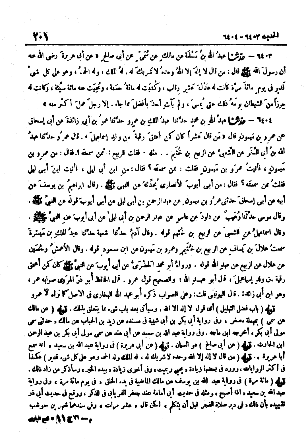 [6403] قَوْلُهُ عَنْ مَالِكٍ عَنْ سُمَيٍّ بِمُهْمَلَةٍ مُصَغَّرٌ وَفِي رِوَايَةِ أَبِي بَكْرِ بْنُ أَبِي شَيْبَةَ فِي مُسْنَدِهِ عَنْ زَيْدِ بْنِ الْحُبَابِ عَنْ مَالِكٍ حَدَّثَنِي سُمَيٌّ مَوْلَى أَبِي بَكْرٍ أَخْرَجَهُ بن مَاجَهْ وَفِي رِوَايَةِ عَبْدِ اللَّهِ بْنِ سَعِيدٍ عَنْ أَبِي هِنْدٍ عَنْ سُمَيٍّ مَوْلَى أَبِي بَكْرِ بْنِ عَبْدِ الرَّحْمَنِ بْنِ الْحَارِثِ قَوْلُهُ عَنْ أَبِي صَالِحٍ هُوَ السَّمَّانُ قَوْلُهُ عَنْ أَبِي هُرَيْرَةَ فِي رِوَايَةِ عَبْدِ اللَّهِ بْنِ سَعِيدٍ أَنَّهُ سَمِعَ أَبَا هُرَيْرَةَ قَوْلُهُ مَنْ قَالَ لَا إِلَهَ إِلَّا اللَّهُ وَحْدَهُ لَا شَرِيكَ لَهُ لَهُ الْمُلْكُ وَلَهُ الْحَمْدُ وَهُوَ عَلَى كُلِّ شَيْءٍ قَدِيرٌ هَكَذَا فِي أَكْثَرِ الرِّوَايَاتِ وَوَرَدَ فِي بَعْضِهَا زِيَادَةُ يُحْيِي وَيُمِيتُ وَفِي أُخْرَى زِيَادَةُ بِيَدِهِ الْخَيْرُ وَسَأَذْكُرُ مَنْ زَادَ ذَلِكَ قَوْلُهُ مِائَةَ مَرَّةٍ فِي رِوَايَةِ عَبْدِ اللَّهِ بْنِ يُوسُفَ عَنِ مَالِكٍ الْمَاضِيَةِ فِي بَدْءِ الْخَلْقِ فِي يَوْمٍ مِائَةَ مَرَّةٍ وَفِي رِوَايَةِ عَبْدِ اللَّهِ بْنِ سَعِيدٍ إِذَا أَصْبَحَ وَمِثْلُهُ فِي حَدِيثِ أَبِي أُمَامَةَ عِنْدَ جَعْفَرٍ الْفِرْيَابِيِّ فِي الذِّكْرِ وَوَقَعَ فِي حَدِيثِ أَبِي ذَرٍّ تَقْيِيدُهُ بِأَنَّ ذَلِكَ فِي دُبُرِ صَلَاةِ الْفَجْرِ قَبْلَ أَنْ يَتَكَلَّمَ لَكِنْ قَالَ عَشْرَ مَرَّاتٍ وَفِي سَنَدِهِمَا شَهْرُ بْنُ حَوْشَبٍ