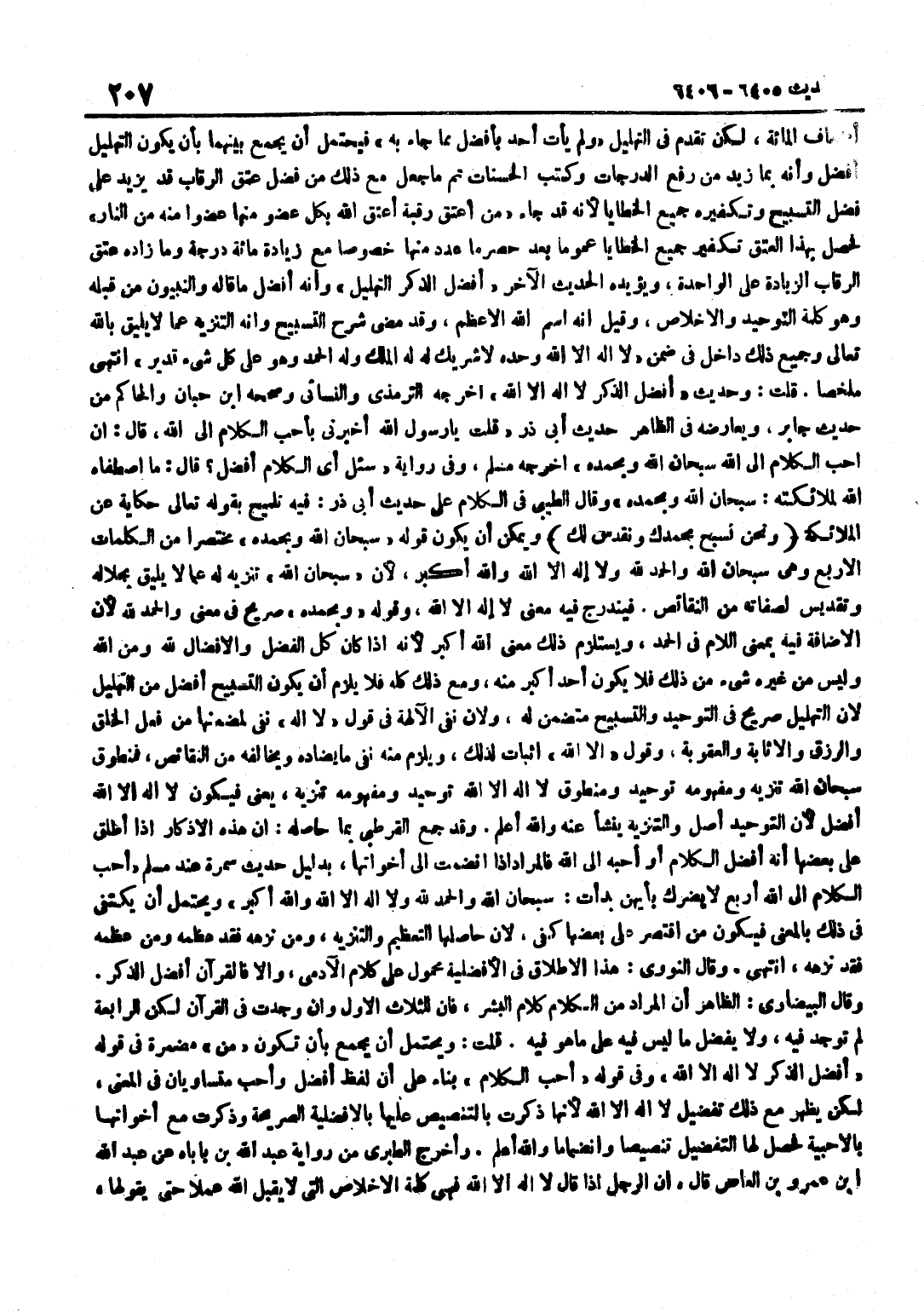 أَضْعَافِ الْمِائَةِ لَكِنْ تَقَدَّمَ فِي التَّهْلِيلِ وَلَمْ يَأْتِ أَحَدٌ بِأَفْضَلَ مِمَّا جَاءَ بِهِ فَيَحْتَمِلُ أَنْ يُجْمَعَ بَيْنَهُمَا بِأَنْ يَكُونَ التَّهْلِيلُ أَفْضَلَ وَأَنَّهُ بِمَا زِيدَ مِنْ رَفْعِ الدَّرَجَاتِ وَكَتْبِ الْحَسَنَاتِ ثُمَّ مَا جُعِلَ مَعَ ذَلِكَ مِنْ فَضْلِ عِتْقِ الرِّقَابِ قَدْ يَزِيدُ عَلَى فَضْلِ التَّسْبِيحِ وَتَكْفِيرِهِ جَمِيعَ الْخَطَايَا لِأَنَّهُ قَدْ جَاءَ مَنْ أَعْتَقَ رَقَبَةً أَعْتَقَ اللَّهُ بِكُلِّ عُضْوٍ مِنْهَا عُضْوًا مِنْهُ مِنَ النَّارِ فَحَصَلَ بِهَذَا الْعِتْقِ تَكْفِيرُ جَمِيعِ الْخَطَايَا عُمُومًا بَعْدَ حَصْرِ مَا عَدَّدَ مِنْهَا خُصُوصًا مَعَ زِيَادَةِ مِائَةِ دَرَجَةٍ وَمَا زَادَهُ عِتْقُ الرِّقَابِ الزِّيَادَةُ عَلَى الْوَاحِدَةِ وَيُؤَيِّدُهُ الْحَدِيثُ الْآخَرُ أَفْضَلُ الذِّكْرِ التَّهْلِيلُ وَأَنَّهُ أَفْضَلُ مَا قَالَهُ وَالنَّبِيُّونَ مِنْ قَبْلِهِ وَهُوَ كَلِمَةُ التَّوْحِيدِ وَالْإِخْلَاصِ وَقِيلَ إِنَّهُ اسْمُ اللَّهِ الْأَعْظَمُ وَقَدْ مَضَى شَرْحُ التَّسْبِيحِ وَأَنَّهُ التَّنْزِيهُ عَمَّا لَا يَلِيقُ بِاللَّهِ تَعَالَى وَجَمِيعُ ذَلِكَ دَاخِلٌ فِي ضِمْنِ لَا إِلَهَ إِلَّا اللَّهُ وَحْدَهُ لَا شَرِيكَ لَهُ لَهُ الْمُلْكُ وَلَهُ الْحَمْدُ وَهُوَ عَلَى كُلِّ شَيْءٍ قَدِيرٌ انْتَهَى مُلَخَّصًا قُلْتُ وَحَدِيثُ أَفْضَلُ الذِّكْرِ لَا إِلَهَ إِلَّا الله أخرجه التِّرْمِذِيّ وَالنَّسَائِيّ وَصَححهُ بن حِبَّانَ وَالْحَاكِمُ مِنْ حَدِيثِ جَابِرٍ وَيُعَارِضُهُ فِي الظَّاهِرِ حَدِيثُ أَبِي ذَرٍّ قُلْتُ يَا رَسُولَ اللَّهِ أَخْبِرْنِي بِأَحَبِّ الْكَلَامِ إِلَى اللَّهِ قَالَ إِنَّ أَحَبَّ الْكَلَامِ إِلَى اللَّهِ سُبْحَانَ اللَّهِ وَبِحَمْدِهِ أَخْرَجَهُ مُسْلِمٌ وَفِي رِوَايَةِ سُئِلَ أَيُّ الْكَلَامِ أَفْضَلُ قَالَ مَا اصْطَفَاهُ اللَّهُ لِمَلَائِكَتِهِ سُبْحَانَ اللَّهِ وَبِحَمْدِهِ وَقَالَ الطِّيبِيُّ فِي الْكَلَامِ عَلَى حَدِيثِ أَبِي ذَرٍّ فِيهِ تَلْمِيحٌ بِقَوْلِهِ تَعَالَى حِكَايَةً عَنِ الْمَلَائِكَةِ وَنَحْنُ نُسَبِّحُ بِحَمْدِكَ ونقدس لَك وَيُمْكِنُ أَنْ يَكُونَ قَوْلُهُ سُبْحَانَ اللَّهِ وَبِحَمْدِهِ مُخْتَصَرًا مِنَ الْكَلِمَاتِ الْأَرْبَعِ وَهِيَ سُبْحَانَ اللَّهِ وَالْحَمْدُ لِلَّهِ وَلَا إِلَهَ إِلَّا اللَّهُ وَاللَّهُ أَكْبَرُ لِأَنَّ سُبْحَانَ اللَّهِ تَنْزِيهٌ لَهُ عَمَّا لَا يَلِيقُ بِجَلَالِهِ وَتَقْدِيسٌ لِصِفَاتِهِ مِنَ النَّقَائِصِ فَيَنْدَرِجُ فِيهِ مَعْنَى لَا إِلَهَ إِلَّا اللَّهُ وَقَوْلُهُ وَبِحَمْدِهِ صَرِيحٌ فِي مَعْنَى وَالْحَمْدُ لِلَّهِ لِأَنَّ الْإِضَافَةَ فِيهِ بِمَعْنَى اللَّامِ فِي الْحَمْدِ وَيَسْتَلْزِمُ ذَلِكَ مَعْنَى اللَّهُ أَكْبَرُ لِأَنَّهُ إِذَا كَانَ كُلُّ الْفَضْلِ وَالْأَفْضَالِ لِلَّهِ وَمِنَ اللَّهِ وَلَيْسَ مِنْ غَيْرِهِ شَيْءٌ مِنْ ذَلِكَ فَلَا يَكُونُ أَحَدٌ أَكْبَرَ مِنْهُ وَمَعَ ذَلِكَ كُلِّهِ فَلَا يَلْزَمُ أَنْ يَكُونَ التَّسْبِيحُ أَفْضَلَ مِنَ التَّهْلِيلِ لِأَنَّ التَّهْلِيلَ صَرِيحٌ فِي التَّوْحِيدِ وَالتَّسْبِيحِ مُتَضَمِّنٌ لَهُ وَلِأَنَّ نَفْيَ الْآلِهَةِ فِي قَوْلِ لَا إِلَهَ نَفْيٌ لِمُضْمَنِهَا مِنْ فِعْلِ الْخَلْقِ وَالرِّزْقِ وَالْإِثَابَةِ وَالْعُقُوبَةِ وَقَوْلُ إِلَّا اللَّهُ إِثْبَاتٌ لِذَلِكَ وَيَلْزَمُ مِنْهُ نَفْيُ مَا يَضَادُّهُ وَيُخَالِفُهُ مِنَ النَّقَائِصِ فَمَنْطُوقُ سُبْحَانَ اللَّهِ تَنْزِيهٌ وَمَفْهُومُهُ تَوْحِيدٌ وَمَنْطُوقُ لَا إِلَهَ إِلَّا اللَّهُ تَوْحِيدٌ وَمَفْهُومُهُ تَنْزِيهٌ يَعْنِي فَيَكُونُ لَا إِلَهَ إِلَّا اللَّهُ أَفْضَلَ لِأَنَّ التَّوْحِيدَ أَصْلٌ وَالتَّنْزِيهُ يَنْ