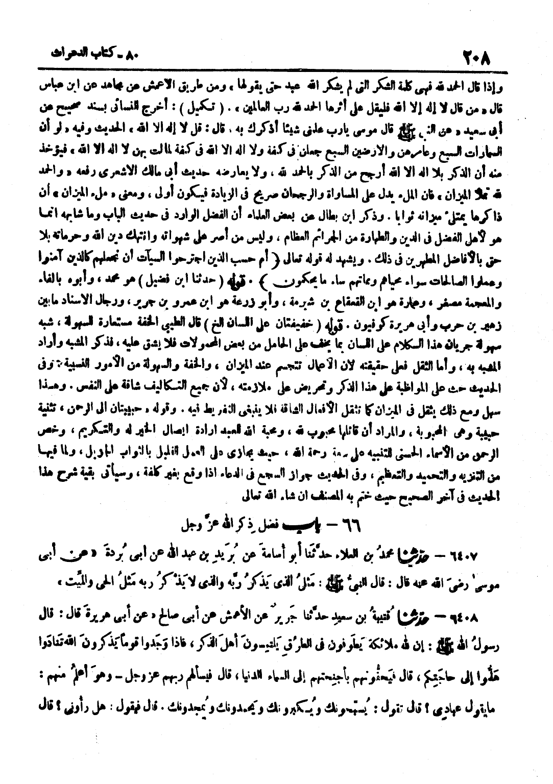 وَإِذَا قَالَ الْحَمْدُ لِلَّهِ فَهِيَ كَلِمَةُ الشُّكْرِ الَّتِي لَمْ يَشْكُرِ اللَّهَ عَبْدٌ حَتَّى يَقَولَهَا وَمن طَرِيق الْأَعْمَش عَن مُجَاهِد عَن بن عَبَّاسٍ قَالَ مَنْ قَالَ لَا إِلَهَ إِلَّا اللَّهُ فَلْيَقُلْ عَلَى أَثَرِهَا الْحَمْدُ لِلَّهِ رَبِّ الْعَالَمِينَ تَكْمِيل أَخْرَجَ النَّسَائِيُّ بِسَنَدٍ صَحِيحٍ عَنْ أَبِي سَعِيدٍ عَنِ النَّبِيِّ صَلَّى اللَّهُ عَلَيْهِ وَسَلَّمَ قَالَ مُوسَى يَا رَبِّ عَلِّمْنِي شَيْئًا أَذْكُرُكُ بِهِ قَالَ قُلْ لَا إِلَهَ إِلَّا اللَّهُ الْحَدِيثَ وَفِيهِ لَوْ أَنَّ السَّمَاوَاتِ السَّبْعَ وَعَامِرَهُنَّ وَالْأَرَضِينَ السَّبْعَ جُعِلْنَ فِي كِفَّةٍ وَلَا إِلَهَ إِلَّا اللَّهُ فِي كِفَّةٍ لَمَالَتْ بِهِنَّ لَا إِلَهَ إِلَّا اللَّهُ فَيُؤْخَذُ مِنْهُ أَنَّ الذِّكْرَ بِلَا إِلَهَ إِلَّا اللَّهُ أَرْجَحُ مِنَ الذِّكْرِ بِالْحَمْدِ لِلَّهِ وَلَا يُعَارِضُهُ حَدِيثُ أَبِي مَالِكٍ الْأَشْعَرِيِّ رَفَعَهُ وَالْحَمْدُ لِلَّهِ تَمْلَأُ الْمِيزَانَ فَإِنَّ الْمِلْءَ يَدُلُّ عَلَى الْمُسَاوَاةِ وَالرُّجْحَانُ صَرِيحٌ فِي الزِّيَادَةِ فَيَكُونُ أَوْلَى وَمَعْنَى مِلْءُ الْمِيزَانِ ان ذاكرها يمتلئ مِيزَانه ثَوابًا وَذكر بن بَطَّالٍ عَنْ بَعْضِ الْعُلَمَاءِ أَنَّ الْفَضْلَ الْوَارِدَ فِي حَدِيثِ الْبَابِ وَمَا شَابَهَهُ إِنَّمَا هُوَ لِأَهْلِ الْفَضْلِ فِي الدِّينِ وَالطَّهَارَةِ مِنَ الْجَرَائِمِ الْعِظَامِ وَلَيْسَ مَنْ أَصَرَّ عَلَى شَهَوَاتِهِ وَانْتَهَكَ دِينَ اللَّهِ وَحُرُمَاتِهِ بِلَا حَقٍّ بِالْأَفَاضِلِ الْمُطَهَّرِينَ فِي ذَلِكَ وَيَشْهَدُ لَهُ قَوْلُهُ تَعَالَى أَمْ حَسِبَ الَّذِينَ اجْتَرَحُوا السَّيِّئَاتِ أَنْ نَجْعَلَهُمْ كَالَّذِينَ آمَنُوا وَعَمِلُوا الصَّالِحَاتِ سَوَاءً مَحْيَاهُمْ وَمَمَاتُهُمْ سَاءَ مَا يحكمون