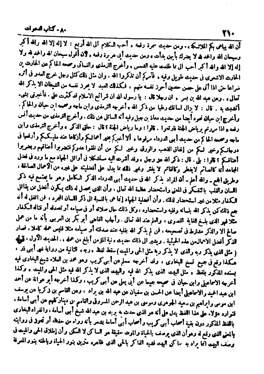 أَنَّ اللَّهَ يُبَاهِي بِكُمُ الْمَلَائِكَةَ وَمِنْ حَدِيثِ سَمُرَةَ رَفَعَهُ أَحَبُّ الْكَلَامِ إِلَى اللَّهِ أَرْبَعٌ لَا إِلَهَ إِلَّا اللَّهُ وَاللَّهُ أَكْبَرُ وَسُبْحَانَ اللَّهِ وَالْحَمْدُ لِلَّهِ لَا يَضُرُّكَ بِأَيِّهِنَّ بَدَأْتَ وَمِنْ حَدِيثِ أَبِي هُرَيْرَةَ رَفَعَهُ لَأَنْ أَقُولَ سُبْحَانَ اللَّهِ وَالْحَمْدُ لِلَّهِ وَلَا إِلَهَ إِلَّا اللَّهُ وَاللَّهُ أَكْبَرُ أَحَبُّ إِلَيَّ مِمَّا طَلَعَتْ عَلَيْهِ الشَّمْسُ وَأَخْرَجَ التِّرْمِذِيُّ وَالنَّسَائِيُّ وَصَحَّحَهُ الْحَاكِمُ عَن الْحَارِث بن الْحَارِث الْأَشْعَرِيّ فِي حَدِيثٌ طَوِيلٌ وَفِيهِ فَآمُرُكُمْ أَنْ تَذْكُرُوا اللَّهَ وَإِنَّ مَثَلَ ذَلِكَ كَمَثَلِ رَجُلٍ خَرَجَ الْعَدُوُّ فِي إثْرِهِ سِرَاعًا حَتَّى إِذَا أَتَى عَلَى حِصْنٍ حَصِينٍ أَحْرَزَ نَفْسَهُ مِنْهُمْ فَكَذَلِكَ الْعَبْدُ لَا يُحْرِزُ نَفْسَهُ مِنَ الشَّيْطَانِ إِلَّا بِذِكْرِ اللَّهِ تَعَالَى وَعَنْ عَبْدِ اللَّهِ بْنِ بُسْرٍ أَنَّ رَجُلًا قَالَ يَا رَسُولَ اللَّهِ إِنَّ شَرَائِعَ الْإِسْلَامِ قَدْ كَثُرَتْ عَلَيَّ فَأَخْبِرْنِي بِشَيْءٍ أَتَشَبَّثُ بِهِ قَالَ لَا يَزَالُ لِسَانُكَ رَطْبًا من ذكر الله أخرجه التِّرْمِذِيّ وبن ماجة وَصَححهُ بن حبَان وَالْحَاكِم واخرج بن حِبَّانَ نَحْوَهُ أَيْضًا مِنْ حَدِيثِ مُعَاذِ بْنِ جَبَلٍ وَفِيهِ أَنَّهُ السَّائِلُ عَنْ ذَلِكَ وَأَخْرَجَ التِّرْمِذِيُّ مِنْ حَدِيثِ أَنَسٍ رَفَعَهُ إِذَا مَرَرْتُمْ بِرِيَاضِ الْجَنَّةِ فَارْتَعُوا قَالُوا وَمَا رِيَاضُ الْجَنَّةِ قَالَ حلق الذّكر واخرج التِّرْمِذِيّ وبن مَاجَهْ وَصَحَّحَهُ الْحَاكِمُ مِنْ حَدِيثِ أَبِي الدَّرْدَاءِ مَرْفُوعًا أَلَا أُخْبِركُمْ بِخَيْرِ أَعْمَالِكُمْ وَأَزْكَاهَا عِنْدَ مَلِيكِكُمْ وَأَرْفَعِهَا فِي دَرَجَاتِكُمْ وَخَيْرٍ لَكُمْ مِنْ إِنْفَاقِ الذَّهَبِ وَالْوَرِقِ وَخَيْرٍ لَكُمْ مِنْ أَنْ تَلْقَوْا عَدُوَّكُمْ فَتَضْرِبُوا أَعْنَاقَهُمْ وَيَضْرِبُوا أَعْنَاقَكُمْ قَالُوا بَلَى قَالَ ذِكْرُ اللَّهِ عَزَّ وَجَلَّ وَقَدْ أَشَرْتُ إِلَيْهِ مُسْتَشْكَلًا فِي أَوَائِلِ الْجِهَادِ مَعَ مَا وَرَدَ فِي فَضْلِ الْمُجَاهِدِ أَنَّهُ كَالصَّائِمِ لَا يُفْطِرُ وَكَالْقَائِمِ لَا يَفْتُرُ وَغَيْرُ ذَلِكَ مِمَّا يَدُلُّ عَلَى أَفْضَلِيَّتِهِ عَلَى غَيْرِهِ مِنَ الْأَعْمَالِ الصَّالِحَةِ وَطَرِيقُ الْجَمْعِ وَاللَّهُ أَعْلَمُ أَنَّ الْمُرَادَ بِذِكْرِ اللَّهِ فِي حَدِيثِ أَبِي الدَّرْدَاءِ الذِّكْرُ الْكَامِلُ وَهُوَ مَا يَجْتَمِعُ فِيهِ ذِكْرُ اللِّسَانِ وَالْقَلْبِ بِالتَّفَكُّرِ فِي الْمَعْنَى وَاسْتِحْضَارِ عَظَمَةِ اللَّهِ تَعَالَى وَأَنَّ الَّذِي يَحْصُلُ لَهُ ذَلِكَ يَكُونُ أَفْضَلَ مِمَّنْ يُقَاتِلُ الْكُفَّارَ مَثَلًا مِنْ غَيْرِ اسْتِحْضَارٍ لِذَلِكَ وَأَنَّ أَفْضَلِيَّةَ الْجِهَادِ إِنَّمَا هِيَ بِالنِّسْبَةِ إِلَى ذِكْرِ اللِّسَانِ الْمُجَرَّدِ فَمَنِ اتَّفَقَ لَهُ أَنَّهُ جَمَعَ ذَلِكَ كَمَنْ يَذْكُرُ اللَّهَ بِلِسَانِهِ وَقَلْبِهِ وَاسْتِحْضَارِهِ وَكُلُّ ذَلِكَ حَالَ صَلَاتِهِ أَوْ فِي صِيَامِهِ أَوْ تَصَدُّقِهِ أَوْ قِتَالِهِ الْكُفَّارَ مَثَلًا فَهُوَ الَّذِي بَلَغَ الْغَايَةَ الْقُصْوَى وَالْعِلْمَ عِنْدَ اللَّهِ تَعَالَى وَأَجَابَ الْقَاضِي أَبُو بَكْرِ بْنُ الْعَرَبِيِّ بِأَنَّهُ مَا مِنْ عَمَلٍ صَالِحٍ إِلَّا وَالذِّكْرُ مُشْتَرَطٌ فِي تَصْحِيحِهِ فَمَنْ لَمْ يَذْكُرِ اللَّهَ بِقَلْبِهِ عِنْدَ صَدَقَتِهِ أَوْ صِيَامِهِ مَثَلًا فَلَيْسَ عَمَلُهُ كَامِلًا فَصَارَ الذِّكْرُ أَفْضَلَ الْأَعْمَالِ مِنْ هَذِهِ الْحَيْثِيَّةِ وَيُشِيرُ إِلَى ذَلِكَ حَدِيثُ نِيَّةُ الْمُؤْمِنِ أَبْلَغُ مِنْ عم