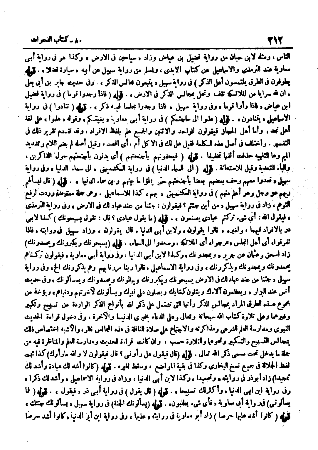 النَّاسِ وَمِثْلَهُ لِابْنِ حِبَّانَ مِنْ رِوَايَةِ فُضَيْلِ بْنِ عِيَاضٍ وَزَادَ سَيَّاحِينَ فِي الْأَرْضِ وَكَذَا هُوَ فِي رِوَايَةِ أَبِي مُعَاوِيَةَ عِنْدَ التِّرْمِذِيِّ والإسماعيلي عَن كتاب الابدي وَلِمُسْلِمٍ مِنْ رِوَايَةِ سُهَيْلٍ عَنْ أَبِيهِ سَيَّارَةً فضلا قَوْله يطوفون فِي الطّرق يَلْتَمِسُونَ أَهْلَ الذِّكْرِ فِي رِوَايَةِ سُهَيْلٍ يَتَّبِعُونَ مَجَالِسَ الذِّكْرِ وَفِي حَدِيثِ جَابِرِ بْنِ أَبِي يَعْلَى إِنَّ لِلَّهِ سَرَايَا مِنَ الْمَلَائِكَةِ تَقِفُ وَتَحِلُّ بِمَجَالِسِ الذِّكْرِ فِي الْأَرْضِ قَوْلُهُ فَإِذَا وَجَدُوا قَوْمًا فِي رِوَايَةِ فُضَيْلِ بْنِ عِيَاضٍ فَإِذَا رَأَوْا قَوْمًا وَفِي رِوَايَةِ سُهَيْلٍ فَإِذَا وَجَدُوا مَجْلِسًا فِيهِ ذِكْرٌ قَوْلُهُ تَنَادَوْا فِي رِوَايَةِ الْإِسْمَاعِيلِيِّ يَتَنَادَوْنَ قَوْلُهُ هَلُمُّوا إِلَى حَاجَتِكُمْ فِي رِوَايَةِ أَبِي مُعَاوِيَةَ بُغْيَتِكُمْ وَقَوْلُهُ هَلُمُّوا عَلَى لُغَةِ أَهْلِ نَجْدٍ وَأَمَّا أَهْلُ الْحِجَازِ فَيَقُولُونَ لِلْوَاحِدِ وَالِاثْنَيْنِ وَالْجَمْعِ هَلُمَّ بِلَفْظِ الْإِفْرَادِ وَقَدْ تَقَدَّمَ تَقْرِيرُ ذَلِكَ فِي التَّفْسِيرِ وَاخْتُلِفَ فِي أَصْلِ هَذِهِ الْكَلِمَةِ فَقِيلَ هَلْ لَكِ فِي الْأَكْلِ أَمَّ أَيِ اقْصِدْ وَقِيلَ أَصْلُهُ لُمَّ بِضَمِّ اللَّامِ وَتَشْدِيدِ الْمِيمِ وَهَا لِلتَّنْبِيهِ حُذِفَتْ أَلِفُهَا تَخْفِيفًا قَوْلُهُ فَيَحُفُّونَهُمْ بِأَجْنِحَتِهِمْ أَيْ يَدْنُونَ بِأَجْنِحَتِهِمْ حَوْلَ الذَّاكِرِينَ وَالْبَاءُ لِلتَّعَدِّيَةِ وَقِيلَ لِلِاسْتِعَانَةِ قَوْلُهُ إِلَى السَّمَاءِ الدُّنْيَا فِي رِوَايَةِ الْكُشْمِيهَنِيِّ إِلَى سَمَاءِ الدُّنْيَا وَفِي رِوَايَةِ سُهَيْلٍ قَعَدُوا مَعَهُمْ وَحَفَّ بَعْضُهُمْ بَعْضًا بِأَجْنِحَتِهِمْ حَتَّى يملؤا مَا بَيْنَهُمْ وَبَيْنَ سَمَاءِ الدُّنْيَا قَوْلُهُ قَالَ فَيَسْأَلُهُمْ رَبُّهُمْ عَزَّ وَجَلَّ وَهُوَ أَعْلَمُ مِنْهُمْ فِي رِوَايَةِ الْكُشْمِيهَنِيِّ بِهِمْ كَذَا لِلْإِسْمَاعِيلِيِّ وَهِيَ جُمْلَةٌ مُعْتَرِضَةٌ وَرَدَتْ لِرَفْعِ التَّوَهُّمِ زَادَ فِي رِوَايَةِ سُهَيْلٍ مِنْ أَيْنَ جِئْتُمْ فَيَقُولُونَ جِئْنَا مِنْ عِنْدِ عِبَادٍ لَكَ فِي الْأَرْضِ وَفِي رِوَايَةِ التِّرْمِذِيِّ فَيَقُولُ اللَّهُ أَيَّ شَيْءٍ تَرَكْتُمْ عِبَادِي يَصْنَعُونَ قَوْلُهُ مَا يَقُولُ عِبَادِي قَالَ تَقُولُ يُسَبِّحُونَكَ كَذَا لِأَبِي ذَرٍّ بِالْإِفْرَادِ فِيهِمَا وَلِغَيْرِهِ قَالُوا يَقُولُونَ وَلِابْنِ أَبِي الدُّنْيَا قَالَ يَقُولُونَ وَزَادَ سُهَيْلٌ فِي رِوَايَتِهِ فَإِذَا تَفَرَّقُوا أَيْ أَهْلُ الْمَجْلِسِ عَرَجُوا أَيِ الْمَلَائِكَةُ وَصَعِدُوا إِلَى السَّمَاءِ قَوْلُهُ يُسَبِّحُونَكَ وَيُكَبِّرُونَكَ وَيَحْمَدُونَكَ زَادَ إِسْحَاقُ وَعُثْمَانُ عَنْ جَرِيرٍ وَيُمَجِّدُونَكَ وَكَذَا لِابْنِ أَبِي الدُّنْيَا وَفِي رِوَايَةِ أَبِي مُعَاوِيَةَ فَيَقُولُونَ تَرَكْنَاهُمْ يَحْمَدُونَكَ وَيُمَجِّدُونَكَ وَيَذْكُرُونَكَ وَفِي رِوَايَةِ الْإِسْمَاعِيلِيِّ قَالُوا رَبَّنَا مَرَرْنَا بِهِمْ وَهُمْ يَذْكُرُونَكَ إِلَخْ وَفِي رِوَايَةِ سُهَيْلٍ جِئْنَا مِنْ عِنْدِ عِبَادٍ لَكَ فِي الْأَرْضِ يُسَبِّحُونَكَ وَيُكَبِّرُونَكَ وَيُهَلِّلُونَكَ وَيَحْمَدُونَكَ وَيَسْأَلُونَكَ وَفِي حَدِيثِ أَنَسٍ عِنْدَ الْبَزَّارِ وَيُعَظِّمُونَ آلَاءَكَ وَيَتْلُونَ كِتَابَكَ وَيُصَلُّونَ عَلَى نَبِيِّكَ وَيَسْأَلُونَكَ لِآخِرَتِهِمْ وَدُنْيَاهُمْ وَيُؤْخَذُ مِنْ مَجْمُوعِ هَذِهِ الطُّرُقِ الْمُرَادُ بِمَجَالِسِ الذِّكْرِ وَأَنَّهَا الَّتِي تَشْتَمِلُ عَلَى ذِكْرِ اللَّهِ بِأَنْوَاعِ الذِّكْرِ الْوَارِدَةِ م