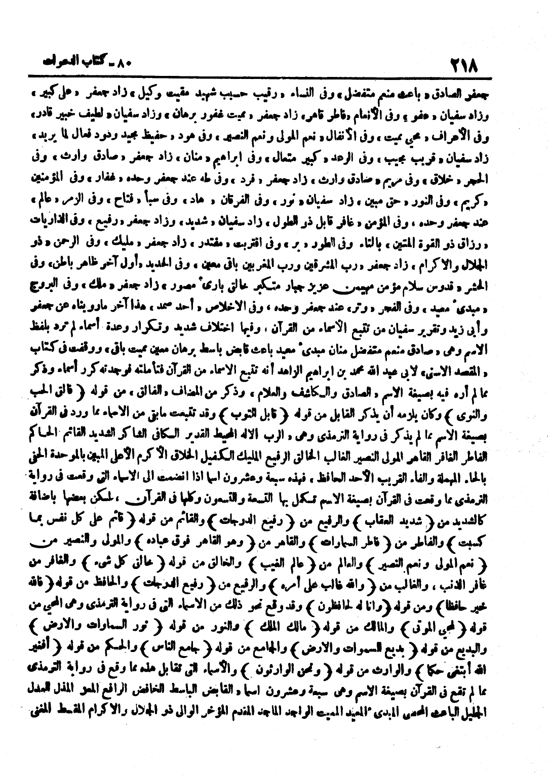جَعْفَرٌ الصَّادِقُ بَاعِثٌ مُنْعِمٌ مُتَفَضِّلٌ وَفِي النِّسَاءِ رَقِيبٌ حَسِيبٌ شَهِيدٌ مُقِيتٌ وَكِيلٌ زَادَ جَعْفَرٌ عَلِيٌّ كَبِيرٌ وَزَادَ سُفْيَانُ عَفُوٌّ وَفِي الْأَنْعَامِ فاطر قاهر زَاد جَعْفَرٌ مُمِيتٌ غَفُورٌ بُرْهَانٌ وَزَادَ سُفْيَانُ لَطِيفٌ خَبِيرٌ قَادِرٌ وَفِي الْأَعْرَافِ مُحْيِي مُمِيتٌ وَفِي الْأَنْفَالِ نِعْمَ الْمَوْلَى وَنِعْمَ النَّصِيرُ وَفِي هُودٍ حَفِيظٌ مَجِيدٌ وَدُودٌ فَعَّالٌ لِمَا يُرِيدُ زَادَ سُفْيَانُ قَرِيبٌ مُجِيبٌ وَفِي الرَّعْدِ كَبِيرٌ مُتَعَالٍ وَفِي إِبْرَاهِيمَ مَنَّانٌ زَادَ جَعْفَرٌ صَادِقٌ وَارِثٌ وَفِي الْحِجْرِ خَلَّاقٌ وَفِي مَرْيَمَ صَادِقٌ وَارِثٌ زَادَ جَعْفَرٌ فَرْدٌ وَفِي طه عِنْدَ جَعْفَرٍ وَحْدَهُ غَفَّارٌ وَفِي الْمُؤْمِنِينَ كَرِيمٌ وَفِي النُّورِ حَقٌّ مُبِينٌ زَادَ سُفْيَانُ نُورٌ وَفِي الْفُرْقَانِ هَادٍ وَفِي سَبَأٍ فَتَّاحٌ وَفِي الزُّمَرِ عَالِمٌ عِنْدَ جَعْفَرٍ وَحْدَهُ وَفِي الْمُؤْمِنِ غَافِرٌ قَابِلٌ ذُو الطَّوْلِ زَادَ سُفْيَانُ شَدِيدٌ وَزَادَ جَعْفَرٌ رَفِيعٌ وَفِي الذَّارِيَاتِ رَزَّاقٌ ذُو الْقُوَّةِ الْمَتِينُ بِالتَّاءِ وَفِي الطُّورِ بَرٌّ وَفِي اقْتَرَبَتْ مُقْتَدِرٌ زَادَ جَعْفَرٌ مَلِيكٌ وَفِي الرَّحْمَنِ ذُو الْجَلَالِ وَالْإِكْرَامِ زَادَ جَعْفَرٌ رَبُّ الْمَشْرِقَيْنِ وَرَبُّ الْمَغْرِبَيْنِ بَاقِي مُعِينٌ وَفِي الْحَدِيدِ أَوَّلٌ آخِرُ ظَاهِرٌ بَاطِنٌ وَفِي الْحَشْرِ قُدُّوسٌ سَلَامٌ مُؤْمِنٌ مُهَيْمِنٌ عَزِيزٌ جَبَّار متكبر خَالق باريء مُصَور زَاد جَعْفَر ملك وَفِي البروج مبديء مُعِيدٌ وَفِي الْفَجْرِ وَتْرٌ عِنْدَ جَعْفَرٍ وَحْدَهُ وَفِي الْإِخْلَاصِ أَحَدٌ صَمَدٌ هَذَا آخِرُ مَا رُوِّينَاهُ عَنْ جَعْفَرٍ وَأَبِي زَيْدٍ وَتَقْرِيرُ سُفْيَانَ مِنْ تَتَبُّعِ الْأَسْمَاءِ مِنَ الْقُرْآنِ وَفِيهَا اخْتِلَافٌ شَدِيدٌ وَتَكْرَارٌ وَعِدَّةُ أَسْمَاءٍ لَمْ تَرِدْ بِلَفْظِ الِاسْم وَهِي صَادِق منعم متفضل منان مبديء مُعِيدٌ بَاعِثٌ قَابِضٌ بَاسِطٌ بُرْهَانٌ مُعِينٌ مُمِيتٌ بَاقِي وَوَقَفْتُ فِي كِتَابِ الْمَقْصِدِ الْأَسْنَى لِأَبِي عَبْدِ اللَّهِ مُحَمَّدِ بْنِ إِبْرَاهِيمَ الزَّاهِدِ أَنَّهُ تَتَبَّعَ الْأَسْمَاءَ مِنَ الْقُرْآنِ فَتَأَمَّلْتُهُ فَوَجَدْتُهُ كَرَّرَ أَسْمَاءً وَذَكَرَ مِمَّا لَمْ أَرَهُ فِيهِ بِصِيغَةِ الِاسْمِ الصَّادِقَ وَالْكَاشِفَ وَالْعَلَّامَ وَذَكَرَ مِنَ الْمُضَافِ الفالق من قَوْله فالق الْحبّ والنوى وَكَانَ يَلْزَمُهُ أَنْ يَذْكُرَ الْقَابِلَ مِنْ قَوْلِهِ قَابل التوب وَقَدْ تَتَبَّعْتُ مَا بَقِيَ مِنَ الْأَسْمَاءِ مِمَّا وَرَدَ فِي الْقُرْآنِ بِصِيغَةِ الِاسْمِ مِمَّا لَمْ يُذْكَرْ فِي رِوَايَةِ التِّرْمِذِيِّ وَهِيَ الرَّبُّ الْإِلَهُ الْمُحِيطُ الْقَدِيرُ الْكَافِي الشَّاكِرُ الشَّدِيدُ الْقَائِمُ الْحَاكِمُ الْفَاطِرُ الْغَافِرُ الْقَاهِرُ الْمَوْلَى النَّصِيرُ الْغَالِبُ الْخَالِقُ الرَّفِيعُ الْمَلِيكُ الْكَفِيلُ الْخَلَّاقُ الْأَكْرَمُ الْأَعْلَى الْمُبِينُ بِالْمُوَحَّدَةِ الْحَفِيُّ بِالْحَاءِ الْمُهْمَلَةِ وَالْفَاءِ الْقَرِيبُ الْأَحَدُ الْحَافِظُ فَهَذِهِ سَبْعَةٌ وَعِشْرُونَ اسْمًا إِذَا انْضَمَّتْ إِلَى الْأَسْمَاءِ الَّتِي وَقَعَتْ فِي رِوَايَةِ التِّرْمِذِيِّ مِمَّا وَقَعَتْ فِي الْقُرْآنِ بِصِيغَةِ الِاسْمِ تَكْمُلُ بِهَا التِّسْعَةُ وَالتِّسْعُونَ وَكُلُّهَا فِي الْقُرْآنِ لَكِنَّ بَعْضهَا بِإِضَافَة كالشديد من شَدِيد الْعقَاب والرفيع من رفيع الدَّرَجَات وَالْقَائِمِ مِنْ قَوْلِهِ قَائِمٌ عَلَى كُلِّ نَفْسٍ بِمَا كسبت والفاطر من فاطر السَّمَاوَات والقاهر من وَهُوَ القاهر فَوق عباده وَالْمَوْلَى وَالنَّصِيرِ مِن