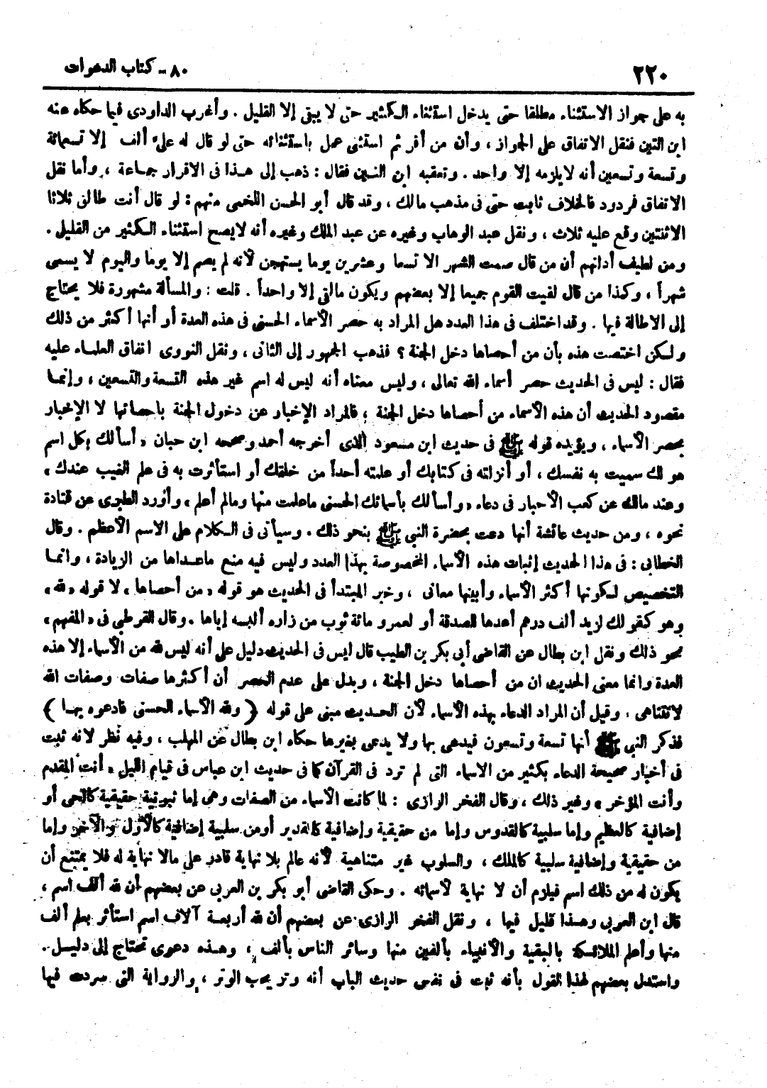 بِهِ عَلَى جَوَازِ الِاسْتِثْنَاءِ مُطْلَقًا حَتَّى يَدْخُلَ اسْتِثْنَاءُ الْكَثِيرِ حَتَّى لَا يَبْقَى إِلَّا الْقَلِيلُ وَأغْرب الدَّاودِيّ فِيمَا حَكَاهُ عَنهُ بن التِّينِ فَنَقَلَ الِاتِّفَاقَ عَلَى الْجَوَازِ وَأَنَّ مَنْ أَقَرَّ ثُمَّ اسْتَثْنَى عَمِلَ بِاسْتِثْنَائِهِ حَتَّى لَوْ قَالَ لَهُ عَلَيَّ أَلْفٌ إِلَّا تِسْعَمِائَةٍ وَتِسْعَةً وَتِسْعِينَ أَنَّهُ لَا يَلْزَمُهُ إِلَّا وَاحِدٌ وَتَعَقَّبَهُ بن التِّينِ فَقَالَ ذَهَبَ إِلَى هَذَا فِي الْإِقْرَارِ جَمَاعَةٌ وَأَمَّا نَقْلُ الِاتِّفَاقِ فَمَرْدُودٌ فَالْخِلَافُ ثَابِتٌ حَتَّى فِي مَذْهَبِ مَالِكٍ وَقَدْ قَالَ أَبُو الْحَسَنِ اللَّخْمِيُّ مِنْهُمْ لَوْ قَالَ أَنْتِ طَالِقٌ ثَلَاثًا الاثنتين وَقَعَ عَلَيْهِ ثَلَاثٌ وَنَقَلَ عَبْدُ الْوَهَّابِ وَغَيْرُهُ عَنْ عَبْدِ الْمَلِكِ وَغَيْرُهُ أَنَّهُ لَا يَصِحُّ اسْتِثْنَاءُ الْكَثِيرِ مِنَ الْقَلِيلِ وَمِنْ لَطِيفِ أَدِلَّتِهِمْ أَنَّ مَنْ قَالَ صُمْتُ الشَّهْرَ إِلَّا تِسْعًا وَعِشْرِينَ يَوْمًا يُسْتَهْجَنُ لِأَنَّهُ لَمْ يَصُمْ إِلَّا يَوْمًا وَالْيَوْمُ لَا يُسَمَّى شَهْرًا وَكَذَا مَنْ قَالَ لَقِيتُ الْقَوْمَ جَمِيعًا إِلَّا بَعْضَهَمْ وَيَكُونُ مَا لَقِيَ إِلَّا وَاحِدًا قُلْتُ وَالْمَسْأَلَةُ مَشْهُورَةٌ فَلَا يُحْتَاجُ إِلَى الْإِطَالَةِ فِيهَا وَقَدِ اخْتُلِفَ فِي هَذَا الْعَدَدِ هَلِ الْمُرَادُ بِهِ حَصْرُ الْأَسْمَاءِ الْحُسْنَى فِي هَذِهِ الْعِدَّةِ أَوْ أَنَّهَا أَكْثَرُ مِنْ ذَلِكَ وَلَكِنِ اخْتَصَّتْ هَذِهِ بِأَنَّ مَنْ أَحْصَاهَا دَخَلَ الْجَنَّةَ فَذَهَبَ الْجُمْهُورُ إِلَى الثَّانِي وَنَقَلَ النَّوَوِيُّ اتِّفَاقَ الْعُلَمَاءِ عَلَيْهِ فَقَالَ لَيْسَ فِي الْحَدِيثِ حَصْرُ أَسْمَاءِ اللَّهِ تَعَالَى وَلَيْسَ مَعْنَاهُ أَنَّهُ لَيْسَ لَهُ اسْمٌ غَيْرُ هَذِهِ التِّسْعَةِ وَالتِّسْعِينَ وَإِنَّمَا مَقْصُودُ الْحَدِيثِ أَنَّ هَذِهِ الْأَسْمَاءَ مَنْ أَحْصَاهَا دَخَلَ الْجَنَّةَ فَالْمُرَادُ الْإِخْبَارُ عَنْ دُخُولِ الْجَنَّةِ بِإِحْصَائِهَا لَا الْإِخْبَارُ بِحَصْرِ الْأَسْمَاءِ وَيُؤَيِّدُهُ قَوْلُهُ صَلَّى اللَّهُ عَلَيْهِ وَسَلَّمَ فِي حَدِيثِ بن مَسْعُود الَّذِي أخرجه احْمَد وَصَححهُ بن حِبَّانَ أَسْأَلُكَ بِكُلِّ اسْمٍ هُوَ لَكَ سَمَّيْتَ بِهِ نَفْسَكَ أَوْ أَنْزَلْتَهُ فِي كِتَابِكَ أَوْ عَلَّمْتَهُ أَحَدًا مِنْ خَلْقِكَ أَوِ اسْتَأْثَرْتَ بِهِ فِي عِلْمِ الْغَيْبِ عِنْدَكَ وَعِنْدَ مَالِكٍ عَنْ كَعْبِ الْأَحْبَارِ فِي دُعَاءِ وَأَسْأَلُكَ بِأَسْمَائِكَ الْحُسْنَى مَا عَلِمْتُ مِنْهَا وَمَا لَمْ أَعْلَمْ وَأَوْرَدَ الطَّبَرِيُّ عَنْ قَتَادَةَ نَحْوَهُ وَمِنْ حَدِيثِ عَائِشَةَ أَنَّهَا دَعَتْ بِحَضْرَةِ النَّبِيِّ صَلَّى اللَّهُ عَلَيْهِ وَسَلَّمَ بِنَحْوِ ذَلِكَ وَسَيَأْتِي فِي الْكَلَامِ عَلَى الِاسْمِ الْأَعْظَمِ وَقَالَ الْخَطَّابِيُّ فِي هَذَا الْحَدِيثِ إِثْبَاتُ هَذِهِ الْأَسْمَاءِ الْمَخْصُوصَةِ بِهَذَا الْعَدَدِ وَلَيْسَ فِيهِ مَنْعُ مَا عَدَاهَا مِنَ الزِّيَادَةِ وَإِنَّمَا التَّخْصِيص لِكَوْنِهَا أَكْثَرَ الْأَسْمَاءِ وَأَبْيَنَهَا مَعَانِيَ وَخَبَرُ الْمُبْتَدَأِ فِي الْحَدِيثِ هُوَ قَوْلُهُ مَنْ أَحْصَاهَا لَا قَوْلُهُ لِلَّهِ وَهُوَ كَقَوْلِكَ لِزَيْدٍ أَلْفُ دِرْهَمٍ أَعَدَّهَا لِلصَّدَقَةِ أَوْ لِعَمْرٍو مِائَةُ ثَوْبٍ مَنْ زَارَهُ أَلْبَسَهُ إِيَّاهَا وَقَالَ الْقُرْطُبِيُّ فِي الْمُفْهِمِ نَحْو ذَلِك وَنقل بن بَطَّالٍ عَنِ الْقَاضِي أَبِي بَكْرِ بْنِ الطَّيِّبِ قَالَ لَيْسَ فِي الْحَدِيثِ دَلِيلٌ عَلَى أَنَّهُ لَيْسَ لِلَّهِ مِنَ الْأَسْمَاءِ إِلَّا هَذِهِ الْعِدَّةُ وَإِنَّمَا مَعْنَى الْ