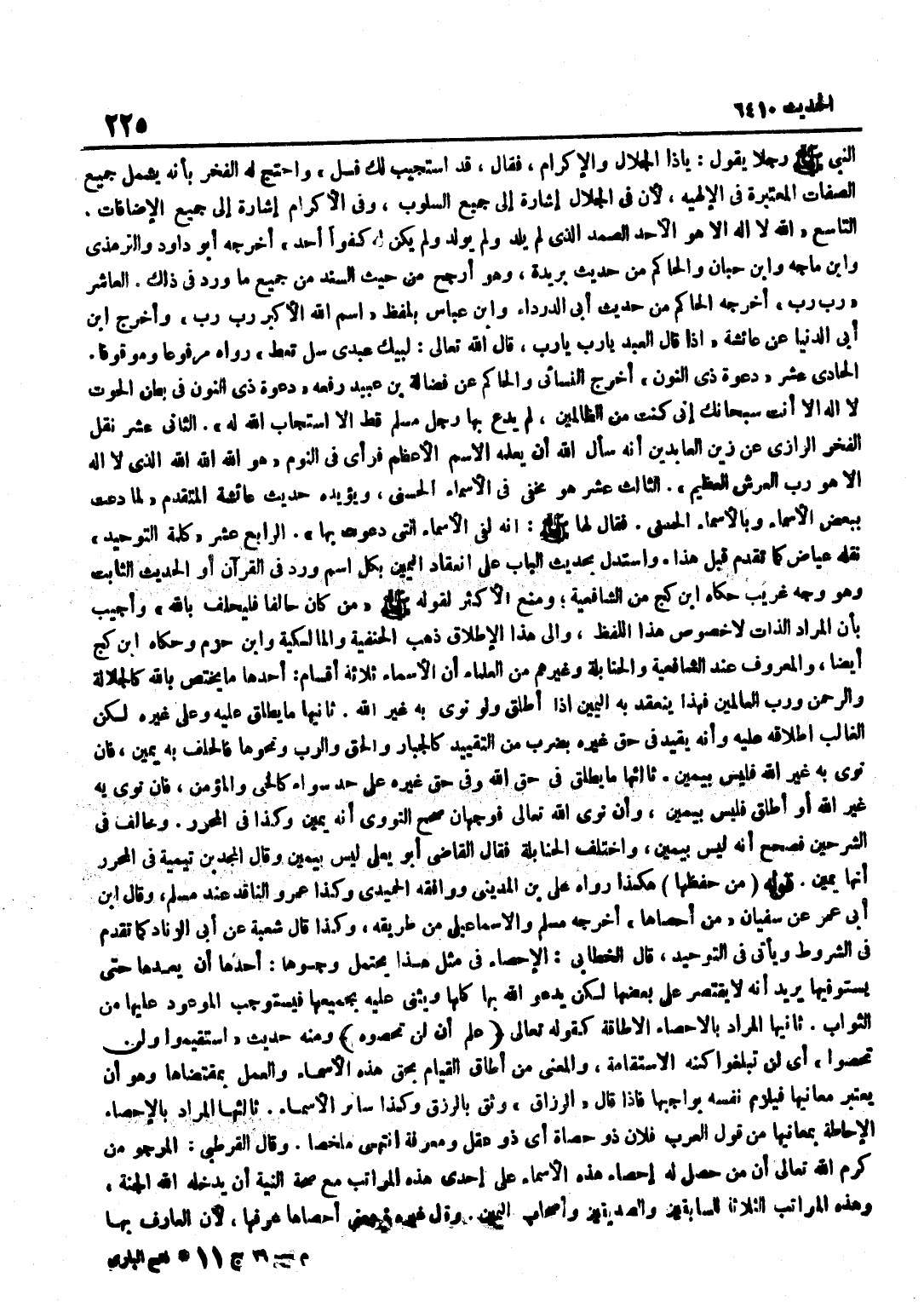 النَّبِيُّ صَلَّى اللَّهُ عَلَيْهِ وَسَلَّمَ رَجُلًا يَقُولُ يَاذَا الْجَلَالِ وَالْإِكْرَامِ فَقَالَ قَدِ اسْتُجِيبَ لَكَ فَسَلْ وَاحْتَجَّ لَهُ الْفَخْرُ بِأَنَّهُ يَشْمَلُ جَمِيعَ الصِّفَاتِ الْمُعْتَبَرَةِ فِي الْإِلَهِيَّةِ لِأَنَّ فِي الْجَلَالَ إِشَارَةً إِلَى جَمِيعِ السُّلُوبِ وَفِي الْإِكْرَامِ إِشَارَةً إِلَى جَمِيعِ الْإِضَافَاتِ التَّاسِعُ اللَّهُ لَا إِلَهَ إِلَّا هُوَ الْأَحَدُ الصَّمَدُ الَّذِي لَمْ يَلِدْ وَلَمْ يُولَدْ وَلَمْ يَكُنْ لَهُ كُفُوًا أَحَدٌ أَخْرَجَهُ أَبُو دَاوُد وَالتِّرْمِذِيّ وبن ماجة وبن حِبَّانَ وَالْحَاكِمُ مِنْ حَدِيثِ بُرَيْدَةَ وَهُوَ أَرْجَحُ مِنْ حَيْثُ السَّنَدُ مِنْ جَمِيعِ مَا وَرَدَ فِي ذَلِكَ الْعَاشِرُ رَبِّ رَبِّ أَخْرَجَهُ الْحَاكِمُ من حَدِيث أبي الدَّرْدَاء وبن عَبَّاسٍ بِلَفْظِ اسْمُ اللَّهِ الْأَكْبَرُ رَبِّ رَبِّ واخرج بن أَبِي الدُّنْيَا عَنْ عَائِشَةَ إِذَا قَالَ الْعَبْدُ يَا رَبِّ يَا رَبِّ قَالَ اللَّهُ تَعَالَى لَبَّيْكَ عَبْدِي سَلْ تُعْطَ رَوَاهُ مَرْفُوعًا وَمَوْقُوفًا الْحَادِيَ عَشَرَ دَعْوَةُ ذِي النُّونِ أَخْرَجَ النَّسَائِيُّ وَالْحَاكِمُ عَنْ فَضَالَةَ بْنِ عُبَيْدٍ رَفَعَهُ دَعْوَةُ ذِي النُّونِ فِي بَطْنِ الْحُوتِ لَا إِلَهَ إِلَّا أَنْتَ سُبْحَانَكَ إِنِّي كُنْتُ مِنَ الظَّالِمِينَ لَمْ يَدْعُ بِهَا رَجُلٌ مُسْلِمٌ قَطُّ إِلَّا اسْتَجَابَ اللَّهُ لَهُ الثَّانِيَ عَشَرَ نَقَلَ الْفَخْرُ الرَّازِيُّ عَنْ زَيْنِ الْعَابِدِينَ أَنَّهُ سَأَلَ اللَّهَ أَنْ يُعَلِّمَهُ الِاسْمَ الْأَعْظَمَ فَرَأَى فِي النَّوْمِ هُوَ اللَّهُ اللَّهُ اللَّهُ الَّذِي لَا إِلَهَ إِلَّا هُوَ رَبُّ الْعَرْشِ الْعَظِيمِ الثَّالِثَ عَشَرَ هُوَ مَخْفِيٌّ فِي الْأَسْمَاءِ الْحُسْنَى وَيُؤَيِّدُهُ حَدِيثُ عَائِشَةَ الْمُتَقَدِّمُ لَمَّا دَعَتْ بِبَعْضِ الْأَسْمَاءِ وَبِالْأَسْمَاءِ الْحُسْنَى فَقَالَ لَهَا صَلَّى اللَّهُ عَلَيْهِ وَسَلَّمَ إِنَّهُ لَفِي الْأَسْمَاءِ الَّتِي دَعَوْتِ بِهَا الرَّابِعَ عشر كلمة التَّوْحِيد نَقله عِيَاض كَمَا تَقَدَّمَ قَبْلَ هَذَا وَاسْتُدِلَّ بِحَدِيثِ الْبَابِ عَلَى انْعِقَادِ الْيَمِينِ بِكُلِّ اسْمٍ وَرَدَ فِي الْقُرْآنِ أَوِ الْحَدِيثِ الثَّابِتِ وَهُوَ وَجْهٌ غَرِيبٌ حَكَاهُ بن كَجٍّ مِنَ الشَّافِعِيَّةِ وَمَنَعَ الْأَكْثَرُ لِقولِهِ صَلَّى اللَّهُ عَلَيْهِ وَسَلَّمَ مَنْ كَانَ حَالِفًا فَلْيَحْلِفْ بِاللَّهِ وَأُجِيبَ بِأَنَّ الْمُرَادَ الذَّاتُ لَا خُصُوصُ هَذَا اللَّفْظِ وَإِلَى هَذَا الْإِطْلَاقِ ذَهَبَ الْحَنَفِيَّةُ والمالكية وبن حزم وَحَكَاهُ بن كَجٍّ أَيْضًا وَالْمَعْرُوفُ عِنْدَ الشَّافِعِيَّةِ وَالْحَنَابِلَةِ وَغَيْرِهِمْ مِنَ الْعُلَمَاءِ أَنَّ الْأَسْمَاءَ ثَلَاثَةُ أَقْسَامٍ أَحَدُهَا مَا يَخْتَصُّ بِاللَّهِ كَالْجَلَالَةِ وَالرَّحْمَنِ وَرَبِّ الْعَالَمِينَ فَهَذَا يَنْعَقِدُ بِهِ الْيَمِينُ إِذَا أُطْلِقَ وَلَوْ نَوَى بِهِ غَيْرَ اللَّهِ ثَانِيهَا مَا يُطْلَقُ عَلَيْهِ وَعَلَى غَيْرِهِ لَكِنَّ الْغَالِبَ إِطْلَاقُهُ عَلَيْهِ وَأَنَّهُ يُقَيَّدُ فِي حَقِّ غَيْرِهِ بِضَرْبٍ مِنَ التَّقْيِيدِ كَالْجَبَّارِ وَالْحَقِّ وَالرَّبِّ وَنَحْوِهَا فَالْحَلِفُ بِهِ يَمِينٌ فَإِنْ نَوَى بِهِ غَيْرَ اللَّهِ فَلَيْسَ بِيَمِينٍ ثَالِثُهَا مَا يُطْلَقُ فِي حَقِّ اللَّهِ وَفِي حَقِّ غَيْرِهِ عَلَى حَدٍّ سَوَاءٍ كَالْحَيِّ وَالْمُؤْمِنِ فَإِنْ نَوَى بِهِ غَيْرَ اللَّهِ أَوْ أَطْلَقَ فَلَيْسَ بِيَمِينٍ وَإِنْ نَوَى اللَّهَ تَعَالَى فَوَجْهَانِ صَحَّحَ النَّوَوِيُّ أَنَّهُ يَمِينٌ وَكَذَا فِي الْمُحَرَّرِ وَخَالَفَ فِي الشَّرْحَيْنِ فَصَحَّحَ أَنَّهُ لَيْسَ بِيَمِي
