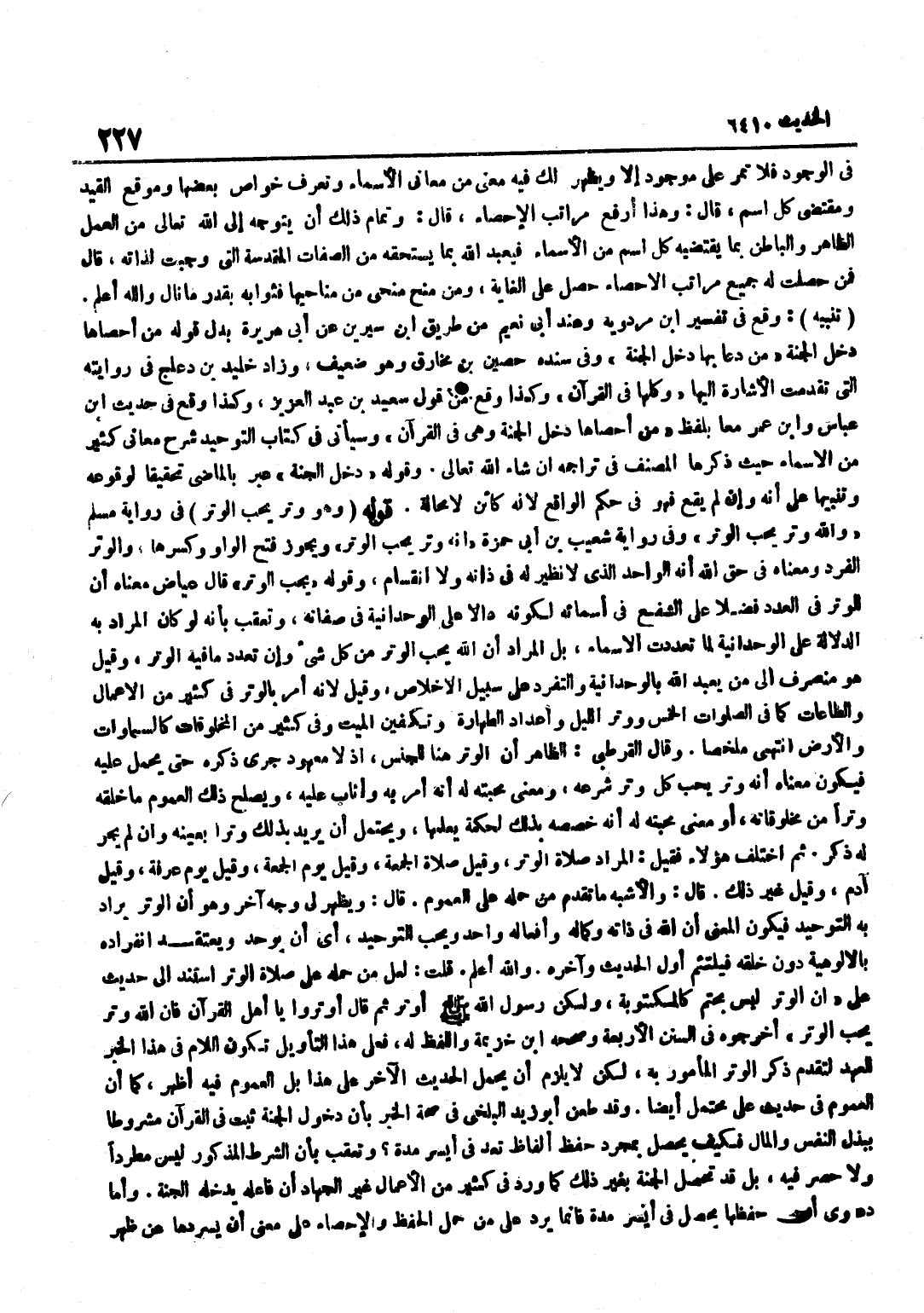 فِي الْوُجُودِ فَلَا تَمُرُّ عَلَى مَوْجُودٍ إِلَّا وَيَظْهَرُ لَكَ فِيهِ مَعْنًى مِنْ مَعَانِي الْأَسْمَاءِ وَتَعْرِفُ خَوَاصَّ بَعْضِهَا وَمَوْقِعَ الْقَيْدِ وَمُقْتَضَى كُلِّ اسْمٍ قَالَ وَهَذَا أَرْفَعُ مَرَاتِبِ الْإِحْصَاءِ قَالَ وَتَمَامُ ذَلِكَ أَنْ يَتَوَجَّهَ إِلَى اللَّهِ تَعَالَى مِنَ الْعَمَلِ الظَّاهِرِ وَالْبَاطِنِ بِمَا يَقْتَضِيهِ كُلُّ اسْمٍ مِنَ الْأَسْمَاءِ فَيَعْبُدُ اللَّهَ بِمَا يَسْتَحِقُّهُ مِنَ الصِّفَاتِ الْمُقَدَّسَةِ الَّتِي وَجَبَتْ لِذَاتِهِ قَالَ فَمَنْ حَصَلَتْ لَهُ جَمِيعُ مَرَاتِبِ الْإِحْصَاءِ حَصَلَ عَلَى الْغَايَةِ وَمَنْ مُنِحَ مَنْحًى مِنْ مَنَاحِيهَا فَثَوَابُهُ بِقَدْرِ مَا نَالَ وَاللَّهُ أَعْلَمُ تَنْبِيه وَقع فِي تَفْسِير بن مرْدَوَيْه وَعند أبي نعيم من طَرِيق بن سِيرِينَ عَنْ أَبِي هُرَيْرَةَ بَدَلَ قَوْلِهِ مَنْ أَحْصَاهَا دَخَلَ الْجَنَّةَ مَنْ دَعَا بِهَا دَخَلَ الْجَنَّةَ وَفِي سَنَدِهِ حُصَيْنُ بْنُ مُخَارِقٍ وَهُوَ ضَعِيفٌ وَزَادَ خُلَيْدُ بْنُ دَعْلَجٍ فِي رِوَايَتِهِ الَّتِي تَقَدَّمَتِ الْإِشَارَةُ إِلَيْهَا وَكُلُّهَا فِي الْقُرْآنِ وَكَذَا وَقَعَ مِنْ قَوْلِ سَعِيدِ بْنِ عَبْدِ الْعَزِيز وَكَذَا وَقع فِي حَدِيث بن عَبَّاس وبن عُمَرَ مَعًا بِلَفْظِ مَنْ أَحْصَاهَا دَخَلَ الْجَنَّةَ وَهِيَ فِي الْقُرْآنِ وَسَيَأْتِي فِي كِتَابِ التَّوْحِيدِ شَرْحُ مَعَانِي كَثِيرٍ مِنَ الْأَسْمَاءِ حَيْثُ ذَكَرَهَا الْمُصَنِّفُ فِي تَرَاجِمِهِ إِنْ شَاءَ اللَّهُ تَعَالَى وَقَوْلُهُ دَخَلَ الْجَنَّةُ عَبَّرَ بِالْمَاضِي تَحْقِيقًا لِوُقُوعِهِ وَتَنْبِيهًا عَلَى أَنَّهُ وَإِنْ لَمْ يَقَعْ فَهُوَ فِي حُكْمِ الْوَاقِعِ لِأَنَّهُ كَائِنٌ لَا مَحَالَةَ قَوْلُهُ وَهُوَ وِتْرٌ يُحِبُّ الْوِتْرَ فِي رِوَايَةِ مُسْلِمٍ وَاللَّهُ وِتْرٌ يُحِبُّ الْوِتْرَ وَفِي رِوَايَةِ شُعَيْبِ بْنِ أَبِي حَمْزَةَ أَنَّهُ وِتْرٌ يُحِبُّ الْوِتْرَ وَيَجُوزُ فَتْحُ الْوَاوِ وَكَسْرُهَا وَالْوِتْرُ الْفَرْدُ وَمَعْنَاهُ فِي حَقِّ اللَّهِ أَنَّهُ الْوَاحِدُ الَّذِي لَا نَظِيرَ لَهُ فِي ذَاتِهِ وَلَا انْقِسَامَ وَقَوْلُهُ يُحِبُّ الْوِتْرَ قَالَ عِيَاضٌ مَعْنَاهُ أَنَّ الْوِتْرَ فِي الْعَدَدِ فَضْلًا عَلَى الشَّفْعِ فِي أَسْمَائِهِ لِكَوْنِهِ دَالًّا عَلَى الْوَحْدَانِيَّةِ فِي صِفَاتِهِ وَتُعُقِّبَ بِأَنَّهُ لَوْ كَانَ الْمُرَادُ بِهِ الدَّلَالَةَ عَلَى الْوَحْدَانِيَّةِ لَمَا تَعَدَّدَتِ الْأَسْمَاءُ بَلِ الْمُرَادُ أَنَّ اللَّهَ يُحِبُّ الْوِتْرَ مِنْ كُلِّ شَيْءٍ وَإِنْ تَعَدَّدَ مَا فِيهِ الْوِتْرُ وَقِيلَ هُوَ مُنْصَرِفٌ إِلَى مَنْ يَعْبُدُ اللَّهَ بِالْوَحْدَانِيَّةِ وَالتَّفَرُّدِ عَلَى سَبِيلِ الْإِخْلَاصِ وَقِيلَ لِأَنَّهُ أَمَرَ بِالْوِتْرِ فِي كَثِيرٍ مِنَ الْأَعْمَالِ وَالطَّاعَاتِ كَمَا فِي الصَّلَوَاتِ الْخَمْسِ وَوِتْرِ اللَّيْلِ وَأَعْدَادِ الطَّهَارَةِ وَتَكْفِينِ الْمَيِّتِ وَفِي كَثِيرٍ مِنَ الْمَخْلُوقَاتِ كَالسَّمَاوَاتِ وَالْأَرْضِ انْتَهَى مُلَخَّصًا وَقَالَ الْقُرْطُبِيُّ الظَّاهِرُ أَنَّ الْوِتْرَ هُنَا لِلْجِنْسِ إِذْ لَا مَعْهُودَ جَرَى ذِكْرُهُ حَتَّى يُحْمَلَ عَلَيْهِ فَيَكُونُ مَعْنَاهُ أَنَّهُ وِتْرٌ يُحِبُّ كُلَّ وِتْرٍ شَرَعَهُ وَمَعْنَى مَحَبَّتِهِ لَهُ أَنَّهُ أَمَرَ بِهِ وَأَثَابَ عَلَيْهِ وَيُصْلِحُ ذَلِكَ الْعُمُومَ مَا خَلَقَهُ وِتْرًا مِنْ مَخْلُوقَاتِهِ أَوْ مَعْنَى مَحَبَّتِهِ لَهُ أَنَّهُ خَصَّصَهُ بِذَلِكَ لِحِكْمَةٍ يَعْلَمُهَا وَيَحْتَمِلُ أَنْ يُرِيدَ بِذَلِكَ وِتْرًا بِعَيْنِهِ وَإِنْ لَمْ يَجْرِ لَهُ ذِكْرٌ ثُمَّ اخْتَلَفَ هَؤُلَاءِ فَقِيلَ الْمُرَادُ صَلَاةُ الْوِتْرِ وَقِيلَ ص