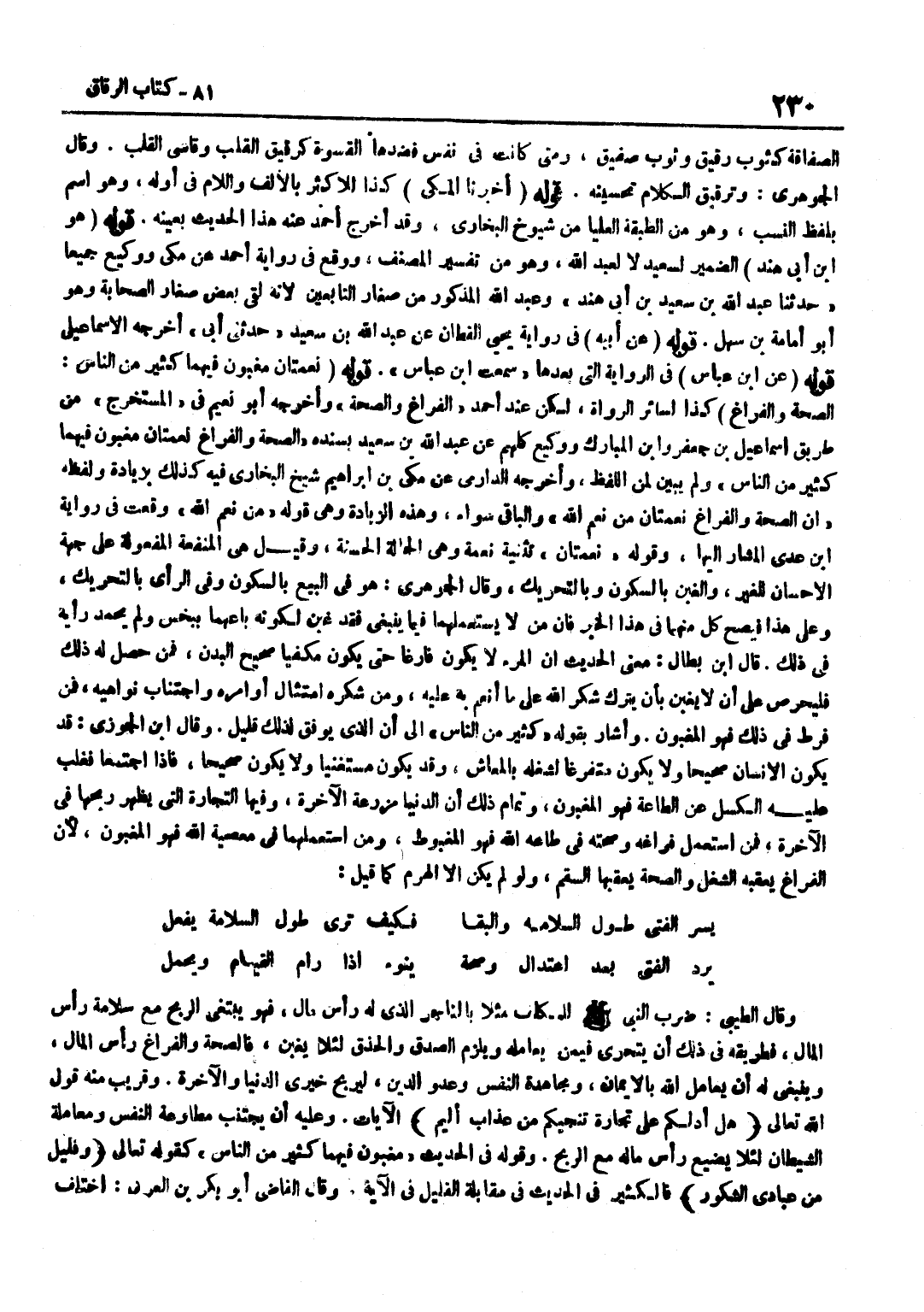[6412] قَوْلُهُ أَخْبَرَنَا الْمَكِّيُّ كَذَا لِلْأَكْثَرِ بِالْأَلِفِ وَاللَّامِ فِي أَوَّلِهِ وَهُوَ اسْمٌ بِلَفْظِ النَّسَبِ وَهُوَ مِنَ الطَّبَقَةِ الْعُلْيَا مِنْ شُيُوخِ الْبُخَارِيِّ وَقَدْ أَخْرَجَ أَحْمَدُ عَنْهُ هَذَا الْحَدِيثَ بِعَيْنِهِ قَوْلُهُ هُوَ بن أَبِي هِنْدٍ الضَّمِيرُ لِسَعِيدٍ لَا لِعَبْدِ اللَّهِ وَهُوَ مِنْ تَفْسِيرِ الْمُصَنِّفِ وَوَقَعَ فِي رِوَايَةِ أَحْمَدَ عَنْ مَكِّيٍّ وَوَكِيعٍ جَمِيعًا حَدَّثَنَا عَبْدِ اللَّهِ بْنِ سَعِيدِ بْنِ أَبِي هِنْدٍ وَعَبْدُ اللَّهِ الْمَذْكُورُ مِنْ صِغَارِ التَّابِعِينَ لِأَنَّهُ لَقِيَ بَعْضَ صِغَارِ الصَّحَابَةِ وَهُوَ أَبُو أُمَامَةَ بْنُ سَهْلٍ قَوْلُهُ عَنْ أَبِيهِ فِي رِوَايَةِ يَحْيَى الْقَطَّانِ عَنْ عَبْدِ اللَّهِ بْنِ سَعِيدٍ حَدَّثَنِي أبي أخرجه الْإِسْمَاعِيلِيّ قَوْله عَن بن عَبَّاس فِي الرِّوَايَة الَّتِي بعْدهَا سَمِعت بن عَبَّاسٍ قَوْلُهُ نِعْمَتَانِ مَغْبُونٌ فِيهِمَا كَثِيرٌ مِنَ النَّاسِ الصِّحَّةُ وَالْفَرَاغُ كَذَا لِسَائِرِ الرُّوَاةِ لَكِنْ عِنْدَ أَحْمَدَ الْفَرَاغُ وَالصِّحَّةُ وَأَخْرَجَهُ أَبُو نُعَيْمٍ فِي الْمُسْتَخْرَجِ مِنْ طَرِيقِ إِسْمَاعِيلَ بْنِ جَعْفَرٍ وبن الْمُبَارَكِ وَوَكِيعٍ كُلُّهُمْ عَنْ عَبْدِ اللَّهِ بْنِ سَعِيدٍ بِسَنَدِهِ الصِّحَّةُ وَالْفَرَاغُ نِعْمَتَانِ مَغْبُونٌ فِيهِمَا كَثِيرٌ مِنَ النَّاسِ وَلَمْ يُبَيِّنْ لِمَنِ اللَّفْظُ وَأَخْرَجَهُ الدَّارِمِيُّ عَنْ مَكِّيِّ بْنِ إِبْرَاهِيمَ شَيْخِ الْبُخَارِيِّ فِيهِ كَذَلِكَ بِزِيَادَةٍ وَلَفْظُهُ إِنَّ الصِّحَّةَ وَالْفَرَاغَ نِعْمَتَانِ مِنْ نِعَمِ اللَّهِ وَالْبَاقِي سَوَاءٌ وَهَذِهِ الزِّيَادَةُ وَهِيَ قَوْلُهُ مِنْ نِعَمِ اللَّهِ وَقعت فِي رِوَايَة بن عَدِيٍّ الْمُشَارِ إِلَيْهَا وَقَوْلُهُ نِعْمَتَانِ تَثْنِيَةُ نِعْمَةٍ وَهِيَ الْحَالَةُ الْحَسَنَةُ وَقِيلَ هِيَ الْمَنْفَعَةُ الْمَفْعُولَةُ عَلَى جِهَةِ الْإِحْسَانِ لِلْغَيْرِ وَالْغَبَنُ بِالسُّكُونِ وَبِالتَّحْرِيكِ وَقَالَ الْجَوْهَرِيُّ هُوَ فِي الْبَيْعِ بِالسُّكُونِ وَفِي الرَّأْيِ بِالتَّحْرِيكِ وَعَلَى هَذَا فَيَصِحُّ كُلٌّ مِنْهُمَا فِي هَذَا الْخَبَرِ فَإِنَّ مَنْ لَا يَسْتَعْمِلُهُمَا فِيمَا يَنْبَغِي فَقَدْ غَبَنَ لِكَوْنِهِ بَاعَهُمَا بِبَخْسٍ وَلم يحمد رَأْيه فِي ذَلِك قَالَ بن بَطَّالٍ مَعْنَى الْحَدِيثِ أَنَّ الْمَرْءَ لَا يَكُونُ فَارِغًا حَتَّى يَكُونَ مَكْفِيًّا صَحِيحَ الْبَدَنِ فَمَنْ حَصَلَ لَهُ ذَلِكَ فَلْيَحْرِصْ عَلَى أَنْ لَا يَغْبِنَ بِأَنْ يَتْرُكَ شُكْرَ اللَّهِ عَلَى مَا أَنْعَمَ بِهِ عَلَيْهِ وَمِنْ شُكْرِهِ امْتِثَالُ أَوَامِرِهِ وَاجْتِنَابُ نَوَاهِيهِ فَمَنْ فَرَّطَ فِي ذَلِكَ فَهُوَ الْمَغْبُونُ وَأَشَارَ بِقَوْلِهِ كَثِيرٌ مِنَ النَّاسِ إِلَى ان الَّذِي يوفق لذَلِك قَلِيل وَقَالَ بن الْجَوْزِيِّ قَدْ يَكُونُ الْإِنْسَانُ صَحِيحًا وَلَا يَكُونُ مُتَفَرِّغًا لِشُغْلِهِ بِالْمَعَاشِ وَقَدْ يَكُونُ مُسْتَغْنِيًا وَلَا يَكُونُ صَحِيحًا فَإِذَا اجْتَمَعَا فَغَلَبَ عَلَيْهِ الْكَسَلُ عَنِ الطَّاعَةِ فَهُوَ الْمَغْبُونُ وَتَمَامُ ذَلِكَ أَنَّ الدُّنْيَا مَزْرَعَةُ الْآخِرَةِ وَفِيهَا التِّجَارَةُ الَّتِي يَظْهَرُ رِبْحُهَا فِي الْآخِرَةِ فَمَنِ اسْتَعْمَلَ فَرَاغَهُ وَصِحَّتَهُ فِي طَاعَةِ اللَّهِ فَهُوَ الْمَغْبُوطُ وَمَنِ اسْتَعْمَلَهُمَا فِي مَعْصِيَةِ اللَّهِ فَهُوَ الْمَغْبُونُ لِأَنَّ الْفَرَاغَ يَعْقُبُهُ الشُّغْلُ وَالصِّحَّةُ يَعْقُبُهَا السَّقَمُ وَلَوْ لَمْ يَكُنْ إِلَّا الْهَرَمُ كَمَا قِيلَ يَسُرُّ الْفَتَى طُولُ السَّلَامَةِ وَالْبَقَا فَكَيْفَ تَرَى طُولَ السَّلَامَةِ يَفْعَلُ 