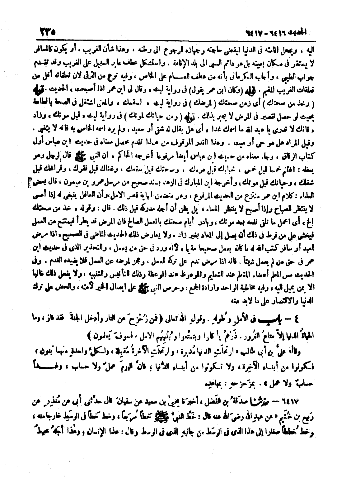 إِلَيْهِ وَيَجْعَلُ إِقَامَتَهُ فِي الدُّنْيَا لِيَقْضِيَ حَاجَتَهُ وَجِهَازَهُ لِلرُّجُوعِ إِلَى وَطَنِهِ وَهَذَا شَأْنُ الْغَرِيبِ أَوْ يَكُونُ كَالْمُسَافِرِ لَا يَسْتَقِرُّ فِي مَكَانٍ بِعَيْنِهِ بَلْ هُوَ دَائِمُ السَّيْرِ إِلَى بَلَدِ الْإِقَامَةِ وَاسْتَشْكَلَ عَطْفُ عَابِرِ السَّبِيلِ عَلَى الْغَرِيبِ وَقَدْ تَقَدَّمَ جَوَابُ الطِّيبِيِّ وَأَجَابَ الْكِرْمَانِيُّ بِأَنَّهُ مِنْ عَطْفِ الْعَامِّ عَلَى الْخَاصِّ وَفِيهِ نَوْعٌ مِنَ التَّرَقِّي لِأَنَّ تَعَلُّقَاتِهِ أَقَلُّ مِنْ تَعَلُّقَاتِ الْغَرِيب الْمُقِيم قَوْله وَكَانَ بن عُمَرَ يَقُولُ فِي رِوَايَةِ لَيْثٍ وَقَالَ لِي بن عُمَرَ إِذَا أَصْبَحْتَ الْحَدِيثَ قَوْلُهُ وَخُذْ مِنْ صِحَّتِكَ أَيْ زَمَنِ صِحَّتِكَ لِمَرَضِك فِي رِوَايَةِ لَيْثٍ لِسَقَمِكَ وَالْمَعْنَى اشْتَغِلْ فِي الصِّحَّةِ بِالطَّاعَةِ بِحَيْثُ لَوْ حَصَلَ تَقْصِيرٌ فِي الْمَرَضِ لَا يُجْبَرُ بِذَلِكَ قَوْلُهُ وَمِنْ حَيَاتِكَ لِمَوْتِكَ فِي رِوَايَةِ لَيْثٍ قَبْلَ مَوْتِكَ وَزَادَ فَإِنَّكَ لَا تَدْرِي يَا عَبْدَ اللَّهِ مَا اسْمُكَ غَدًا أَيْ هَلْ يُقَالُ لَهُ شَقِيٌّ أَوْ سَعِيدٌ وَلَمْ يُرِدِ اسْمَهُ الْخَاصَّ بِهِ فَإِنَّهُ لَا يَتَغَيَّرُ وَقِيلَ الْمُرَادُ هَلْ هُوَ حَيٌّ أَوْ مَيِّتٌ وَهَذَا الْقَدْرُ الْمَوْقُوفُ مِنْ هَذَا تَقَدَّمَ مُحَصل مَعْنَاهُ فِي حَدِيث بن عَبَّاسٍ أَوَّلَ كِتَابِ الرِّقَاقِ وَجَاءَ مَعْنَاهُ مِنْ حَدِيث بن عَبَّاسٍ أَيْضًا مَرْفُوعًا أَخْرَجَهُ الْحَاكِمُ أَنَّ النَّبِيَّ صَلَّى اللَّهُ عَلَيْهِ وَسَلَّمَ قَالَ لِرَجُلٍ وَهُوَ يَعِظُهُ اغْتَنِمْ خَمْسًا قَبْلَ خَمْسٍ شَبَابَكَ قَبْلَ هَرَمِكَ وَصِحَّتِكَ قَبْلَ سَقَمِكَ وَغِنَاكَ قَبْلَ فَقْرِكَ وَفَرَاغِكَ قَبْلَ شُغْلِكَ وَحَيَاتِكَ قَبْلَ مَوْتِكَ وَأَخْرَجَهُ بن الْمُبَارَكِ فِي الزُّهْدِ بِسَنَدٍ صَحِيحٍ مِنْ مُرْسَلِ عَمْرِو بْنِ مَيْمُونٍ قَالَ بَعْضُ الْعُلَمَاءِ كَلَامُ بن عُمَرَ مُنْتَزَعٌ مِنَ الْحَدِيثِ الْمَرْفُوعِ وَهُوَ مُتَضَمِّنٌ لِنِهَايَةِ قِصَرِ الْأَمَلِ وَأَنَّ الْعَاقِلَ يَنْبَغِي لَهُ إِذَا أَمْسَى لَا يَنْتَظِرُ الصَّبَاحَ وَإِذَا أَصْبَحَ لَا يَنْتَظِرُ الْمَسَاءِ بَلْ يَظُنُّ أَنَّ أَجَلَهُ مُدْرِكُهُ قَبْلَ ذَلِكَ قَالَ وَقَوْلُهُ خُذْ مِنْ صِحَّتِكَ إِلَخْ أَيِ اعْمَلْ مَا تَلْقَى نَفْعَهُ بَعْدَ مَوْتِكَ وَبَادِرْ أَيَّامَ صِحَّتِكَ بِالْعَمَلِ الصَّالِحِ فَإِنَّ الْمَرَضَ قَدْ يَطْرَأُ فَيَمْتَنِعُ مِنَ الْعَمَلِ فَيُخْشَى عَلَى مَنْ فَرَّطَ فِي ذَلِكَ أَنْ يَصِلَ إِلَى الْمَعَادِ بِغَيْرِ زَادِ وَلَا يُعَارِضُ ذَلِكَ الْحَدِيثَ الْمَاضِيَ فِي الصَّحِيحِ إِذَا مَرِضَ الْعَبْدُ أَوْ سَافَرَ كَتَبَ اللَّهُ لَهُ مَا كَانَ يَعْمَلُ صَحِيحًا مُقِيمًا لِأَنَّهُ وَرَدَ فِي حَقِّ مَنْ يَعْمَلُ وَالتَّحْذِيرُ الَّذِي فِي حَدِيثِ بن عُمَرَ فِي حَقِّ مَنْ لَمْ يَعْمَلْ شَيْئًا فَإِنَّهُ إِذَا مَرِضَ نَدِمَ عَلَى تَرْكِهِ الْعَمَلَ وَعَجَزَ لِمَرَضِهِ عَنِ الْعَمَلِ فَلَا يُفِيدُهُ النَّدَمُ وَفِي الْحَدِيثِ مَسُّ الْمُعَلِّمِ أَعْضَاءَ الْمُتَعَلِّمِ عِنْدَ التَّعْلِيمِ وَالْمَوْعُوظِ عِنْدَ الْمَوْعِظَةِ وَذَلِكَ لِلتَّأْنِيسِ وَالتَّنْبِيهِ وَلَا يُفْعَلُ ذَلِكَ غَالِبًا إِلَّا بِمَنْ يَمِيلُ إِلَيْهِ وَفِيهِ مُخَاطَبَةُ الْوَاحِدِ وَإِرَادَةُ الْجَمْعِ وَحِرْصُ النَّبِيِّ صَلَّى اللَّهُ عَلَيْهِ وَسَلَّمَ عَلَى إِيصَالِ الْخَيْرِ لِأُمَّتِهِ وَالْحَضُّ عَلَى تَرْكِ الدُّنْيَا وَالِاقْتِصَارُ على مَا لَا بُد مِنْهُ