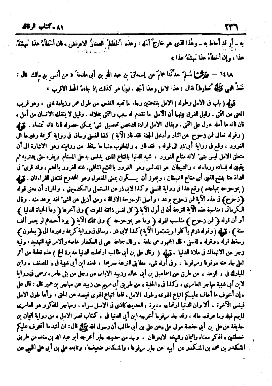 الْأَمَلُ بِفَتْحَتَيْنِ رَجَاءُ مَا تُحِبُّهُ النَّفْسُ مِنْ طُولِ عُمُرٍ وَزِيَادَةِ غِنًى وَهُوَ قَرِيبُ الْمَعْنَى مِنَ التَّمَنِّي وَقِيلَ الْفَرْقُ بَيْنَهُمَا أَنَّ الْأَمَلَ مَا تَقَدَّمَ لَهُ سَبَبٌ وَالتَّمَنِّي بِخِلَافِهِ وَقِيلَ لَا يَنْفَكُّ الْإِنْسَانُ مِنْ أَمَلٍ فَإِنْ فَاتَهُ مَا أَمَلَهُ عَوَّلَ عَلَى التَّمَنِّي وَيُقَالُ الْأَمَلُ إِرَادَةُ الشَّخْصِ تَحْصِيلَ شَيْءٍ يُمْكِنُ حُصُولُهُ فَإِذَا فَاتَهُ تَمَنَّاهُ قَوْلُهُ وَقَوْلُهُ تَعَالَى فَمَنْ زُحْزِحَ عَنِ النَّارِ وادخل الْجنَّة فقد فَازَ الْآيَةَ كَذَا لِلنَّسَفِيِّ وَسَاقَ فِي رِوَايَةِ كَرِيمَةَ وَغَيْرِهَا إِلَى الْغُرُورِ وَقَعَ فِي رِوَايَةِ أَبِي ذَر إِلَى قَوْله فقد فَازَ وَالْمَطْلُوبُ هُنَا مَا سَقَطَ مِنْ رِوَايَتِهِ وَهُوَ الْإِشَارَةُ إِلَى أَنَّ مُتَعَلِّقَ الْأَمَلِ لَيْسَ بِشَيْءٍ لِأَنَّهُ مَتَاعُ الْغُرُورِ شَبَّهَ الدُّنْيَا بِالْمَتَاعِ الَّذِي يُدَلَّسُ بِهِ عَلَى الْمُسْتَامِ وَيَغُرُّهُ حَتَّى يَشْتَرِيَهُ ثُمَّ يَتَبَيَّنَ لَهُ فَسَادُهُ وَرَدَاءَتُهُ وَالشَّيْطَانُ هُوَ المدلس وَهُوَ الْغرُور بِالْفَتْح الناشيء عَنْهُ الْغُرُورُ بِالضَّمِّ وَقَدْ قُرِئَ فِي الشَّاذِّ هُنَا بِفَتْحِ الْغَيْنِ أَيْ مَتَاعُ الشَّيْطَانِ وَيَجُوزُ أَنْ يَكُونَ بِمَعْنَى الْمَفْعُولِ وَهُوَ الْمَخْدُوعُ فَتَتَّفِقُ الْقِرَاءَتَانِ قَوْلُهُ بِمُزَحْزِحِهِ بِمُبَاعِدِهِ وَقَعَ هَذَا فِي رِوَايَةِ النَّسَفِيِّ وَكَذَا لِأَبِي ذَرٍّ عَنِ الْمُسْتَمْلِي وَالْكُشْمِيهَنِيِّ وَالْمُرَادُ أَنَّ مَعْنَى قَوْلِهِ زُحْزِحَ فِي هَذِهِ الْآيَةِ فَمَنْ زُحْزِحَ بِوَعْدٍ وَأَصْلُ الزَّحْزَحَةِ الْإِزَالَةُ وَمَنْ أُزِيلَ عَنِ الشَّيْءِ فَقَدْ بُوعِدَ مِنْهُ وَقَالَ الْكَرْمَانِيُّ مُنَاسَبَةُ هَذِهِ الْآيَةِ لِلتَّرْجَمَةِ أَنَّ فِي أَوَّلِ الْآيَةِ كُلُّ نَفْسٍ ذَائِقَةُ الْمَوْت وَفِي آخرهَا وَمَا الْحَيَاة الدُّنْيَا أَو أَن قَوْله فَمن زحزح مُنَاسِب لقَوْله وَمَا هُوَ بمزحزحه وَفِي تِلْكَ الْآيَةِ يَوَدُّ أَحَدُهُمْ لَوْ يُعَمَّرُ الف سنة قَوْله وَقَوله ذرهم يَأْكُلُوا ويتمتعوا الْآيَةَ كَذَا لِأَبِي ذَرٍّ وَسَاقَ فِي رِوَايَةِ كَرِيمَةَ وَغَيْرِهَا إِلَى يَعْلَمُونَ وَسَقَطَ قَوْلُهُ وَقَوْلُهُ لِلنَّسَفِيِّ قَالَ الْجُمْهُورُ هِيَ عَامَّةٌ وَقَالَ جَمَاعَةٌ هِيَ فِي الْكُفَّارِ خَاصَّةً وَالْأَمْرُ فِيهِ لِلتَّهْدِيدِ وَفِيهِ زَجْرٌ عَنْ الِانْهِمَاكِ فِي مَلَاذِّ الدُّنْيَا قَوْلُهُ وَقَالَ عَلِيُّ بْنُ أَبِي طَالِبٍ ارْتَحَلَتِ الدُّنْيَا مُدْبِرَةً إِلَخْ هَذِهِ قِطْعَةٌ مِنْ أَثَرٍ لِعَلِيٍّ جَاءَ عَنْهُ مَوْقُوفًا وَمَرْفُوعًا وَفِي أَوَّلِهِ شَيْء مُطَابق للتَّرْجَمَة صَرِيحًا فَعِنْدَ بن أبي شيبَة فِي المُصَنّف وبن الْمُبَارَكِ فِي الزُّهْدِ مِنْ طُرُقٍ عَنْ إِسْمَاعِيلَ بْنِ أَبِي خَالِدٍ وَزُبَيْدٍ الْأَيَامِيِّ عَنْ رَجُلٍ مِنْ بَنِي عَامِرٍ وَسُمِّيَ فِي رِوَايَةٍ لِابْنِ أَبِي شَيْبَةَ مُهَاجِرٌ الْعَامِرِيُّ وَكَذَا فِي الْحِلْيَةِ مِنْ طَرِيقِ أَبِي مَرْيَمَ عَنْ زُبَيْدٍ عَنْ مُهَاجِرِ بْنِ عُمَيْرٍ قَالَ قَالَ عَلِيٌّ إِنَّ أَخْوَفَ مَا أَخَافُ عَلَيْكُمُ اتِّبَاعُ الْهَوَى وَطُولُ الْأَمَلِ فَأَمَّا اتِّبَاعُ الْهَوَى فَيَصُدُّ عَنِ الْحَقِّ وَأَمَّا طُولُ الْأَمَلِ فَيُنْسِي الْآخِرَةَ أَلَا وَإِنَّ الدُّنْيَا ارْتَحَلَتْ مُدْبِرَةً الْحَدِيثَ كَالَّذِي فِي الْأَصْلِ سَوَاءً وَمُهَاجِرٌ الْمَذْكُورُ هُوَ الْعَامِرِيُّ الْمُبْهَمُ قَبْلَهُ وَمَا عَرِفَتْ حَالُهُ وَقَدْ جَاءَ مَرْفُوعًا أَخْرَجَهُ بن أَبِي الدُّنْيَا فِي كِتَابِ قِصَرِ الْأَمَل