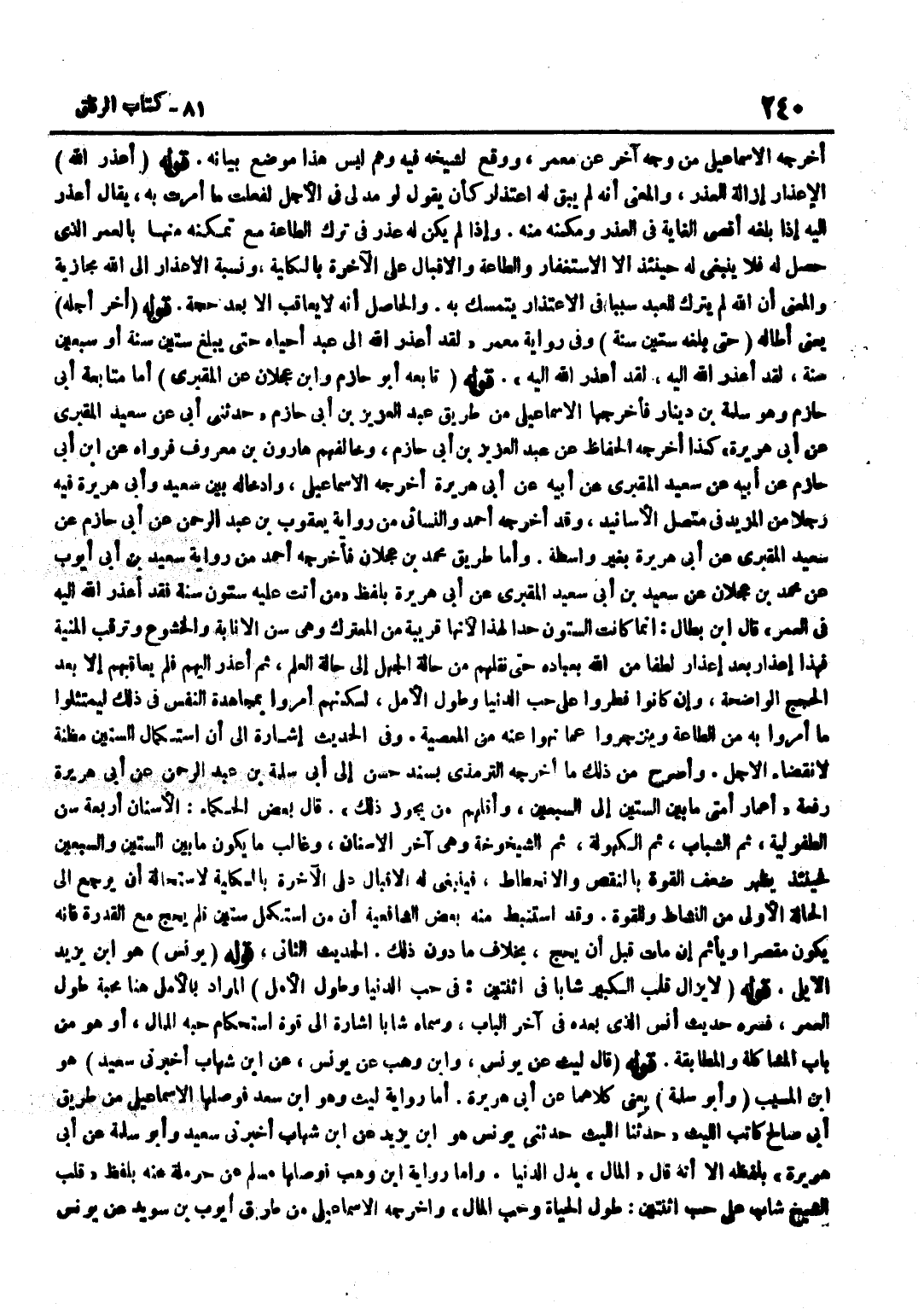 أَخْرَجَهُ الْإِسْمَاعِيلِيُّ مِنْ وَجْهٍ آخَرَ عَنْ مَعْمَرٍ وَوَقَعَ لِشَيْخِهِ فِيهِ وَهَمٌ لَيْسَ هَذَا مَوْضِعَ بَيَانِهِ قَوْلُهُ أَعْذَرَ اللَّهُ الْإِعْذَارُ إِزَالَةُ الْعُذْرِ وَالْمَعْنَى أَنَّهُ لَمْ يَبْقَ لَهُ اعْتِذَارٌ كَأَنْ يَقُولَ لَوْ مُدَّ لِي فِي الْأَجَلِ لَفَعَلْتُ مَا أُمِرْتُ بِهِ يُقَالُ أَعْذَرَ إِلَيْهِ إِذَا بَلَّغَهُ أَقْصَى الْغَايَةِ فِي الْعُذْرِ وَمَكَّنَهُ مِنْهُ وَإِذَا لَمْ يَكُنْ لَهُ عُذْرٌ فِي تَرْكِ الطَّاعَةِ مَعَ تَمَكُّنِهِ مِنْهَا بِالْعُمُرِ الَّذِي حَصَلَ لَهُ فَلَا يَنْبَغِي لَهُ حِينَئِذٍ إِلَّا الِاسْتِغْفَارُ وَالطَّاعَةُ وَالْإِقْبَالُ عَلَى الْآخِرَةِ بِالْكُلِّيَّةِ وَنِسْبَةُ الْإِعْذَارِ إِلَى اللَّهِ مَجَازِيَّةٌ وَالْمَعْنَى أَنَّ اللَّهَ لَمْ يَتْرُكْ لِلْعَبْدِ سَبَبًا فِي الِاعْتِذَارِ يَتَمَسَّكُ بِهِ وَالْحَاصِلُ أَنَّهُ لَا يُعَاقَبُ إِلَّا بَعْدَ حُجَّةٍ قَوْلُهُ أَخَّرَ أَجَلَهُ يَعْنِي أَطَالَهُ حَتَّى بَلَّغَهُ سِتِّينَ سَنَةً وَفِي رِوَايَةِ مَعْمَرٍ لَقَدْ أَعْذَرَ اللَّهُ إِلَى عَبْدٍ أَحْيَاهُ حَتَّى يَبْلُغَ سِتِّينَ سَنَةً أَوْ سَبْعِينَ سَنَةً لَقَدْ أَعْذَرَ اللَّهُ إِلَيْهِ لَقَدْ أَعْذَرَ اللَّهُ إِلَيْهِ قَوْلُهُ تَابَعَهُ أَبُو حَازِم وبن عَجْلَانَ عَنْ الْمَقْبُرِيِّ أَمَّا مُتَابَعَةُ أَبِي حَازِمٍ وَهُوَ سَلَمَةُ بْنُ دِينَارٍ فَأَخْرَجَهَا الْإِسْمَاعِيلِيُّ مِنْ طَرِيقِ عَبْدِ الْعَزِيزِ بْنِ أَبِي حَازِمٍ حَدَّثَنِي أبي عَن سعيدالمقبري عَنْ أَبِي هُرَيْرَةَ كَذَا أَخْرَجَهُ الْحُفَّاظُ عَنْ عَبْدِ الْعَزِيزِ بْنِ أَبِي حَازِمٍ وَخَالَفَهُمْ هَارُونُ بن مَعْرُوف فَرَوَاهُ عَن بن أبي حَازِم عَن أَبِيه عَن سعيدالمقبري عَنْ أَبِيهِ عَنْ أَبِي هُرَيْرَةَ أَخْرَجَهُ الْإِسْمَاعِيلِيُّ وَإِدْخَالُهُ بَيْنَ سَعِيدٍ وَأَبِي هُرَيْرَةَ فِيهِ رَجُلًا مِنَ الْمَزِيدِ فِي مُتَّصِلِ الْأَسَانِيدِ وَقَدْ أَخْرَجَهُ أَحْمَدُ وَالنَّسَائِيُّ مِنْ رِوَايَةِ يَعْقُوبَ بْنِ عَبْدِ الرَّحْمَنِ عَنْ أَبِي حَازِمٍ عَنْ سَعِيدٍ الْمَقْبُرِيِّ عَنْ أَبِي هُرَيْرَةَ بِغَيْرِ وَاسِطَةٍ وَأَمَّا طَرِيقُ مُحَمَّدِ بْنِ عَجْلَانَ فَأَخْرَجَهُ أَحْمَدُ مِنْ رِوَايَةِ سَعِيدِ بْنِ أَبِي أَيُّوبَ عَنْ مُحَمَّدِ بْنِ عجلَان عَن سعيد بن أبي سعيدالمقبري عَنْ أَبِي هُرَيْرَةَ بِلَفْظِ مَنْ أَتَتْ عَلَيْهِ سِتُّونَ سَنَةً فَقَدْ أَعْذَرَ اللَّهُ إِلَيْهِ فِي الْعُمر قَالَ بن بَطَّالٍ إِنَّمَا كَانَتِ السِّتُّونَ حَدًّا لِهَذَا لِأَنَّهَا قَرِيبَةٌ مِنَ الْمُعْتَرَكِ وَهِيَ سِنُّ الْإِنَابَةِ وَالْخُشُوعِ وَتَرَقُّبِ الْمَنِيَّةِ فَهَذَا إِعْذَارٌ بَعْدَ إِعْذَارٍ لُطْفًا مِنَ اللَّهِ بِعِبَادِهِ حَتَّى نَقَلَهُمْ مِنْ حَالَةِ الْجَهْلِ إِلَى حَالَةِ الْعِلْمِ ثُمَّ أَعْذَرَ إِلَيْهِمْ فَلَمْ يُعَاقِبْهُمْ إِلَّا بَعْدَ الْحُجَجِ الْوَاضِحَةِ وَإِنْ كَانُوا فُطِرُوا عَلَى حُبِّ الدُّنْيَا وَطُولِ الْأَمَلِ لكِنهمْ امروا بمجاهدة النَّفس فِي ذَلِك ليمتثلوا مَا أُمِرُوا بِهِ مِنَ الطَّاعَةِ وَيَنْزَجِرُوا عَمَّا نُهُوا عَنْهُ مِنَ الْمَعْصِيَةِ وَفِي الْحَدِيثِ إِشَارَةٌ إِلَى أَنَّ اسْتِكْمَالَ السِّتِّينَ مَظِنَّةٌ لِانْقِضَاءِ الْأَجَلِ وَأَصْرَحُ مِنْ ذَلِكَ مَا أَخْرَجَهُ التِّرْمِذِيُّ بِسَنَدٍ حَسَنٍ إِلَى أَبِي سَلَمَةَ بْنِ عَبْدِ الرَّحْمَنِ عَنْ أَبِي هُرَيْرَةَ رَفَعَهُ أَعْمَارُ أُمَّتِي مَا بَيْنَ السِّتِّينَ إِلَى السَّبْعِينَ وَأَقَلُّهُمْ مَنْ يَجُوزُ ذَلِكَ قَالَ بَعْضُ الْحُكَمَاءِ الْأَسْنَانُ أَرْبَعَةٌ سِنُّ الطُّفُولِيَّةِ ثُمَّ الشَّبَابِ ثُمَّ الْكُهُولَةِ ثُمَّ ال